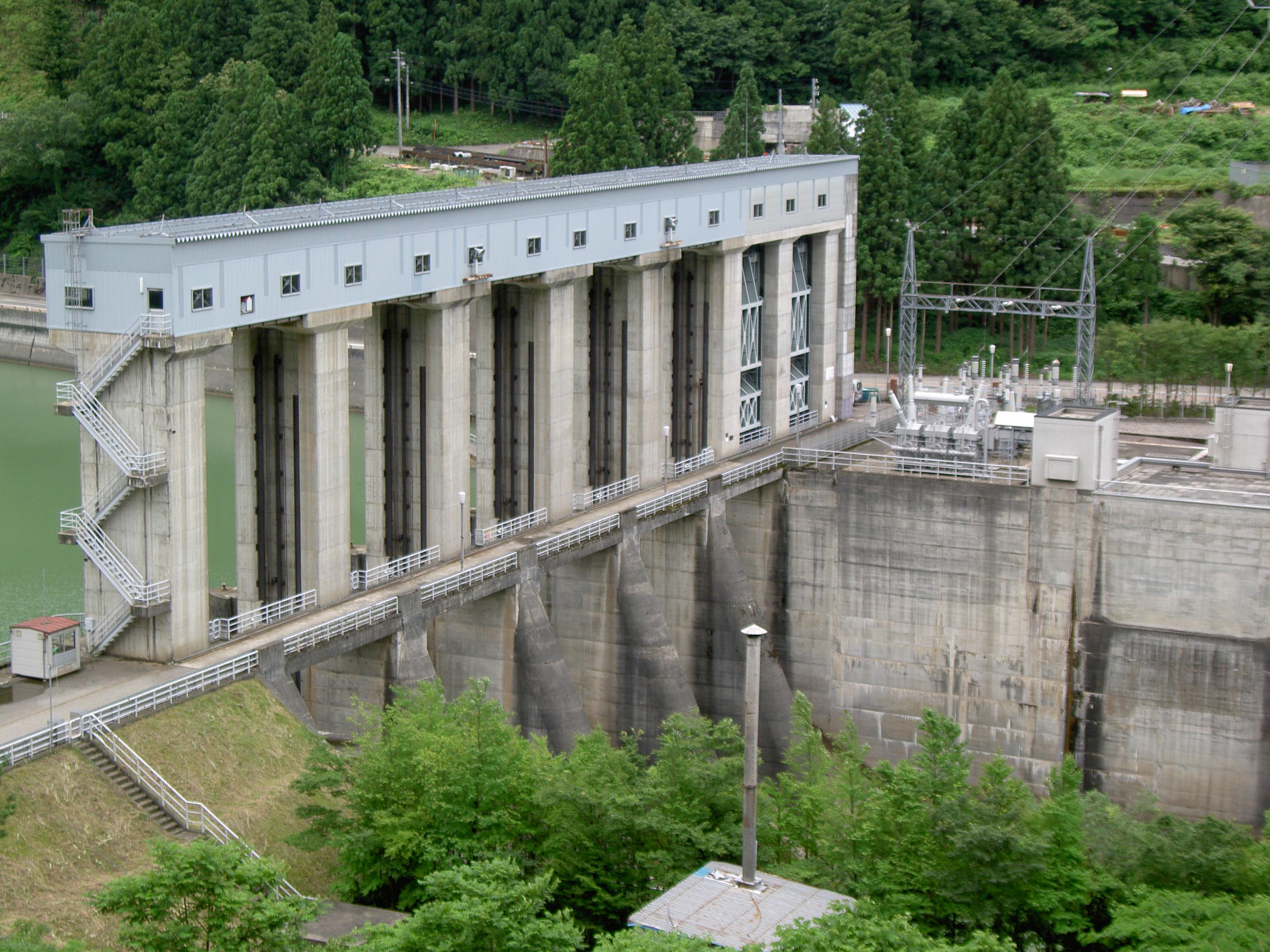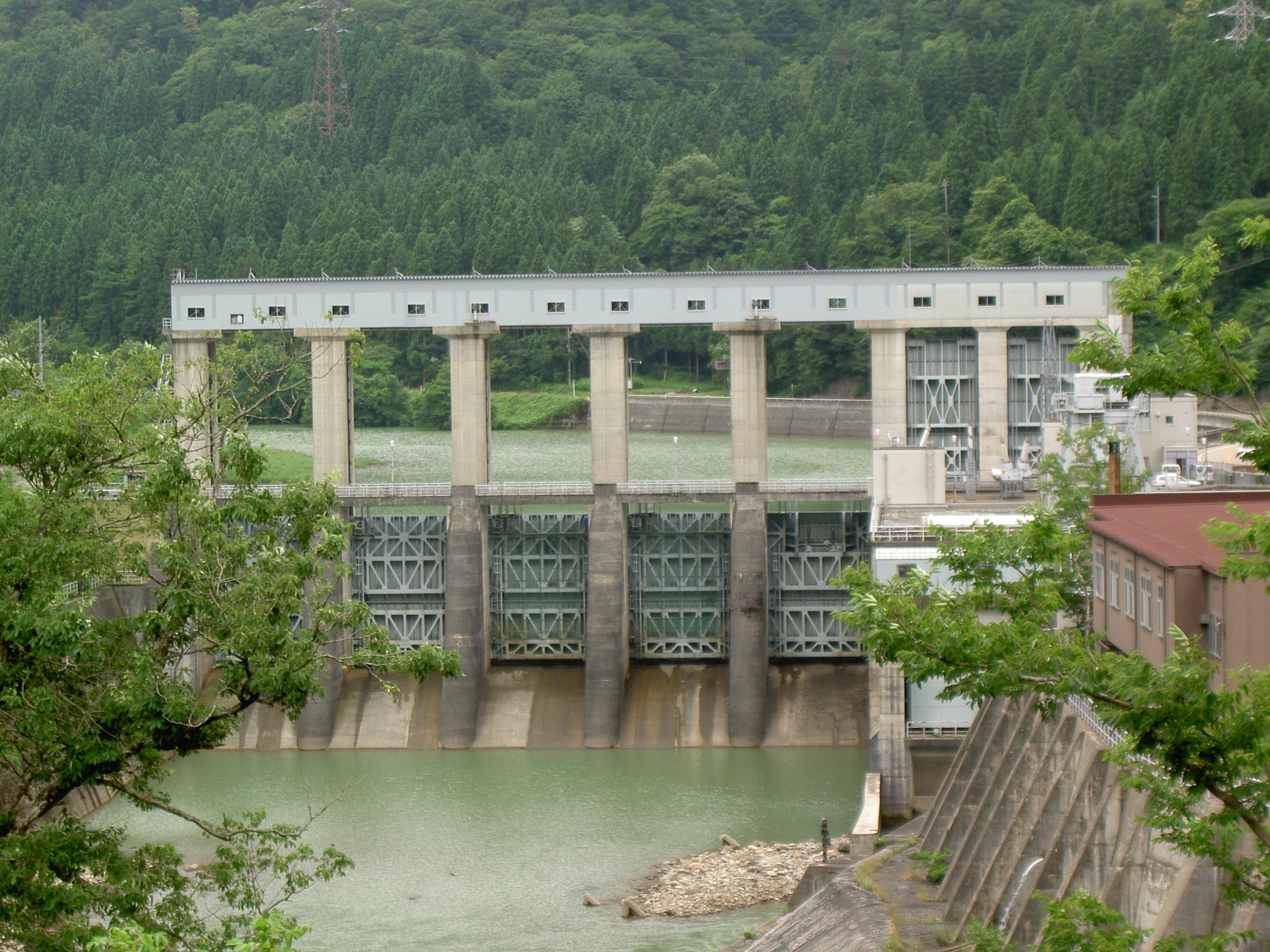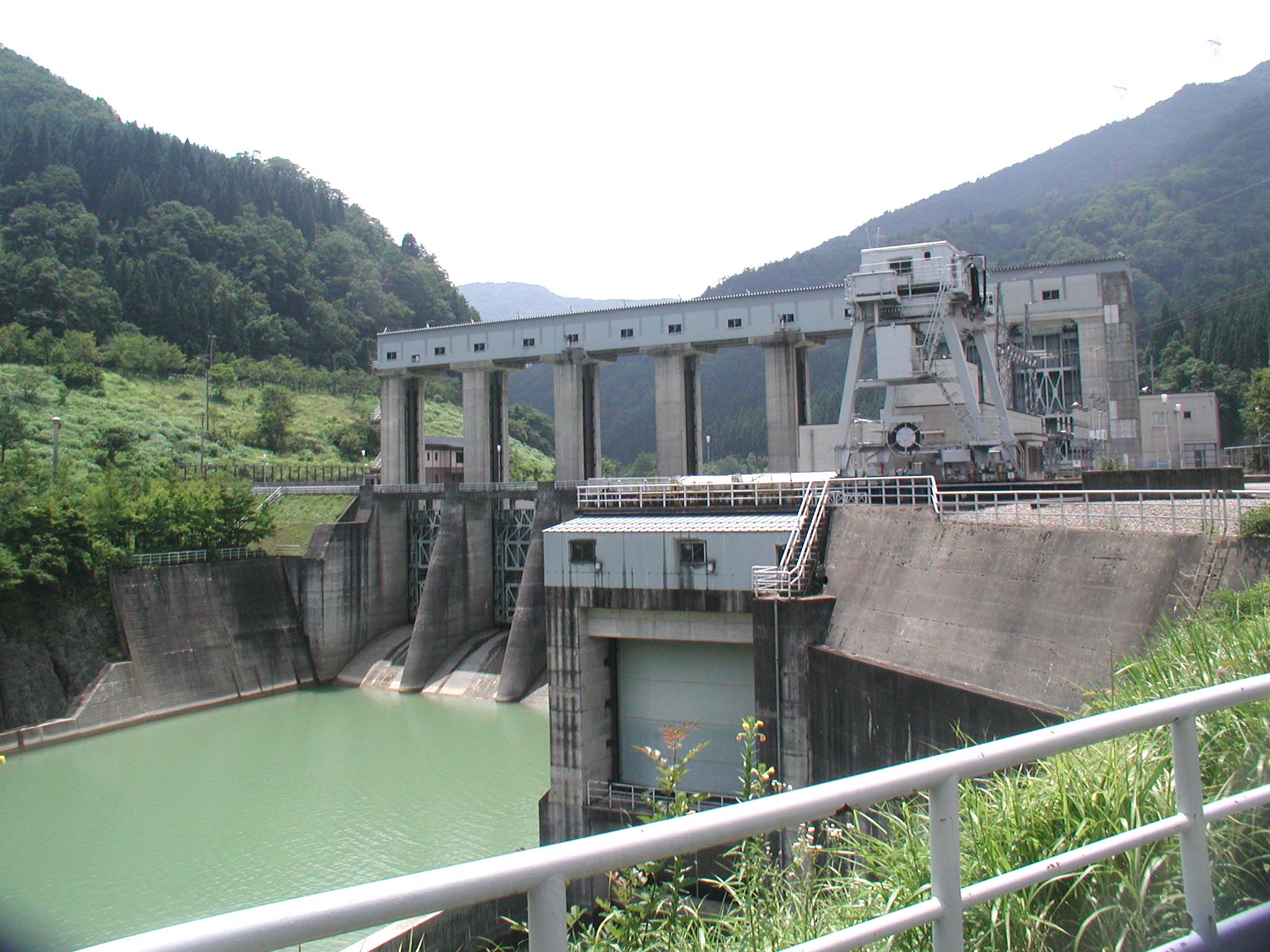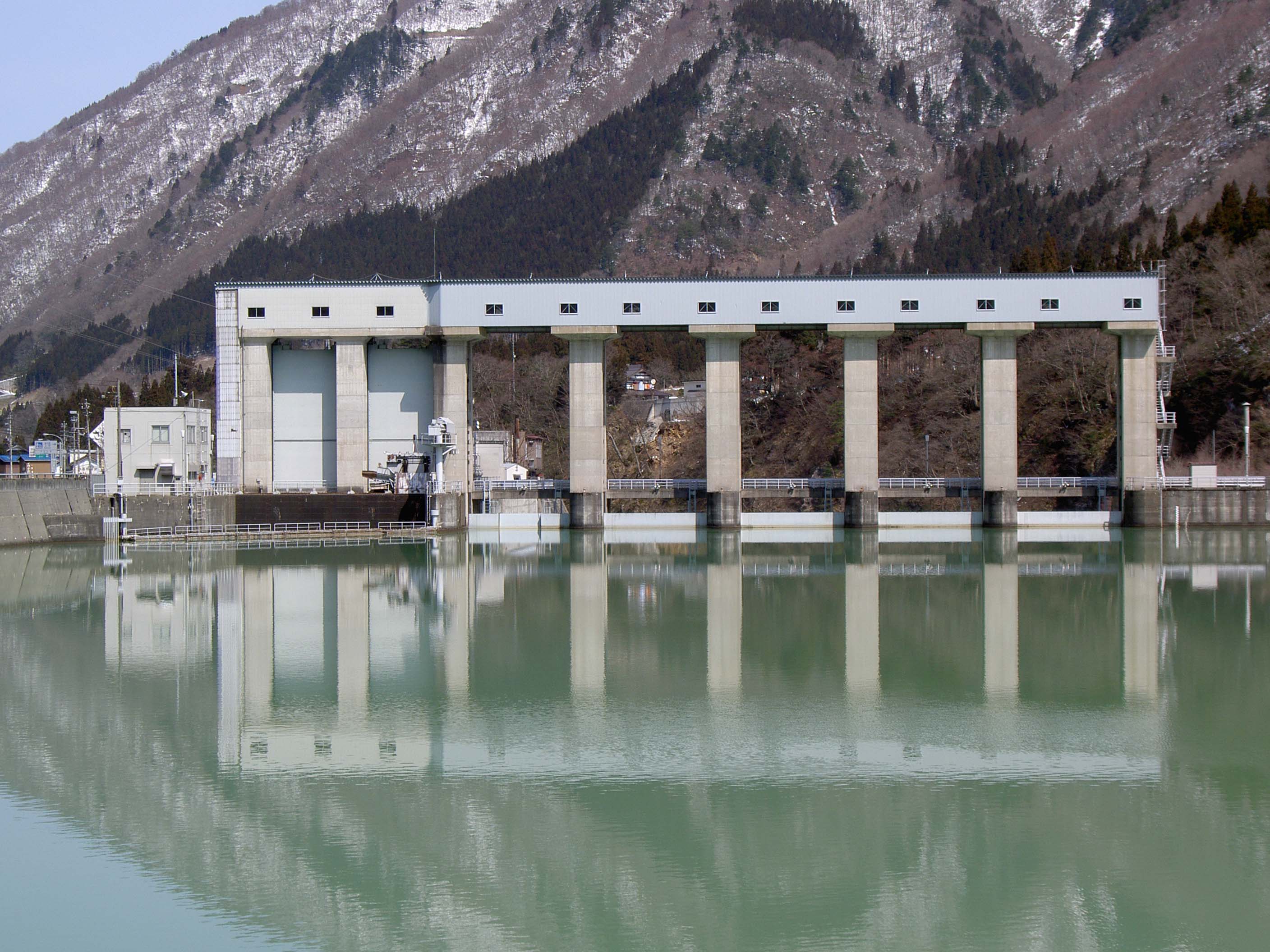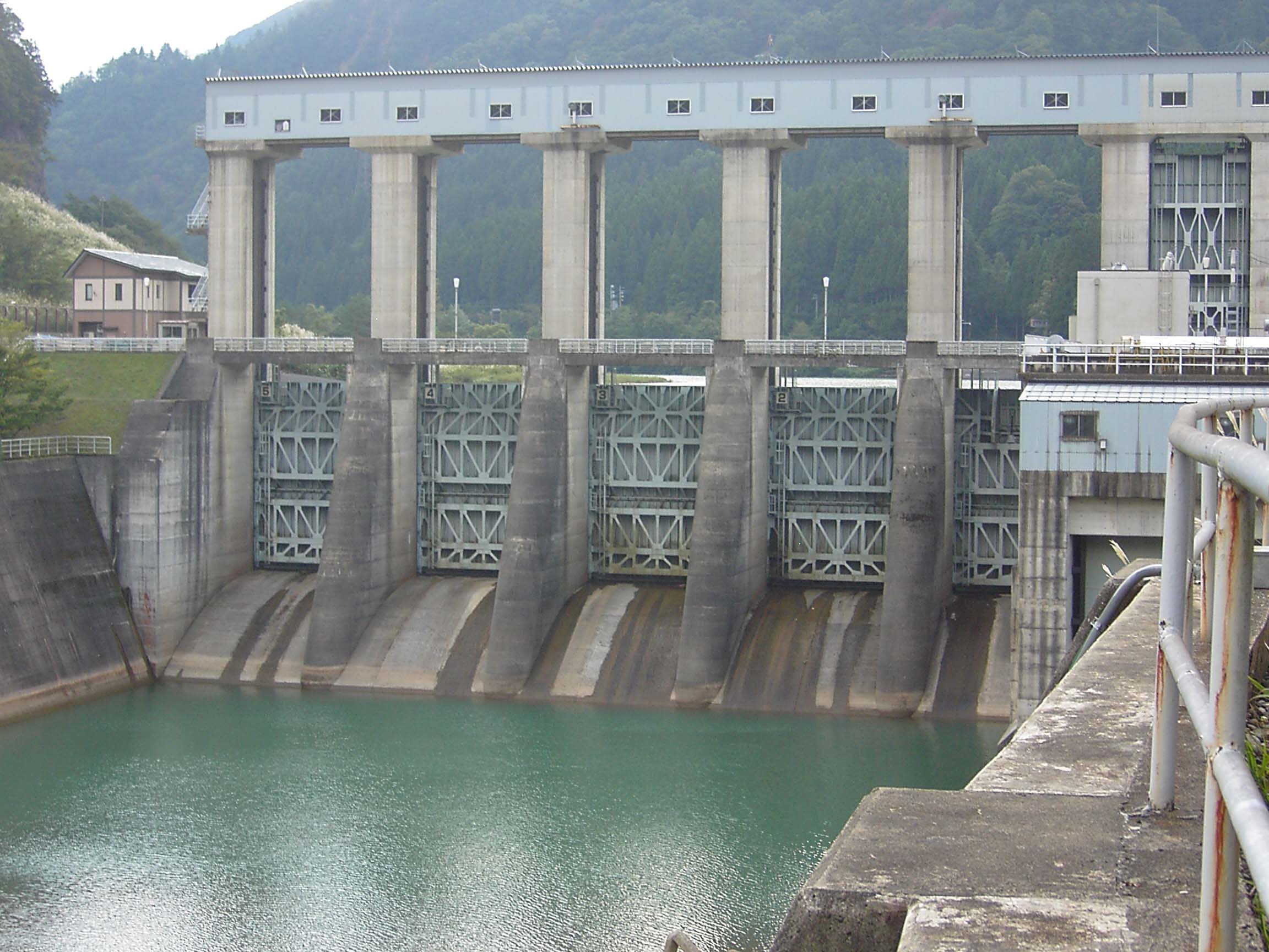 ダムとしては小規模なものですが、その5門のローラーゲートは巨大なもので小さな堤体にはそぐわないほどです。