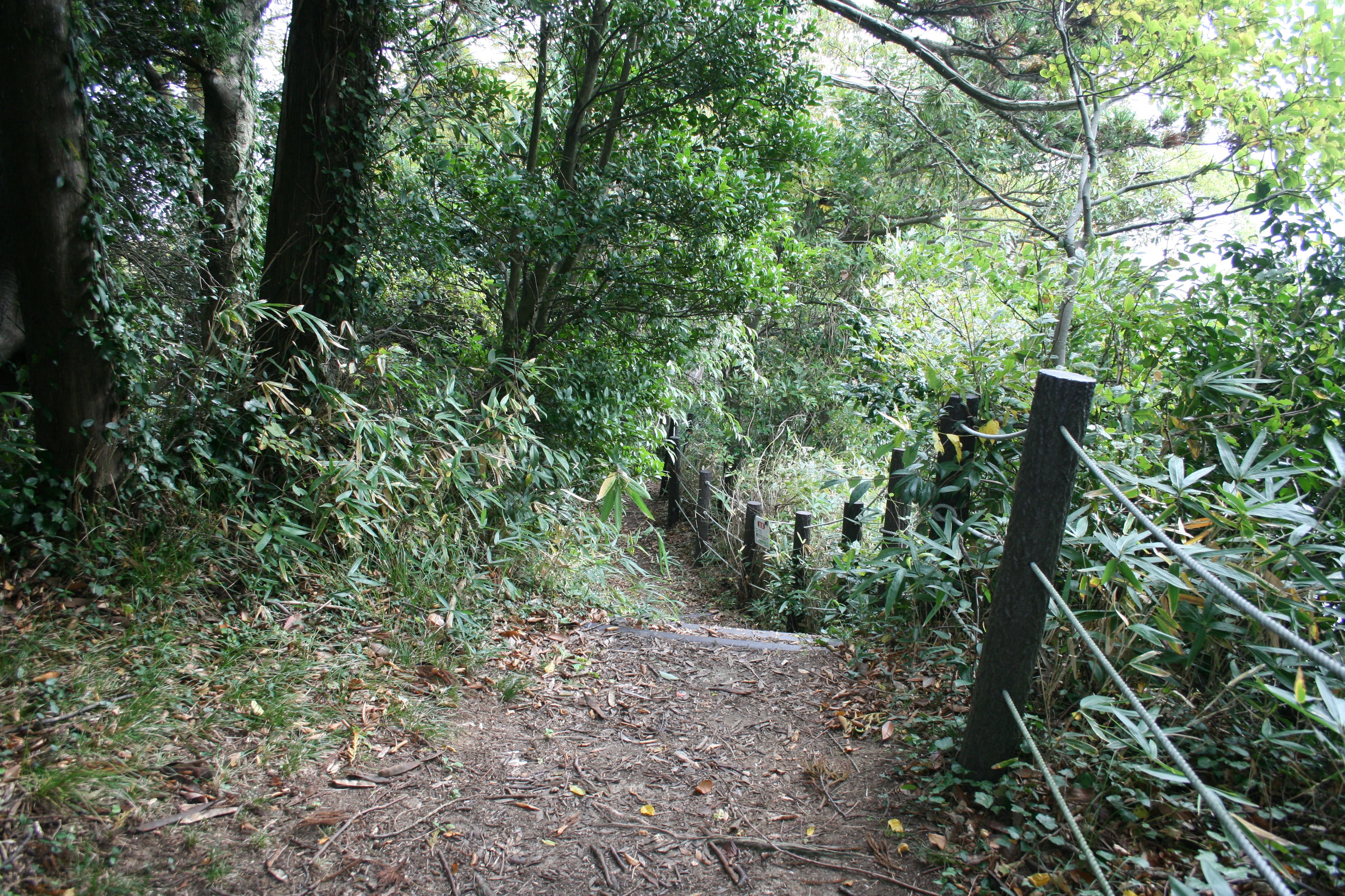 本丸には当時は櫓があったと考えられていて、海上の監視を行っていたと思われますが、現在は展望台がありやはり海上を望むことができます。この城の特徴として本丸が海上に突き出た崖上にあり、他の郭とはやや離れていて二の丸とつなぐ通路が極めて狭く急な土橋だけということです。本丸と二の丸の間に空堀らしい窪みがあります。