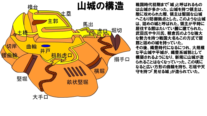 日本では、当初は純粋に軍事用として山地に建築されることが多かったのですが(これを山城という)、戦国時代中後期になると街道や河川などの交通の要衝に建設することも多くなり、そのため平地あるいは丘陵地に城が建設されるようになり(これを平城、平山城という)、軍事より政治、経済を志向した城が多く建設されるようになっていきます。