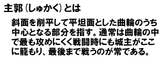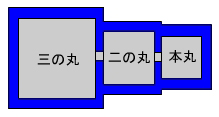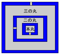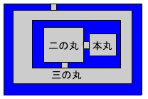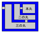 攻城戦の勝敗を決める要素の一つに、城郭の形状・構造が挙げられます。そのため築城に際して、なるべく防御側に有利になるよう、城郭の立地なども考慮して縄張が決められ、曲輪が配置されます。縄張の基本は主要な3つの曲輪、すなわち城郭の核となる本丸の周囲に、二の丸、三の丸を効果的に縦深配置することになります。もちろん城の規模によってはさらに多くの曲輪を持つ城も多く見られます。