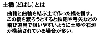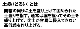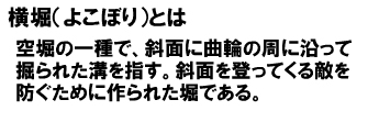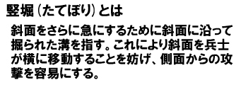 また、平坦な郭の周囲に沿って水平に掘削された堀を横堀(よこぼり)と呼びます。斜面に上下に掘削された堀を竪堀(たてぼり)と呼びます。横堀は下から斜面を登ってくる兵士を妨害するためのもので、堀切と堅堀は、山の斜面に沿って敵が移動するのを防ぐ目的で掘削された堀と考えれば良いでしょう。