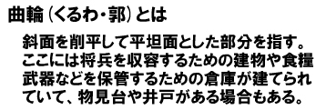城郭を区分する区画を、曲輪と呼びます。郭とも書きます。江戸時代以降は丸と呼ぶ場合が多いようです。曲輪は、防御陣地や将兵を収容する建造物、城主が居住する天守や御殿を建てる敷地となり、将兵の駐屯施設として城郭の最重要施設となります。中世の城郭は主に山城が多く、これらの城郭は一般に多数の小規模な曲輪をもつものが多く見られます。さらにそれらの曲輪を空堀や切岸が仕切るという形式になります。富山県内に見られる山城の大半がこれに該当します。これは地形の関係と労力の問題であまり広い曲輪が造れないことと、そもそもそのような広い曲輪が必要なかったとも考えられます。しかし近世の城郭になると平城が多く見られるようになり、その場合は少数の大規模な曲輪を持つものが登場します。この場合は、曲輪を石垣が囲み、その周囲を水堀で囲む形式の城が多く見られます。富山県内では富山城がこれに該当します。