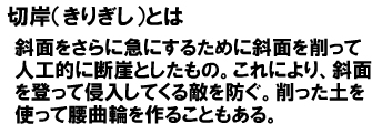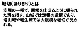 また堀も水堀ではなくて空堀がほとんどです。空堀にも尾根を仕切るように掘削された掘を堀切(ほりきり)と呼びます。