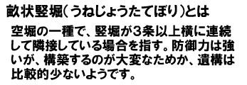 また複数の竪堀が横に連接している場合、連続竪堀と呼びます。3条以上の連続竪堀を畝状竪堀(うねじょうたてぼり)と呼ぶこともあります。曲輪を中心にして放射状に配置した多数の竪堀を放射状竪堀と呼びます。