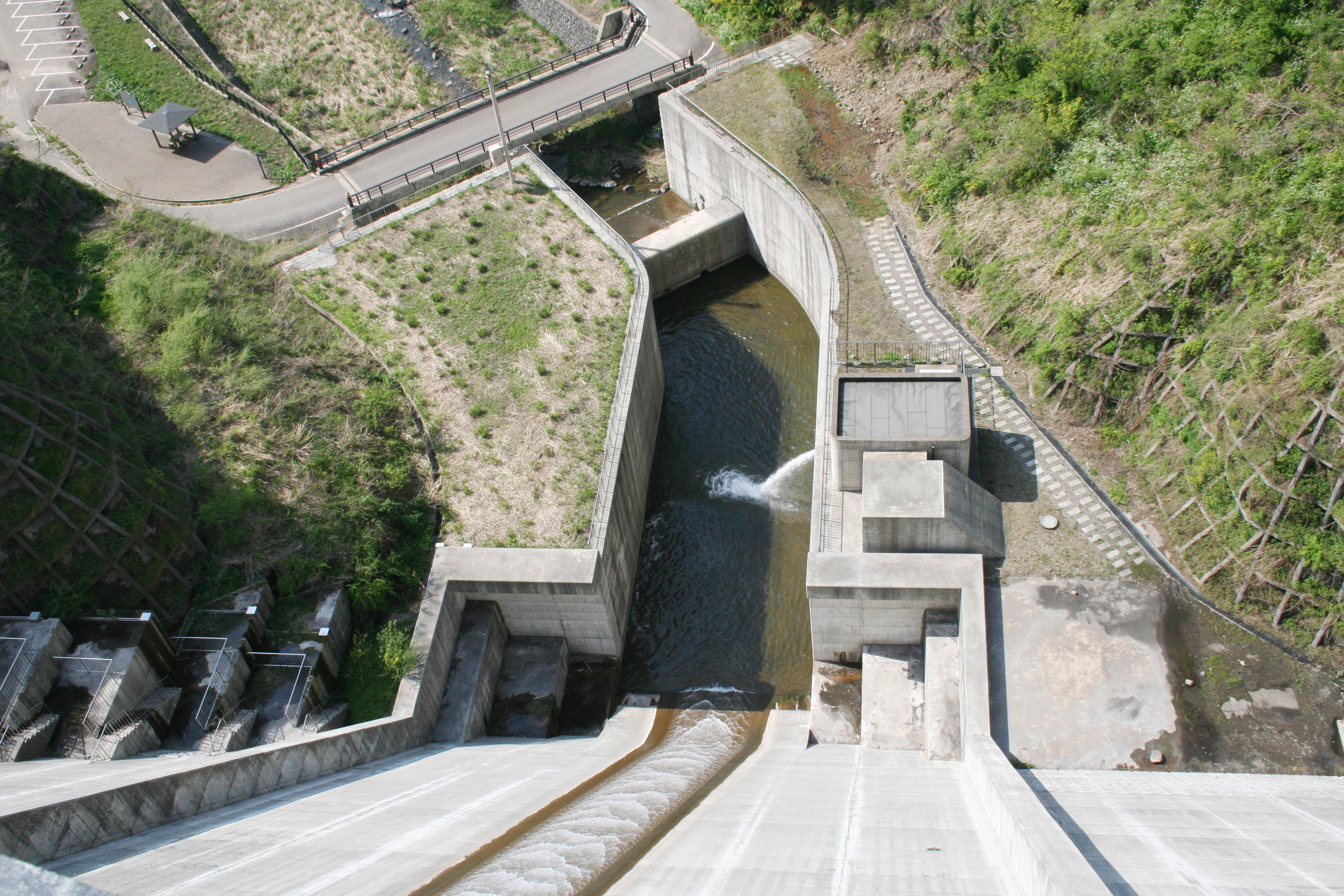 | 天端上から減勢工と副ダムを見る |
