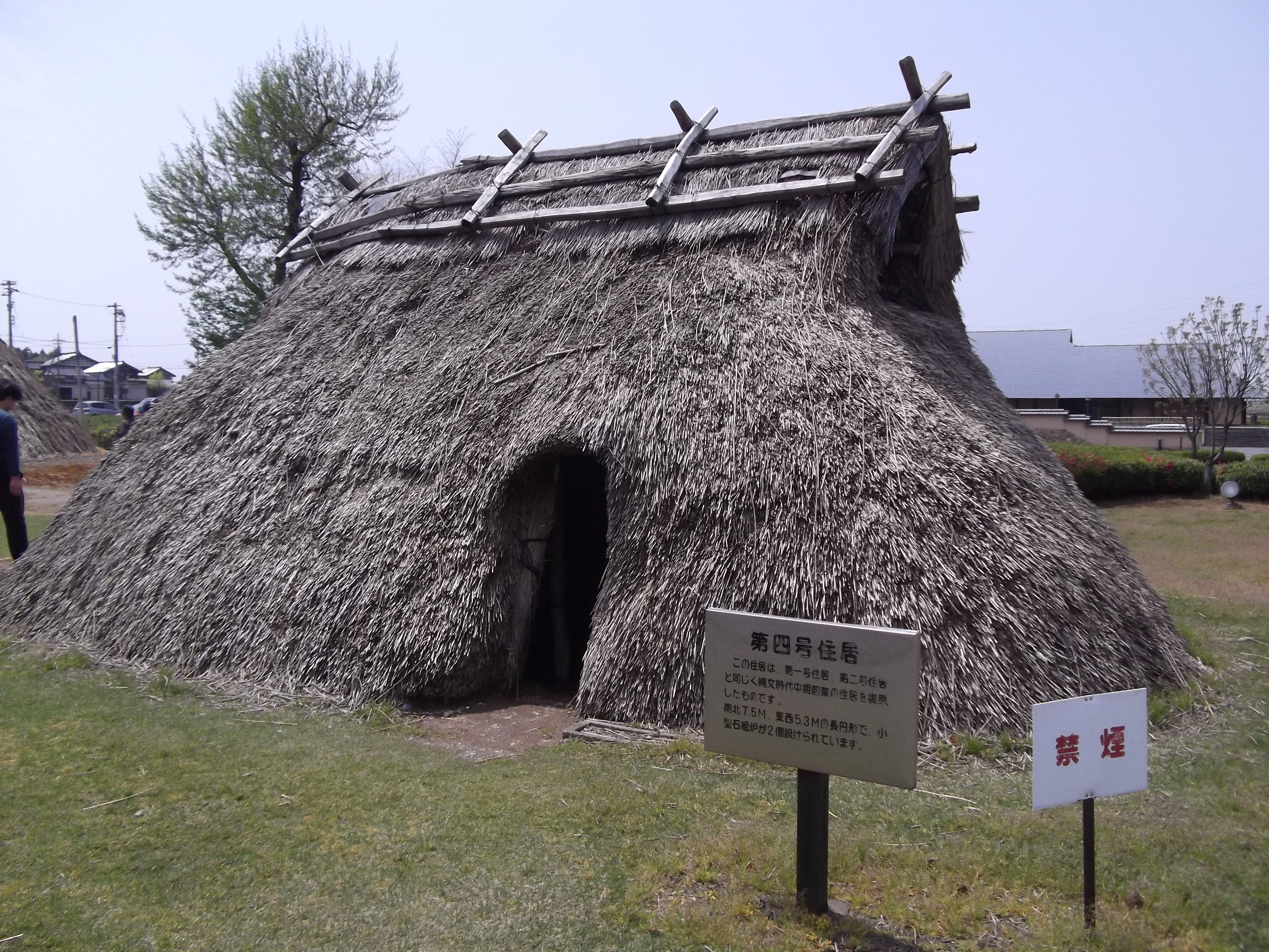 三棟の竪穴住居は、今からおおよそ4,500年~5,000年前の住居を復元したものです。復元のために集められた材料は、一束直径15センチ、長さ1メートルから1.5メートルのカヤ一万束を始め、ナラやカシ、栗などの柱材その他、縄代割りのマンサクやフジづるなどの補足材など、ざっと43立方メートルにもなり、一年がかりで集められました。