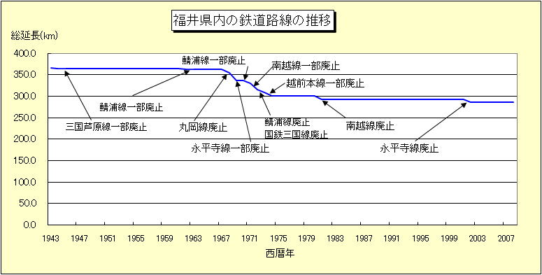 北陸3県はいずれも積雪地帯で人口が少なく、一方でモータリゼーションが最も進んでいる地域と考えられるので、鉄道事業者にとってはたいへん苦しい経営環境であると思われますが、下記のグラフからも読み取れるように福井県内の鉄道路線は相当数が維持されていると判断することができます。それぞれの経緯から考えても、下手をすると私鉄線の全線と越美北線が廃止される可能性が極めて高かったわけで、それらが維持されているのはたいへん意義ある事実でしょう。