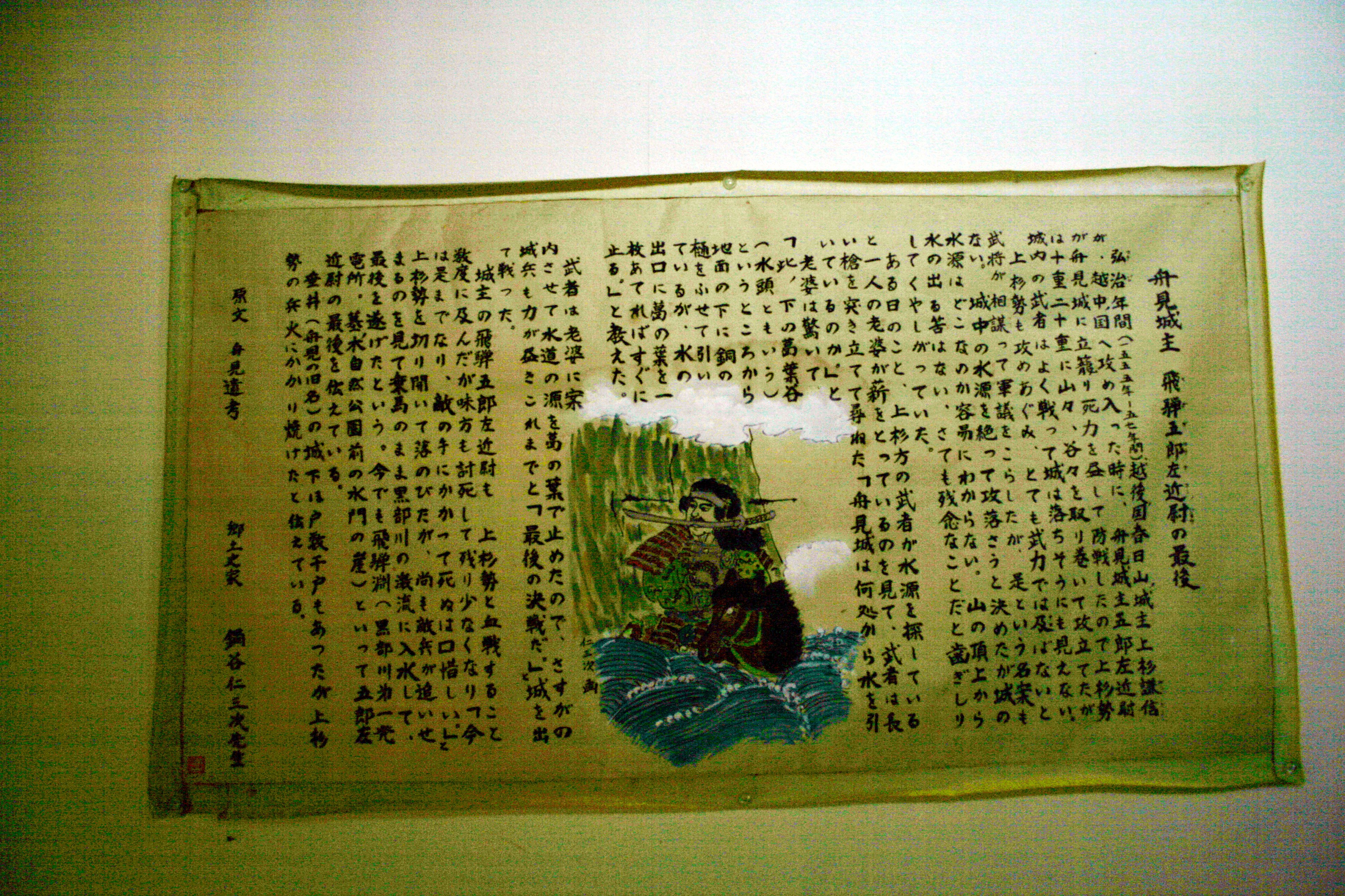 戦国期には弘治年間(1555~78)に上杉謙信が敵中へ攻め入ってきて、当時の舟見城主であった飛騨守左近尉が防戦したがついに破れて、黒部川断崖より飛び降り最期を遂げたといわれています。この際には上杉軍に城の水源を教えた老婆がいて、そのために水の手を断たれて城が落城したと言われています。