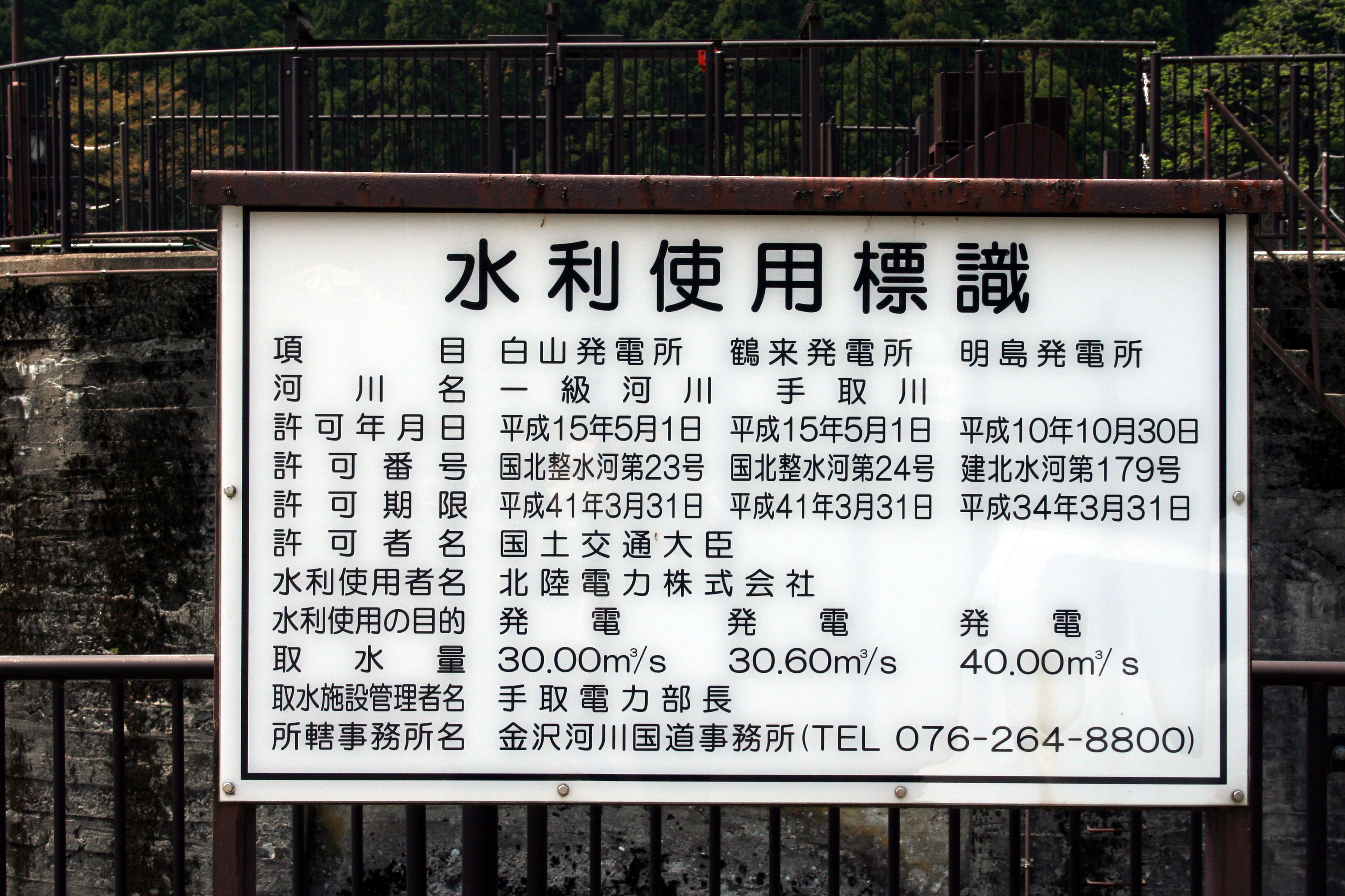 白山頭首工は、手取川水系手取川から取水する取水堰です。ここで取水された用水は、七ヶ用水を通り白山水力発電所、鶴木水力発電所、明島水力発電所へ送水され、最大出力7,570kwの発電を行っています。