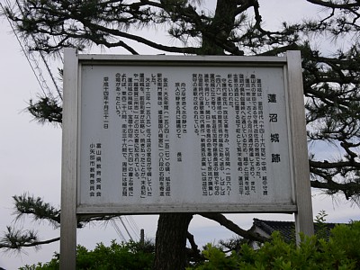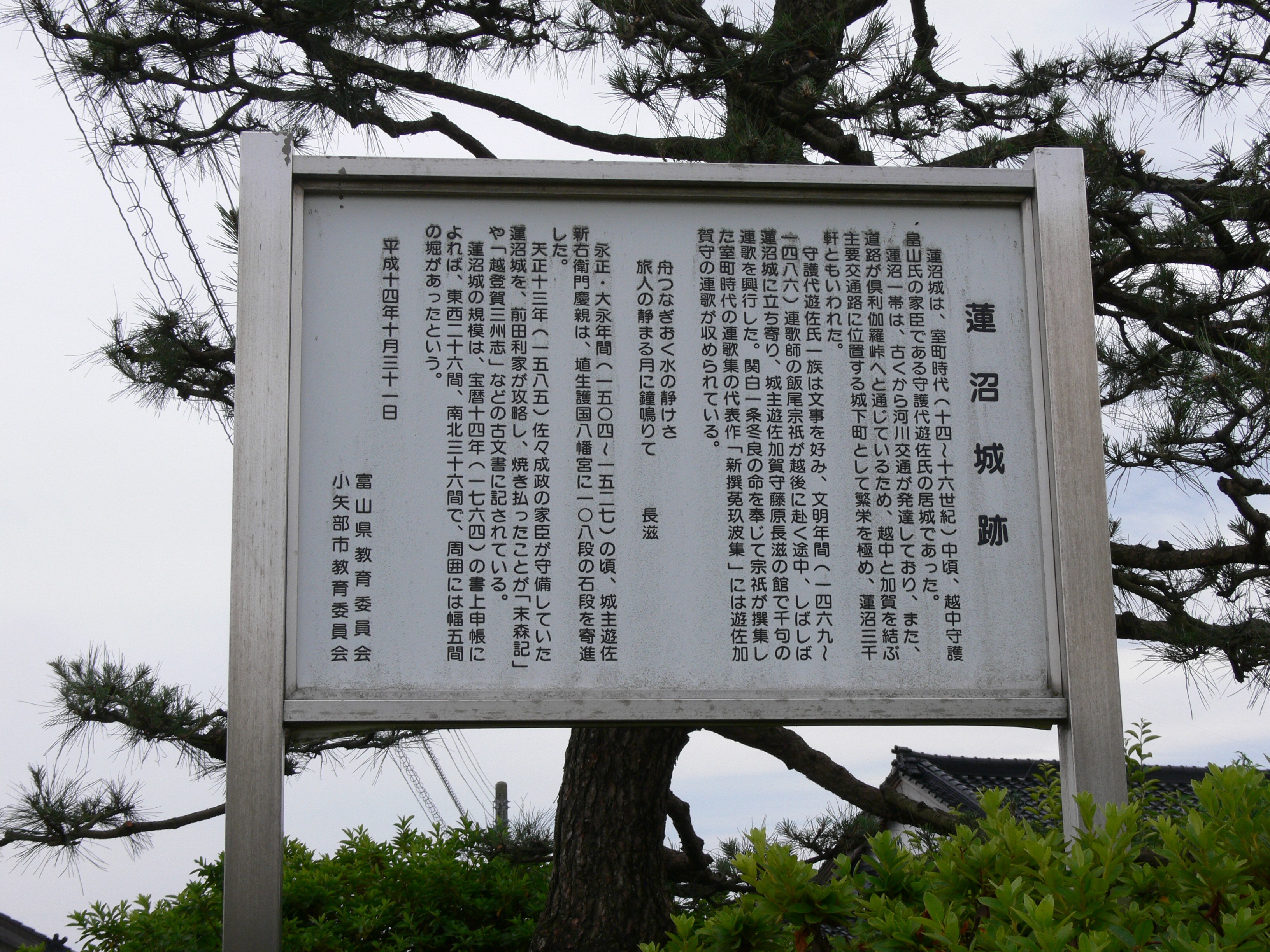 永禄12(1569年)年以降、上杉謙信により魚津の松倉城を追われ礪波郡の一向一揆勢力に合流していた椎名康胤がここを居城としていましたが、天正4年(1576年)9月頃には上杉謙信に攻められて蓮沼城は落城し、椎名康胤は陣没したと言われています。しかし実は康胤終焉の地については諸説あって今ひとつはっきりしません。