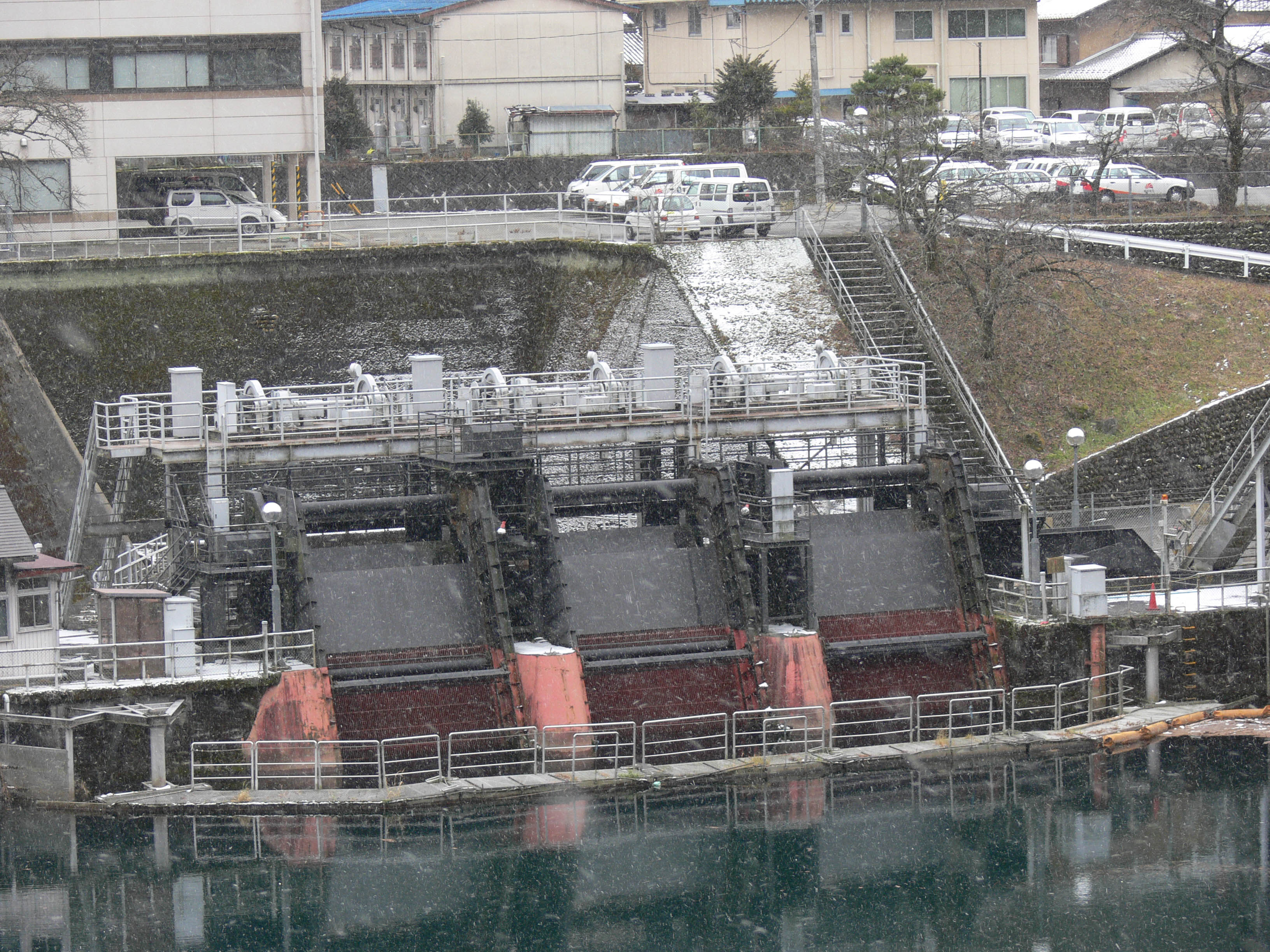 右岸から左岸側を見る 取水スクリーンと中部電力営業所