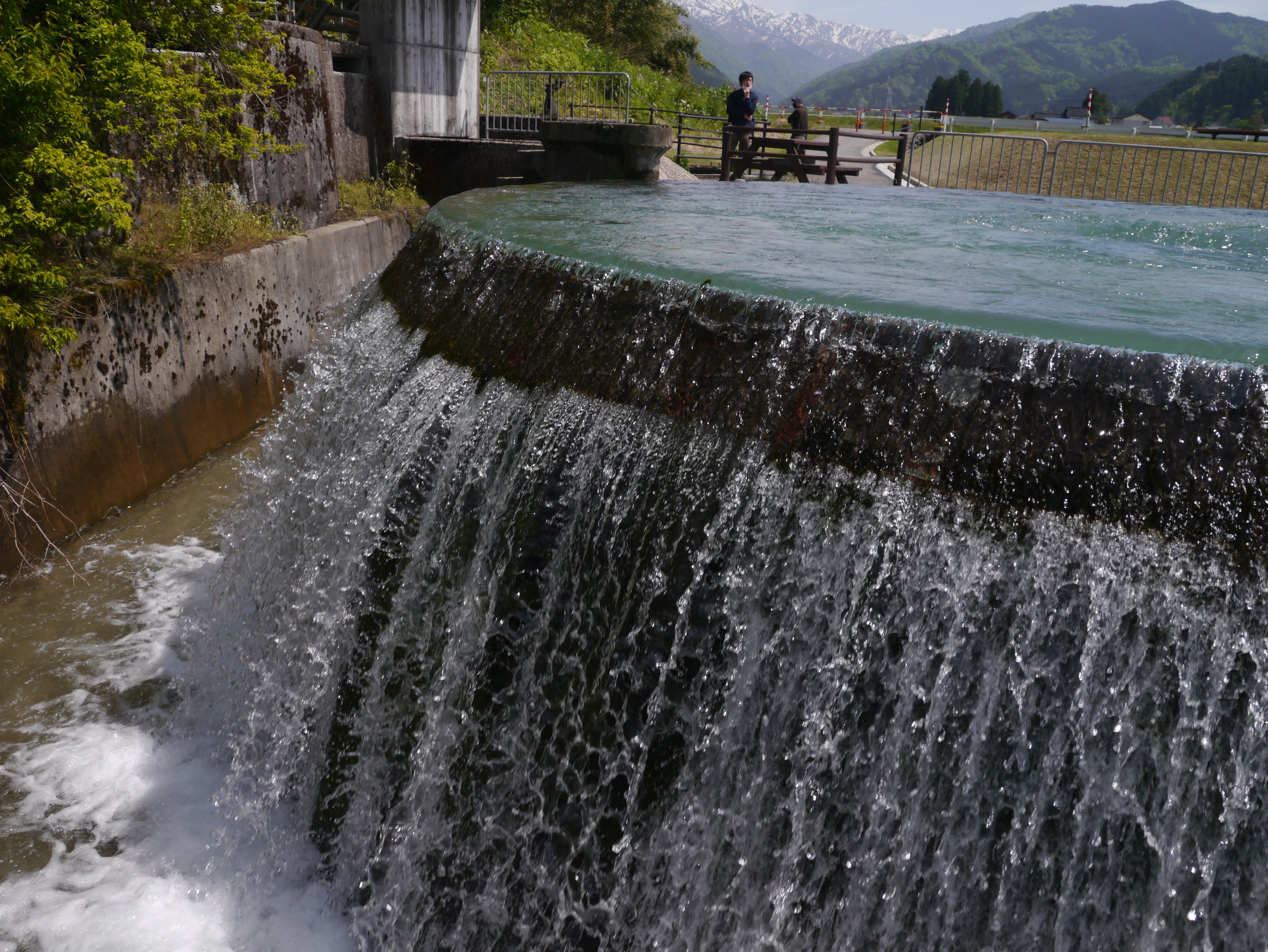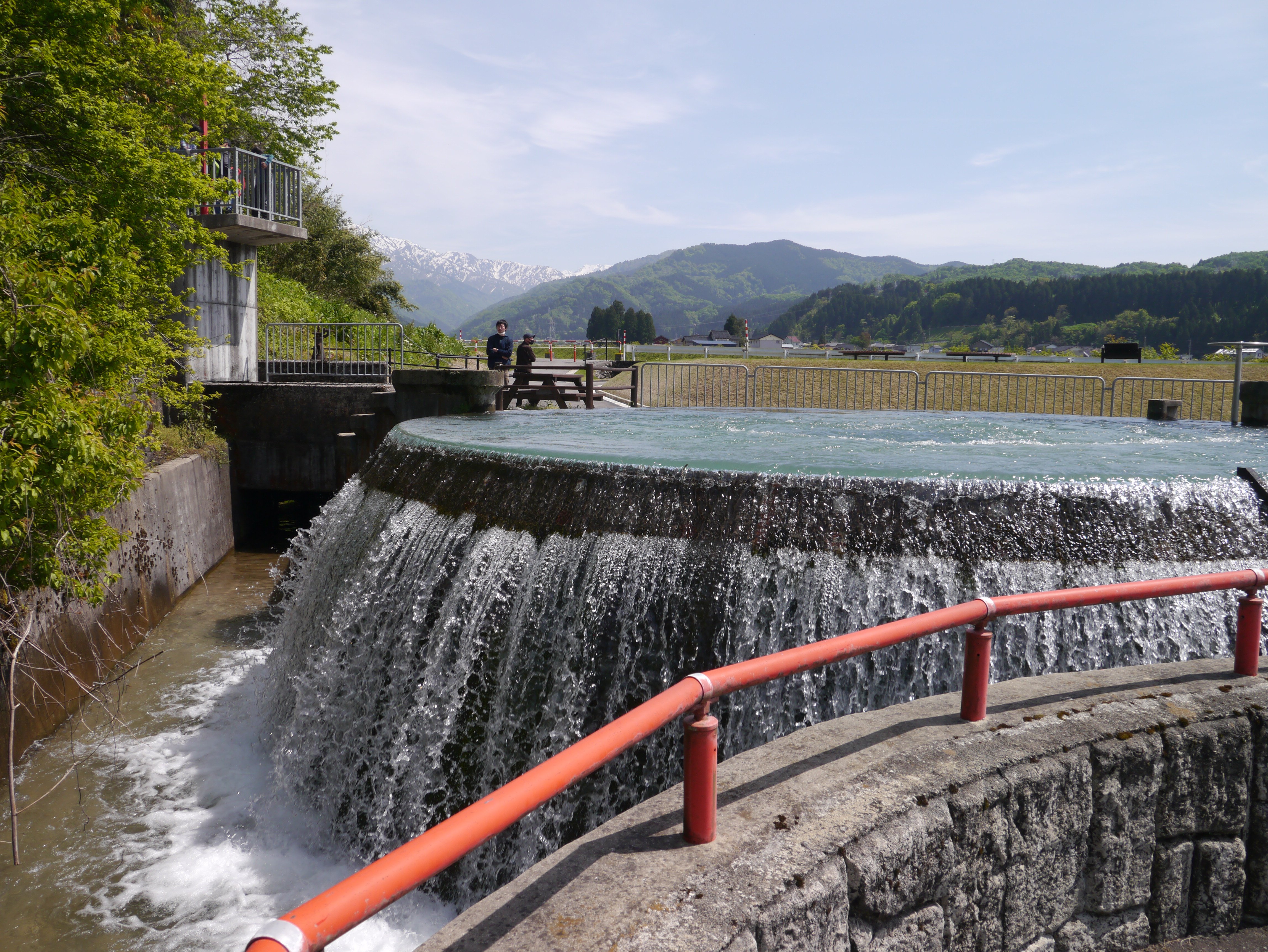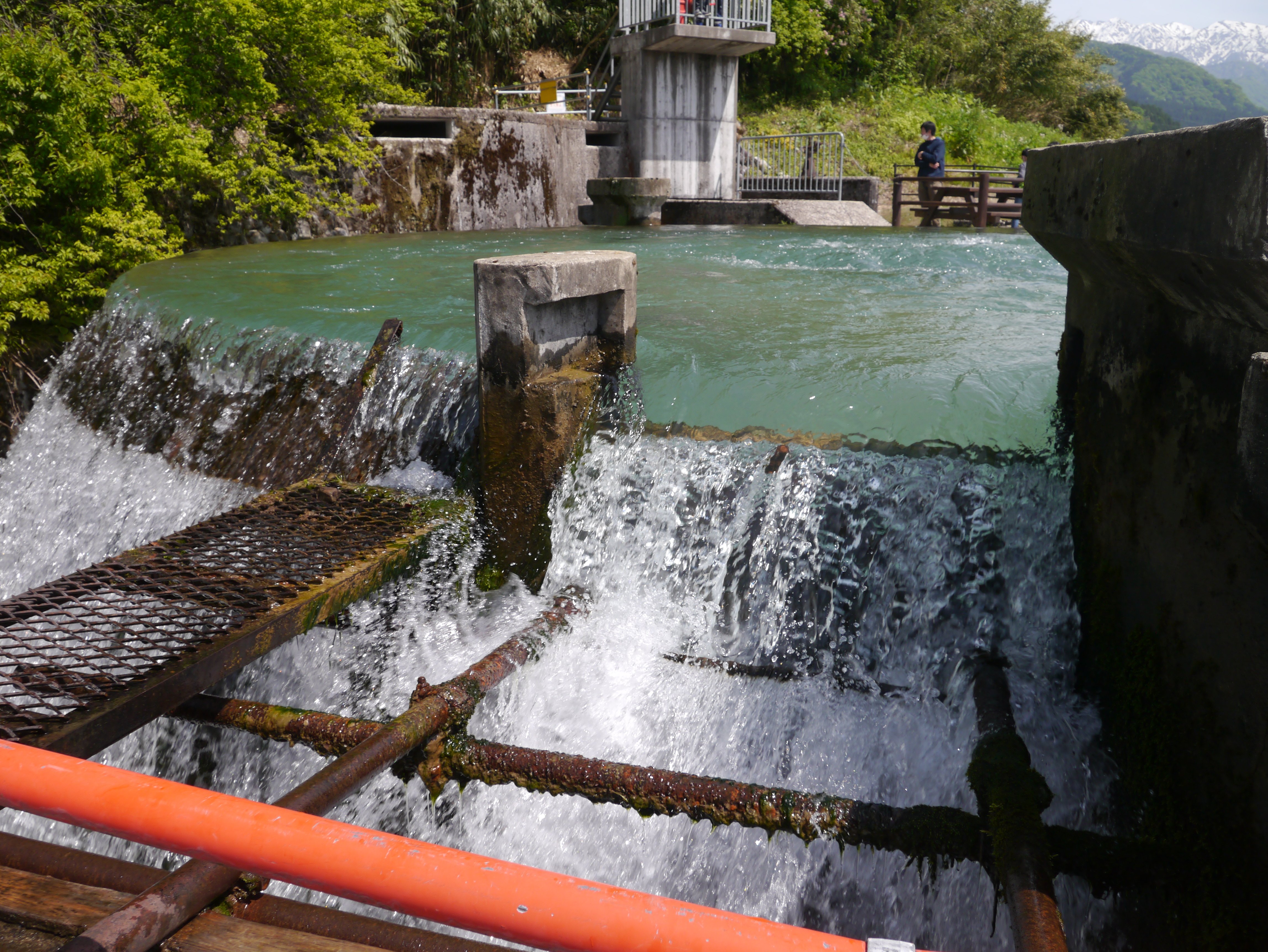 このような円筒分水槽の利点として、上流からの水量の変化に影響されることなく公平に分配される点です。東山円筒分水漕に導入されている片貝川の水は、北陸電力の水力発電所「片貝第一発電所」の発電用に利用されていて、その放水口から水路トンネルを通り、円筒分水槽に運ばれています。水を無駄なく利用しているわけですね。