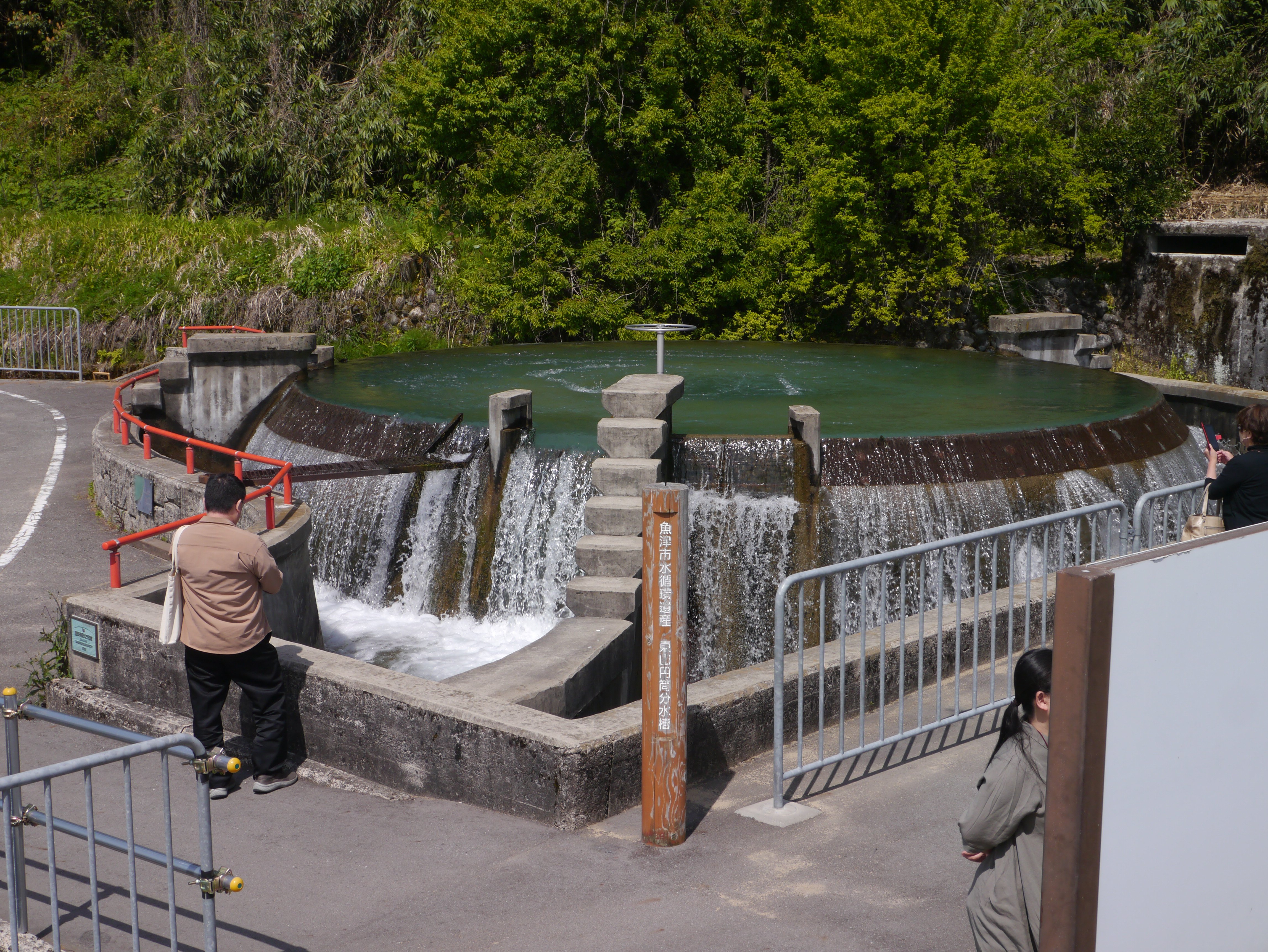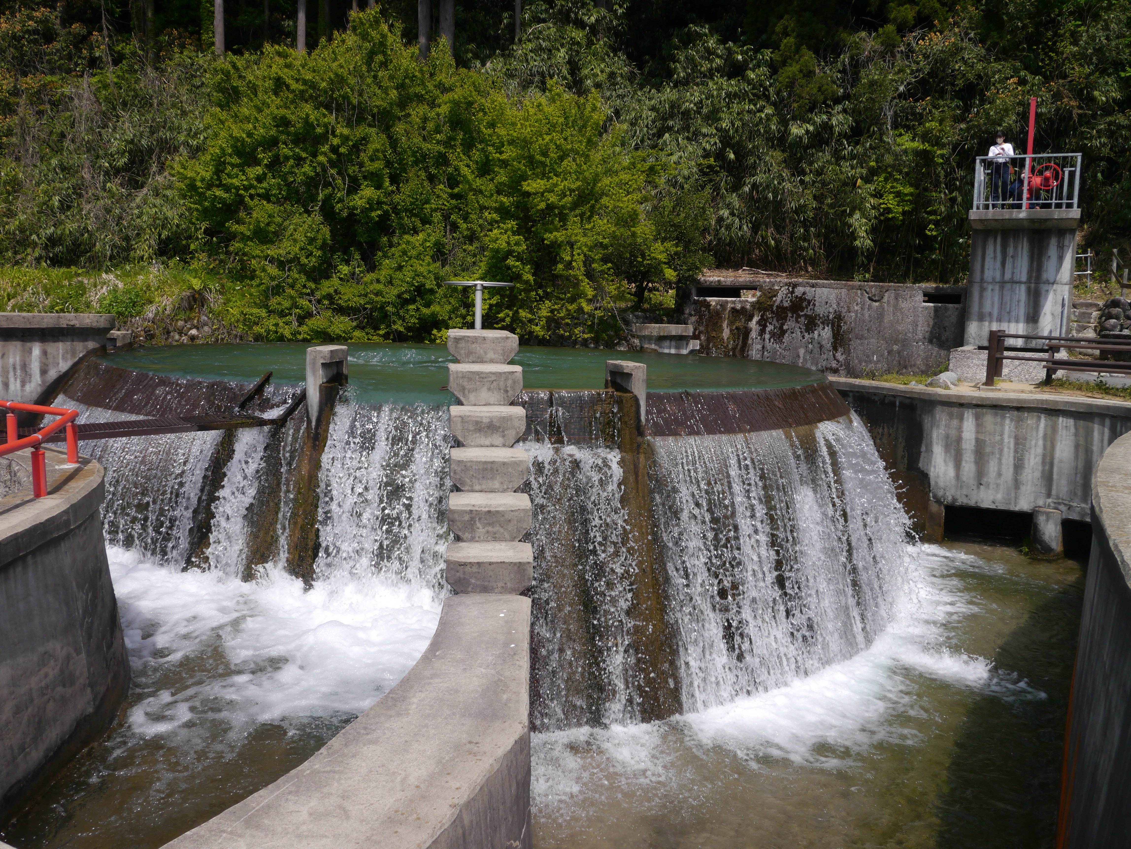この東山円筒分水槽は、直径9.12m、高さ2.5mの水槽となっていて中心部分から水が溢れ出し、3方向の農業用水路に流れ出る仕組みになっています。