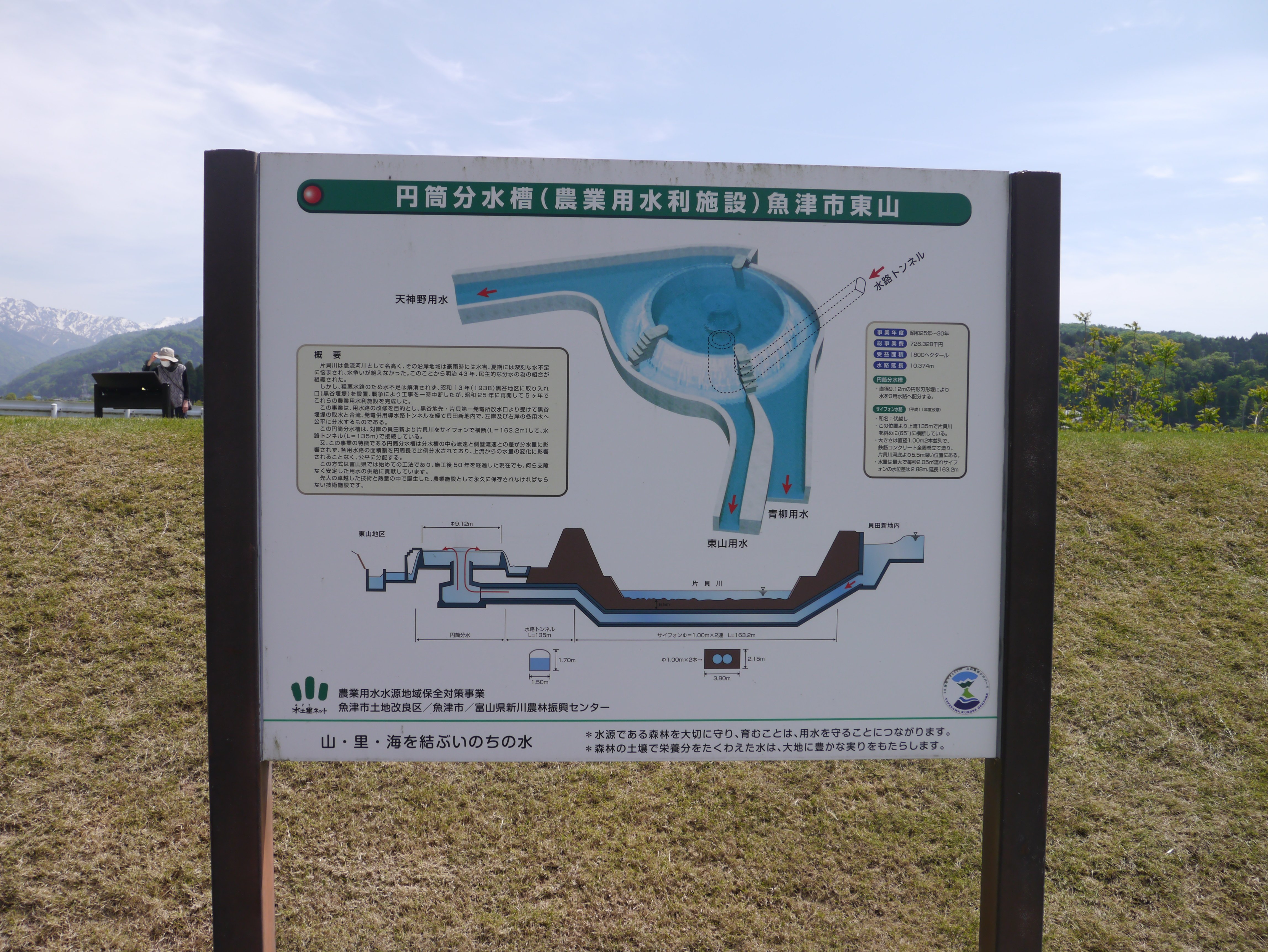 ここの水源となっている片貝川は急流河川として名高く、その流域は豪雨時には水害、夏期には深刻な水不足に悩まされ、水争いが絶えませんでした。 水争いを解決するため、沢山あった取水口を一ヶ所にまとめ、左岸には貝田新円筒分水槽、右岸には東山円筒分水槽を作り、片貝川の川底にヒューム管を埋めて2つの分水槽をつなぎました。