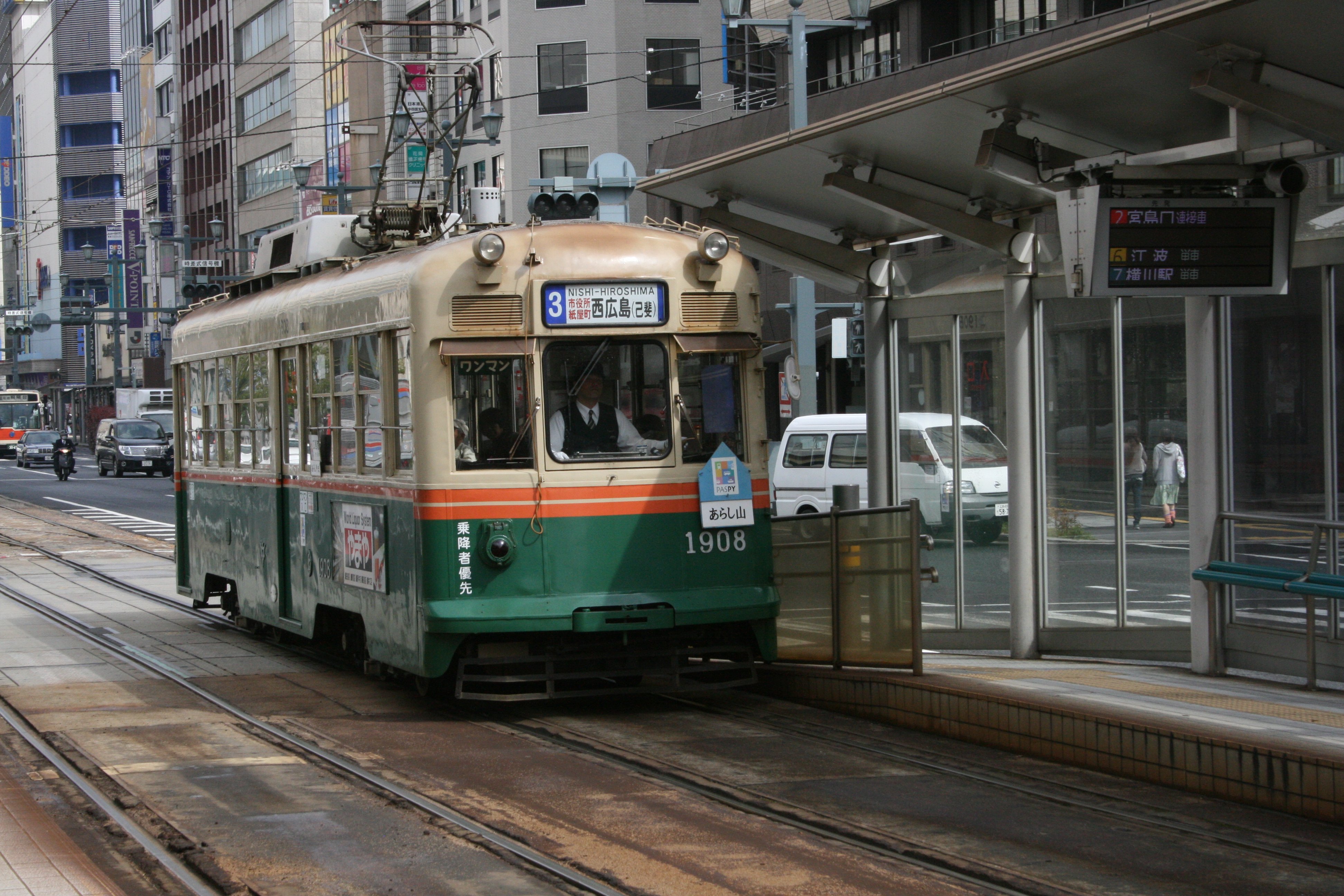 また唯一の鉄道線としては宮島線があり、これはJR西日本山陽本線とほぼ並行して走っています。市内線(軌道線)とは広電西広島駅で接続されていて、直通運転を行っています。以前は、宮島線専用車両も併存していたのですが、現在では軌道線用車両のみが走っていて、高床車が走ることはなくなっています。