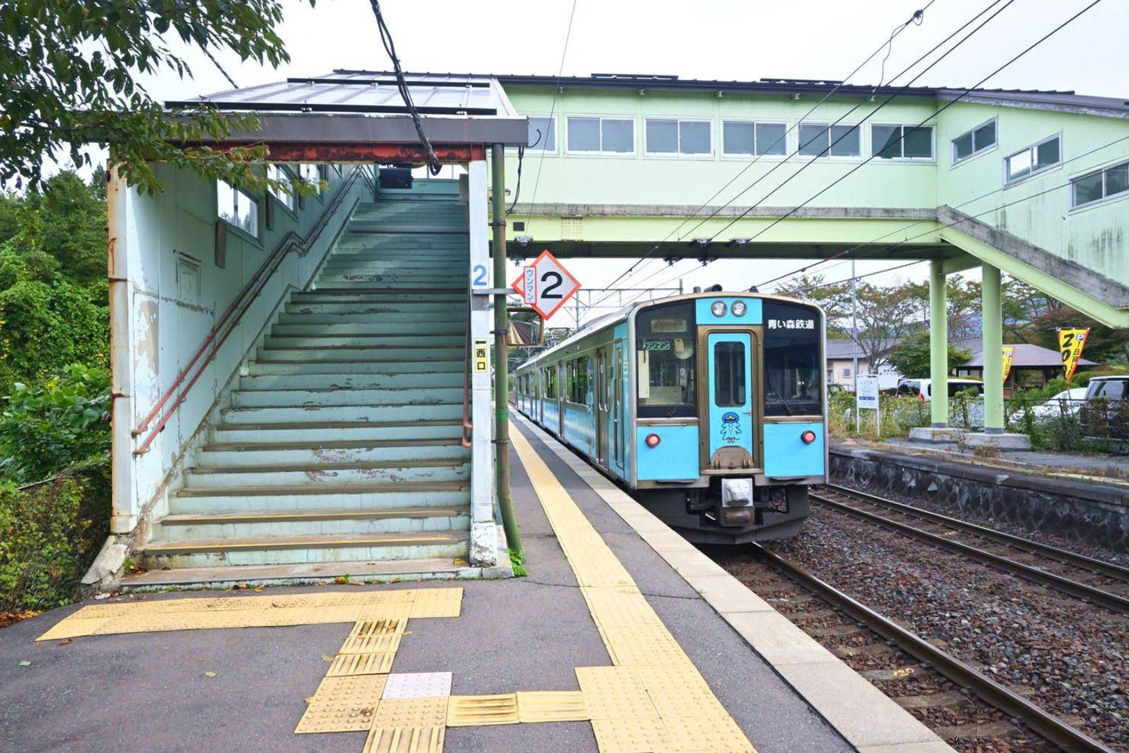 駅構造 相対式ホーム2面2線を有する地上駅。互いのホームは跨線橋で連絡している。木造駅舎を有する。