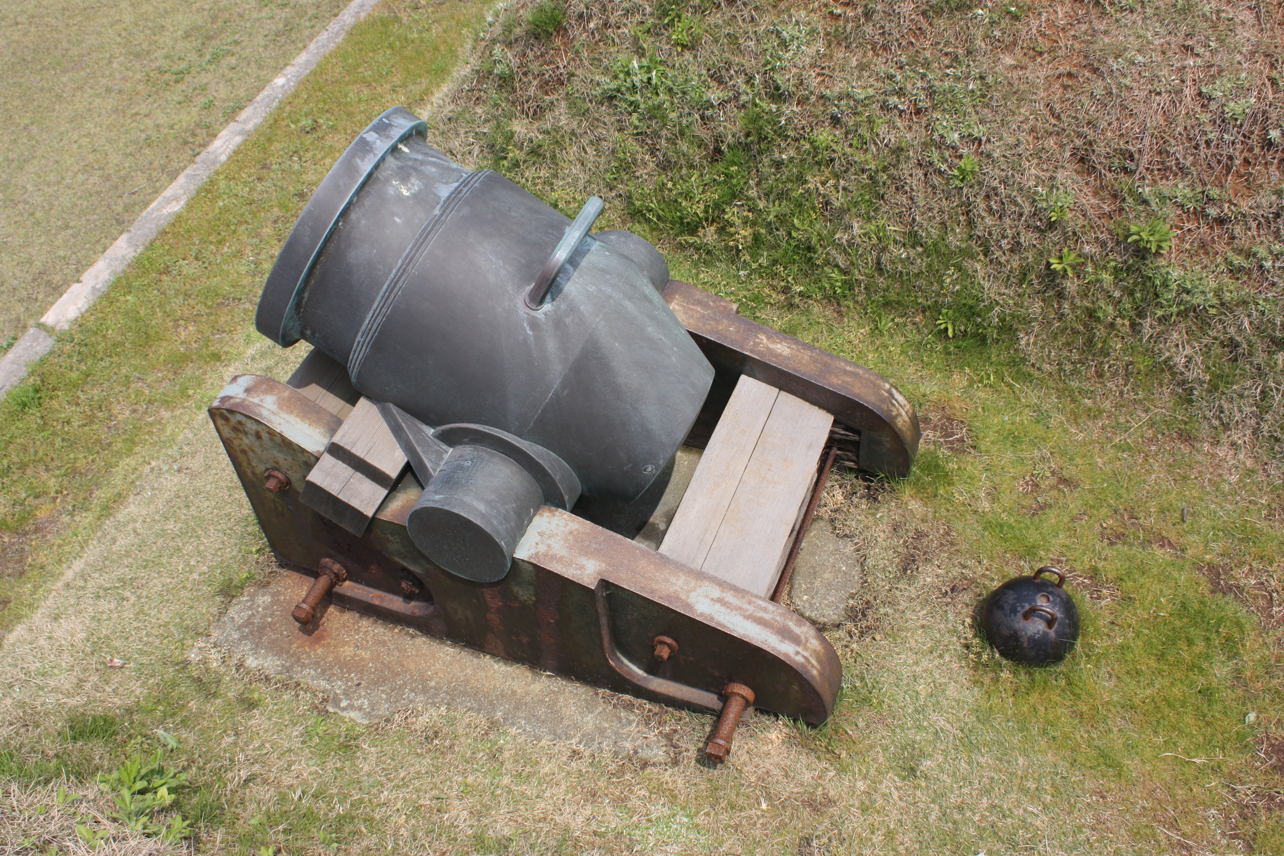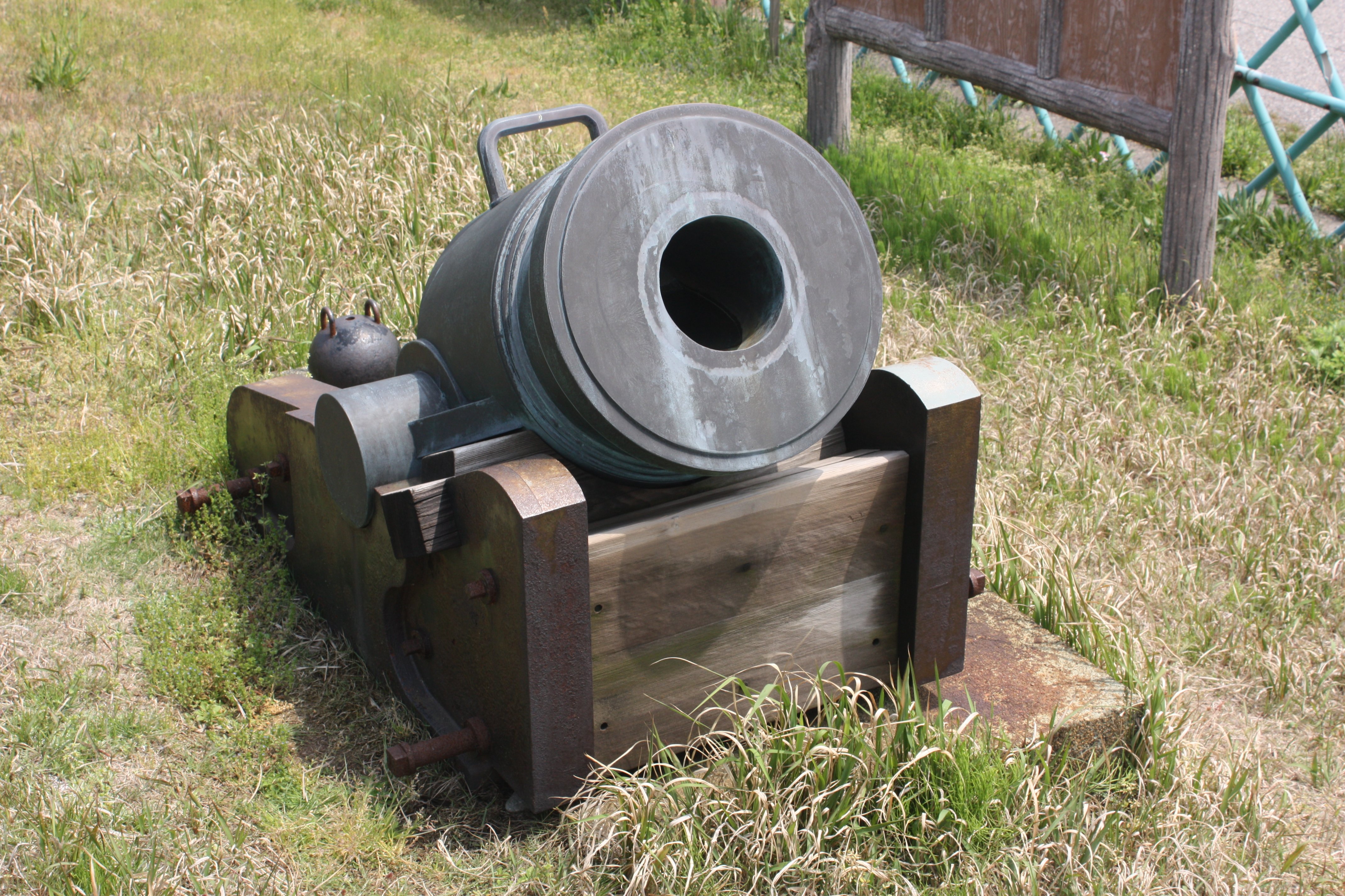 この大砲は、臼砲(モルチール砲)と呼ばれる形式だったようです。この砲は写真で見てもわかるように短砲身なので、初速が低く射程距離も短いので、短距離砲撃しかできないと思われます。