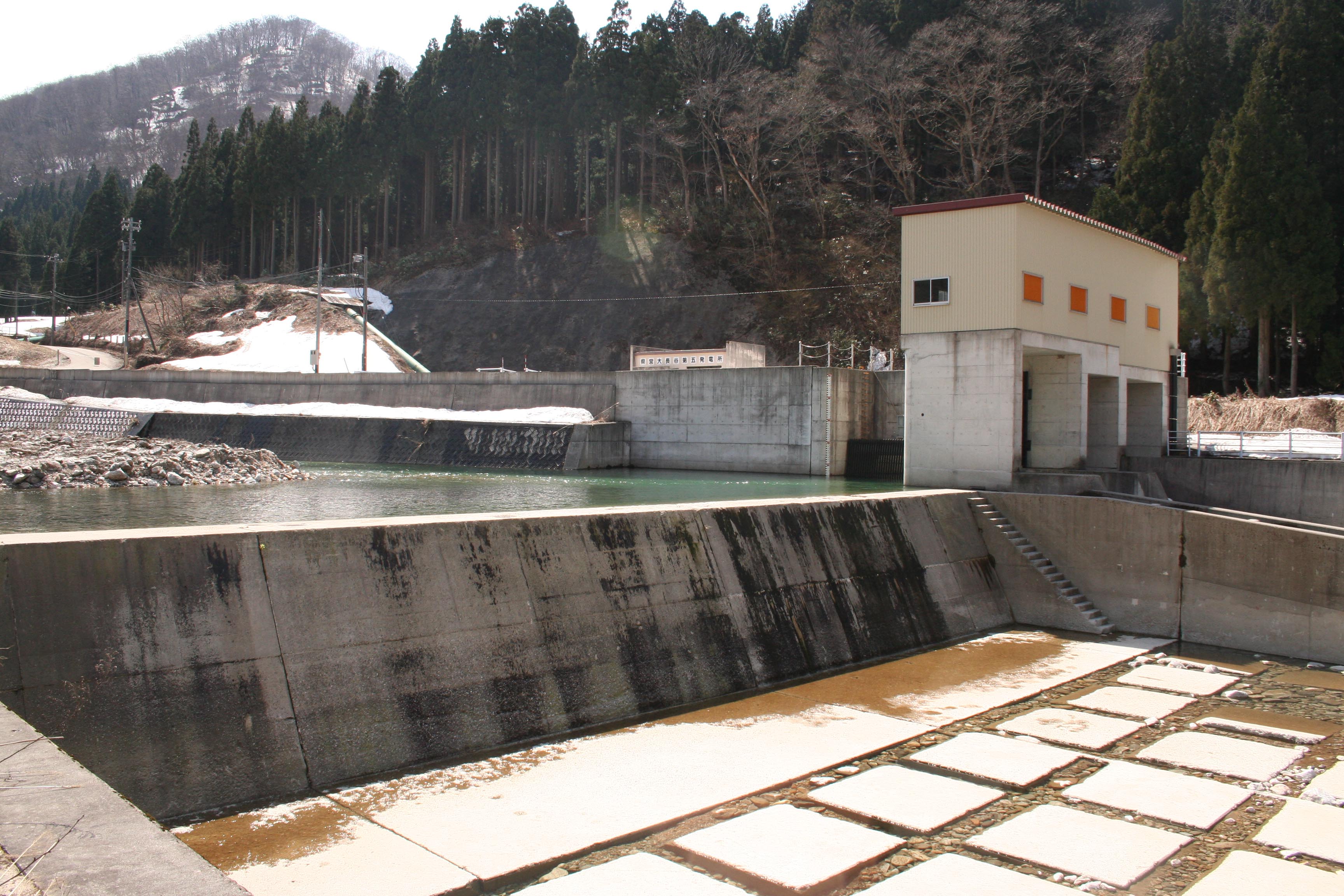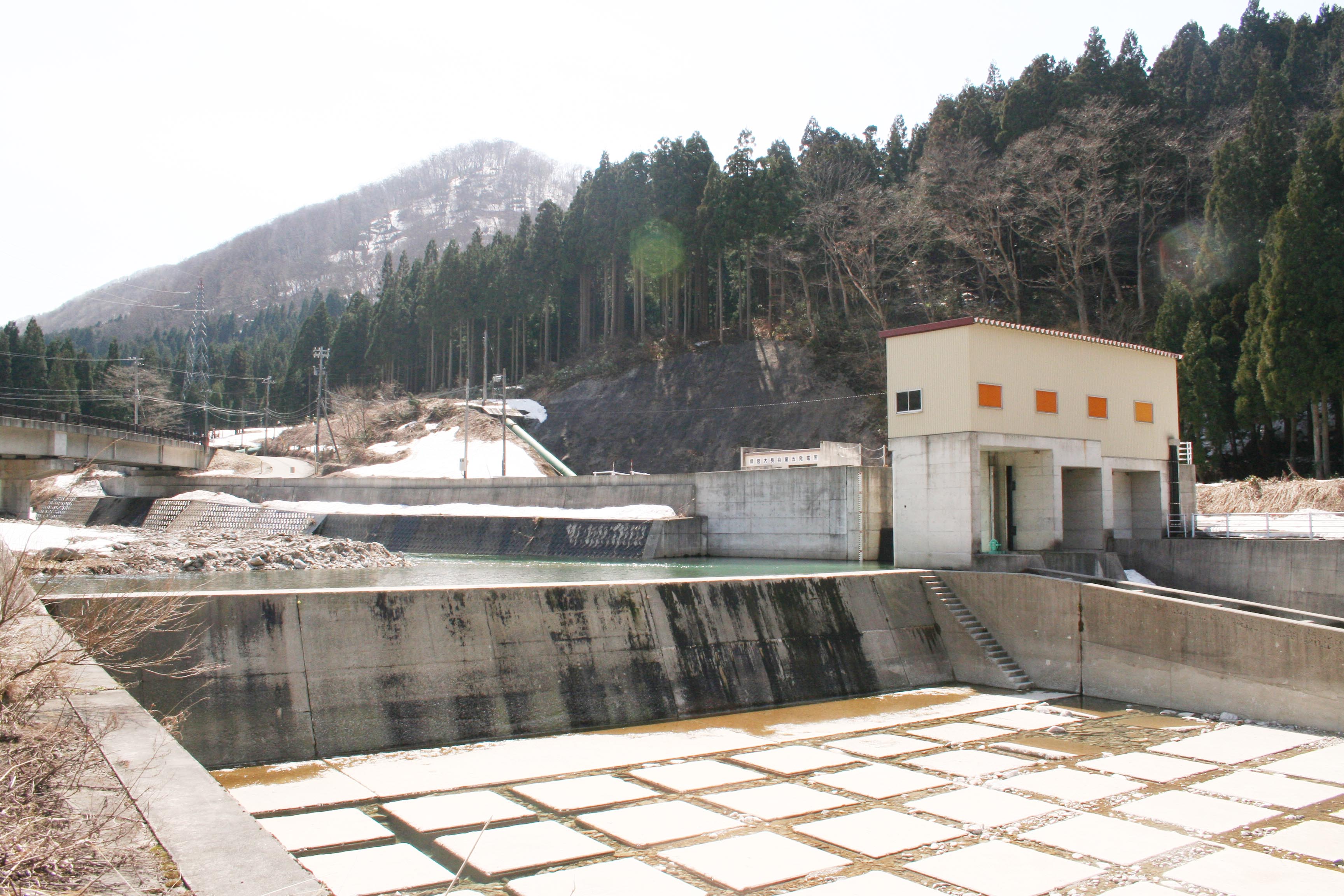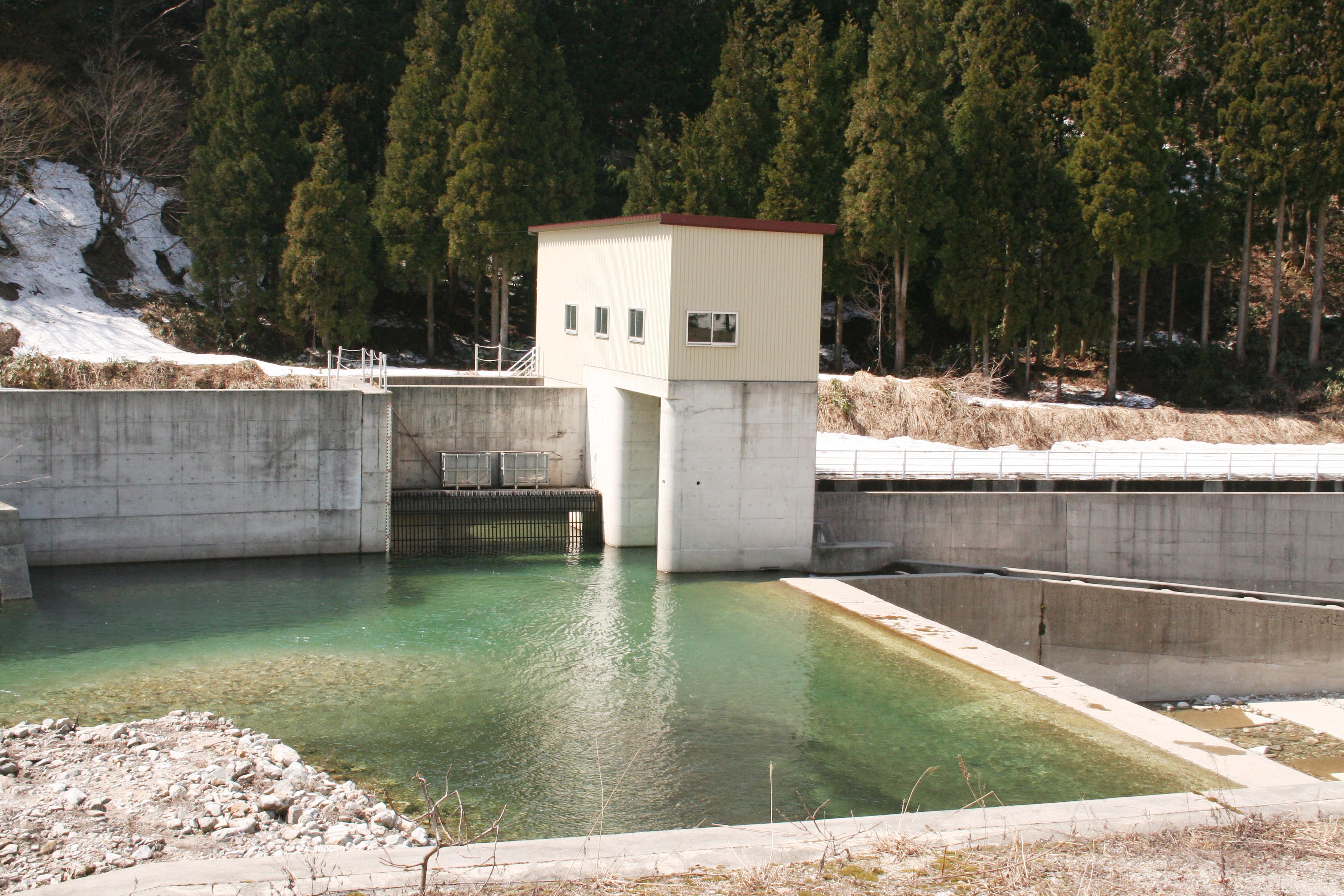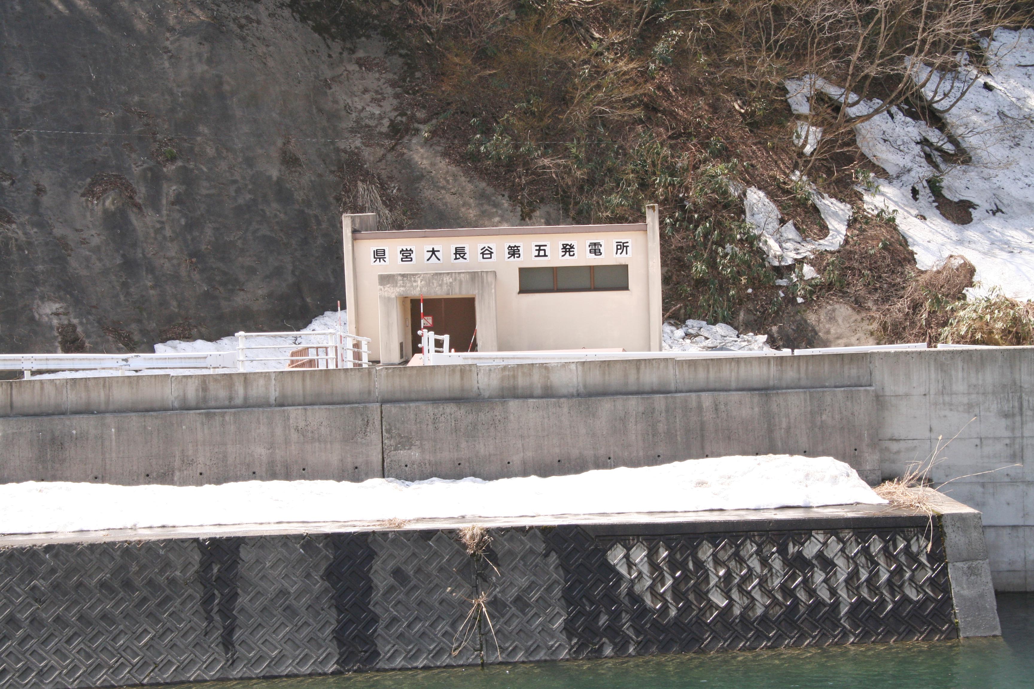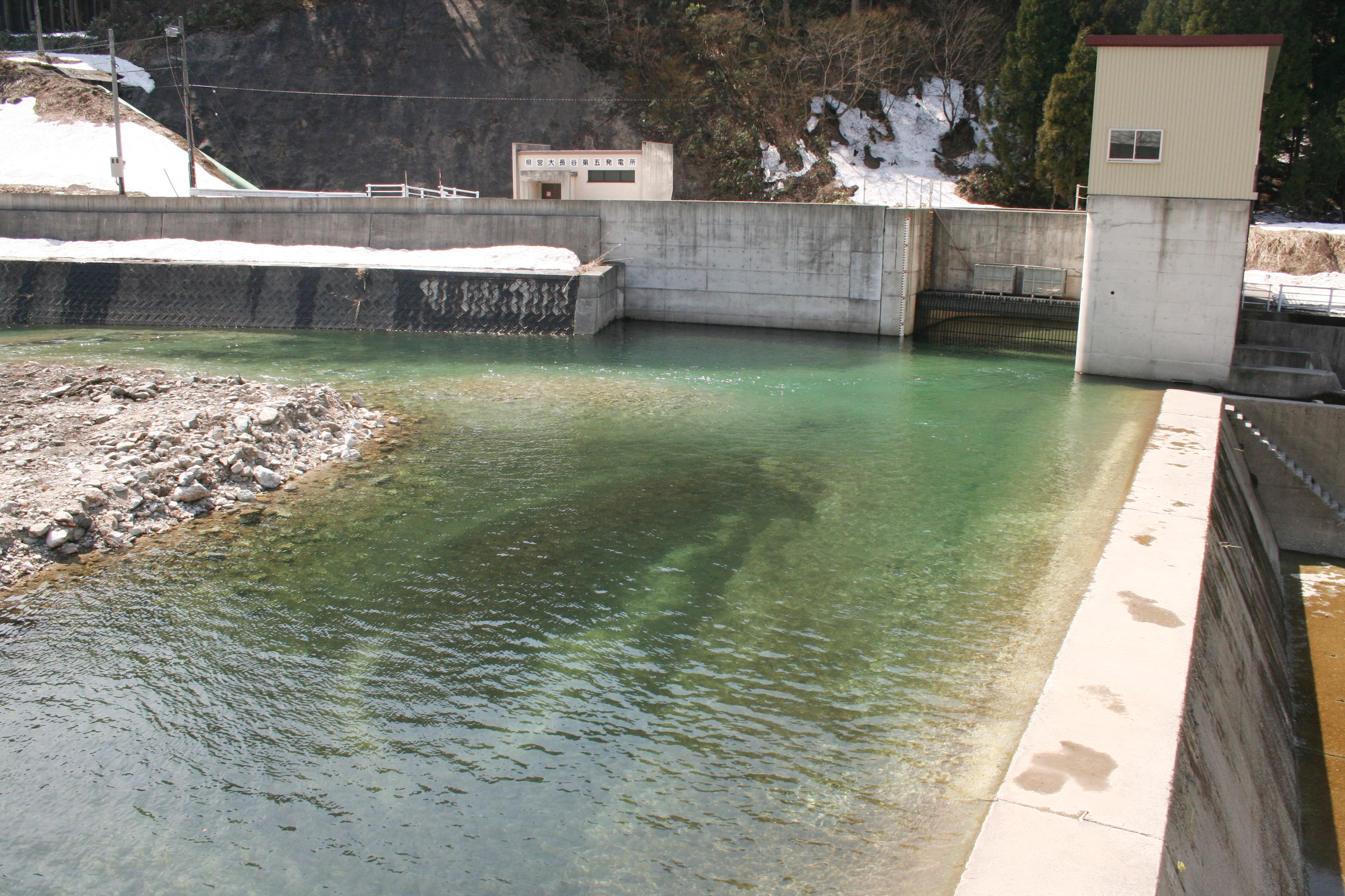 庵谷ダムは、神通川水系井田川支流大長谷川から取水する取水堰です。ここで取水された用水は、新大長谷第一水力発電所へ送水されて最大出力7500kwの発電を行っています。