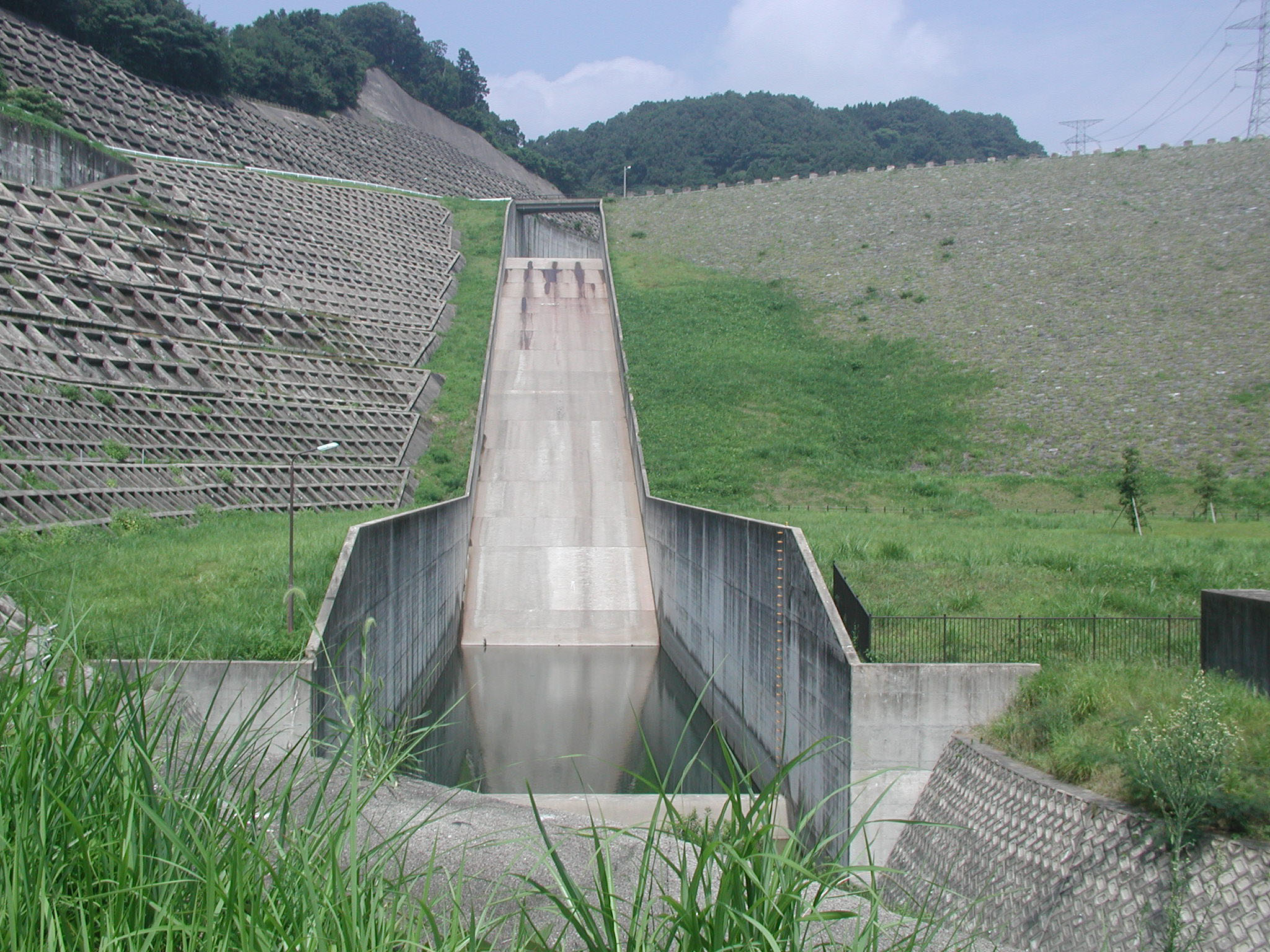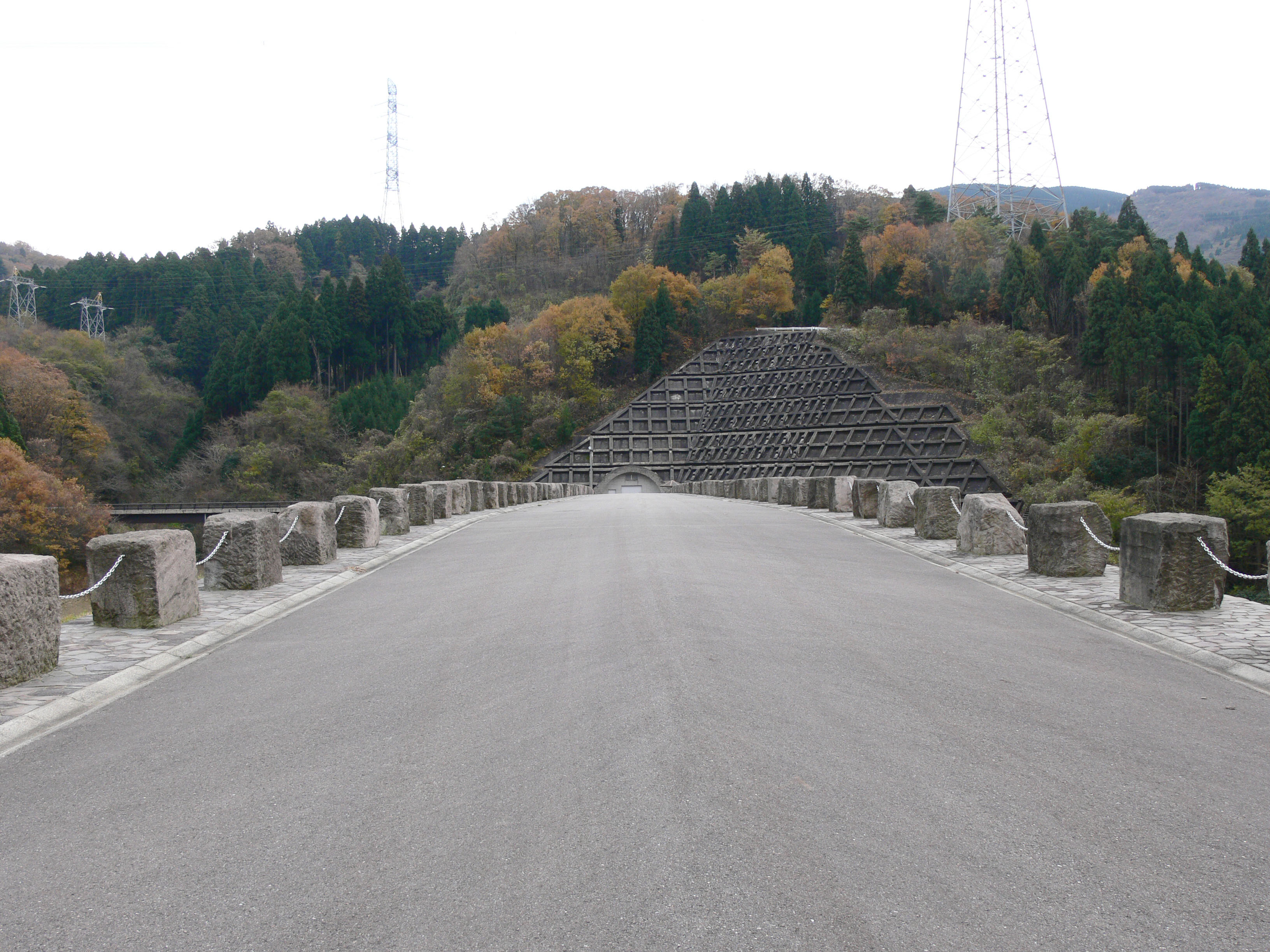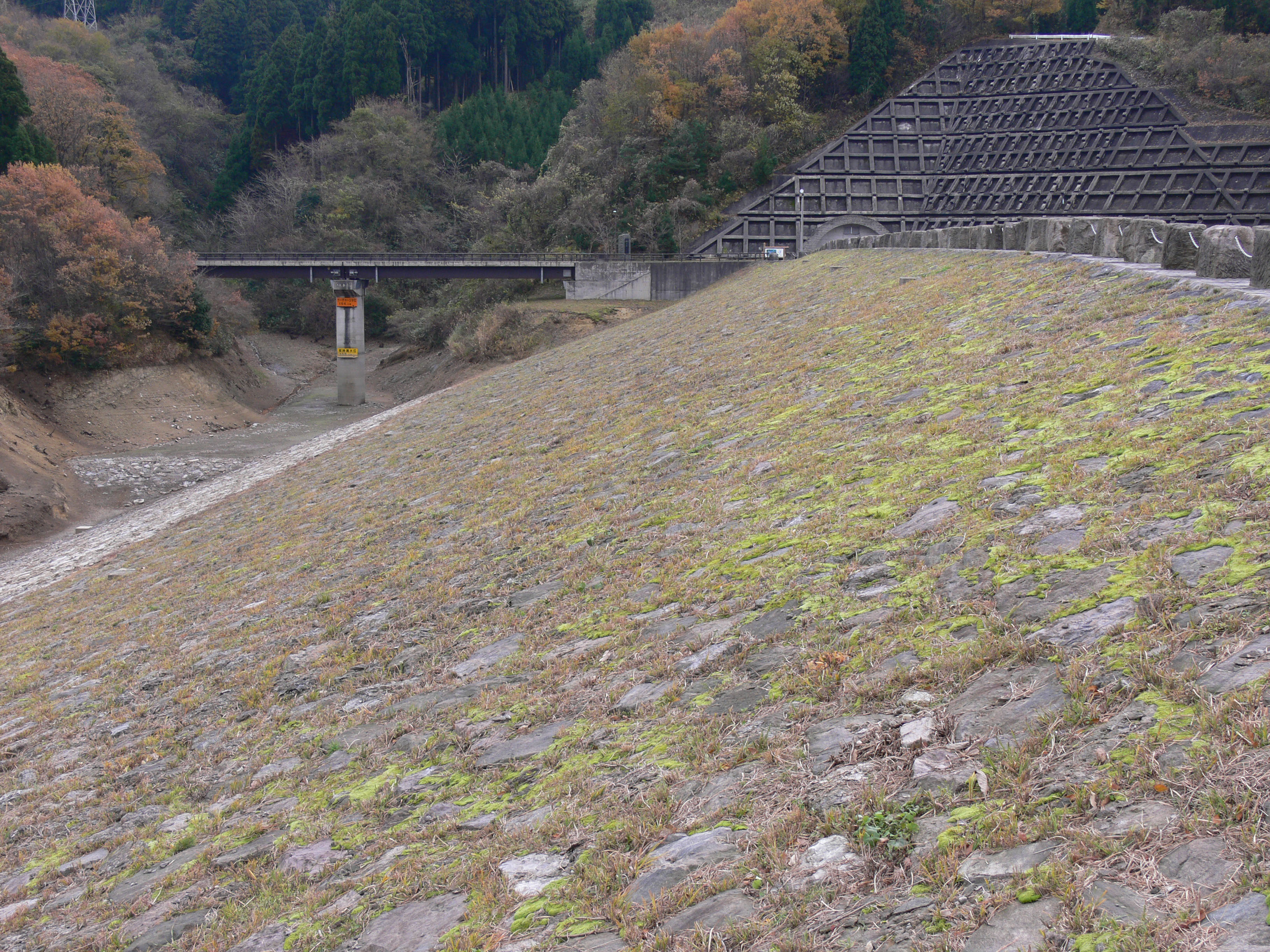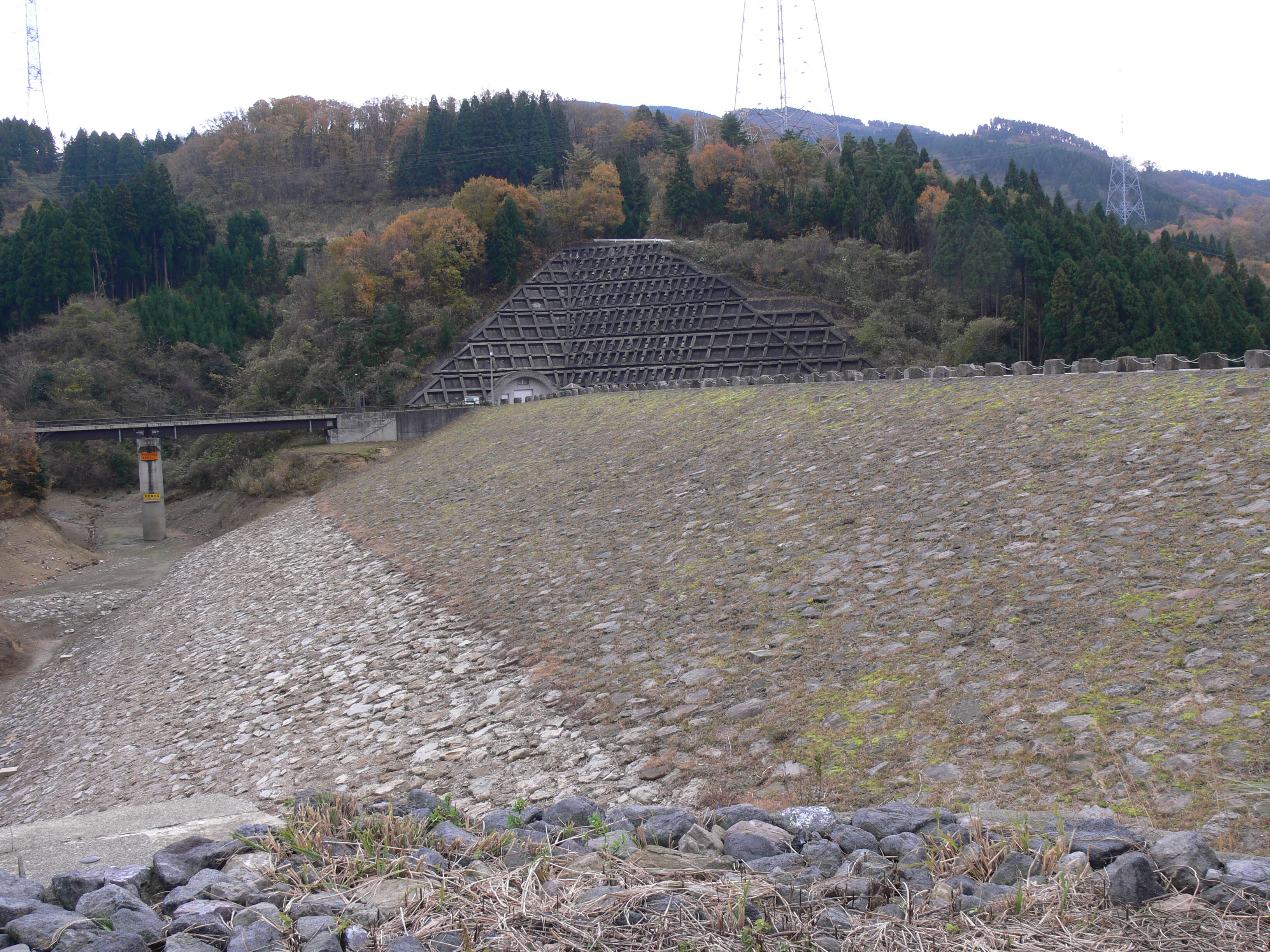 医王ダムは、典型的なロックフィルダムですが、少し残念なのは草が岩の間から生えていることです。