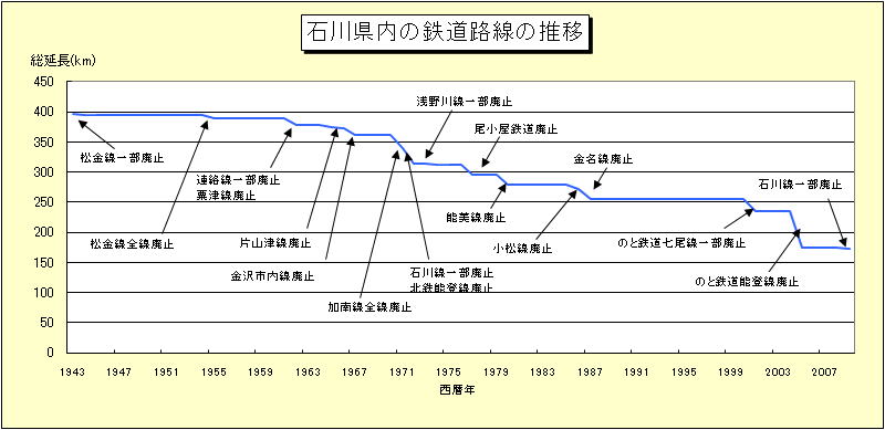下のグラフを見てもわかるようにじわじわ路線が廃止されていき、1987年までで私鉄線の大半が廃止されていて、さらにのと鉄道が2001年以降に一気に廃線にさらされてます。