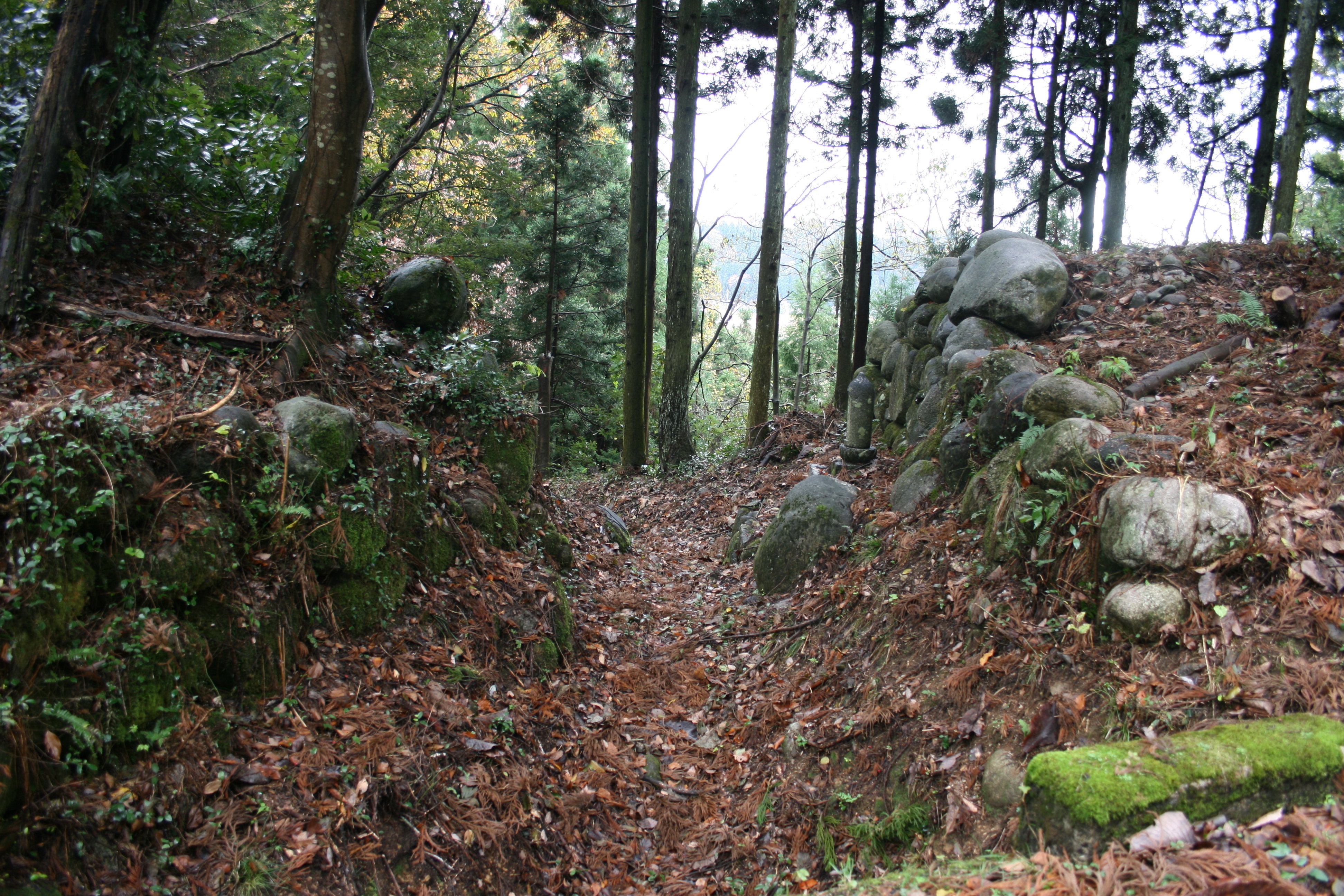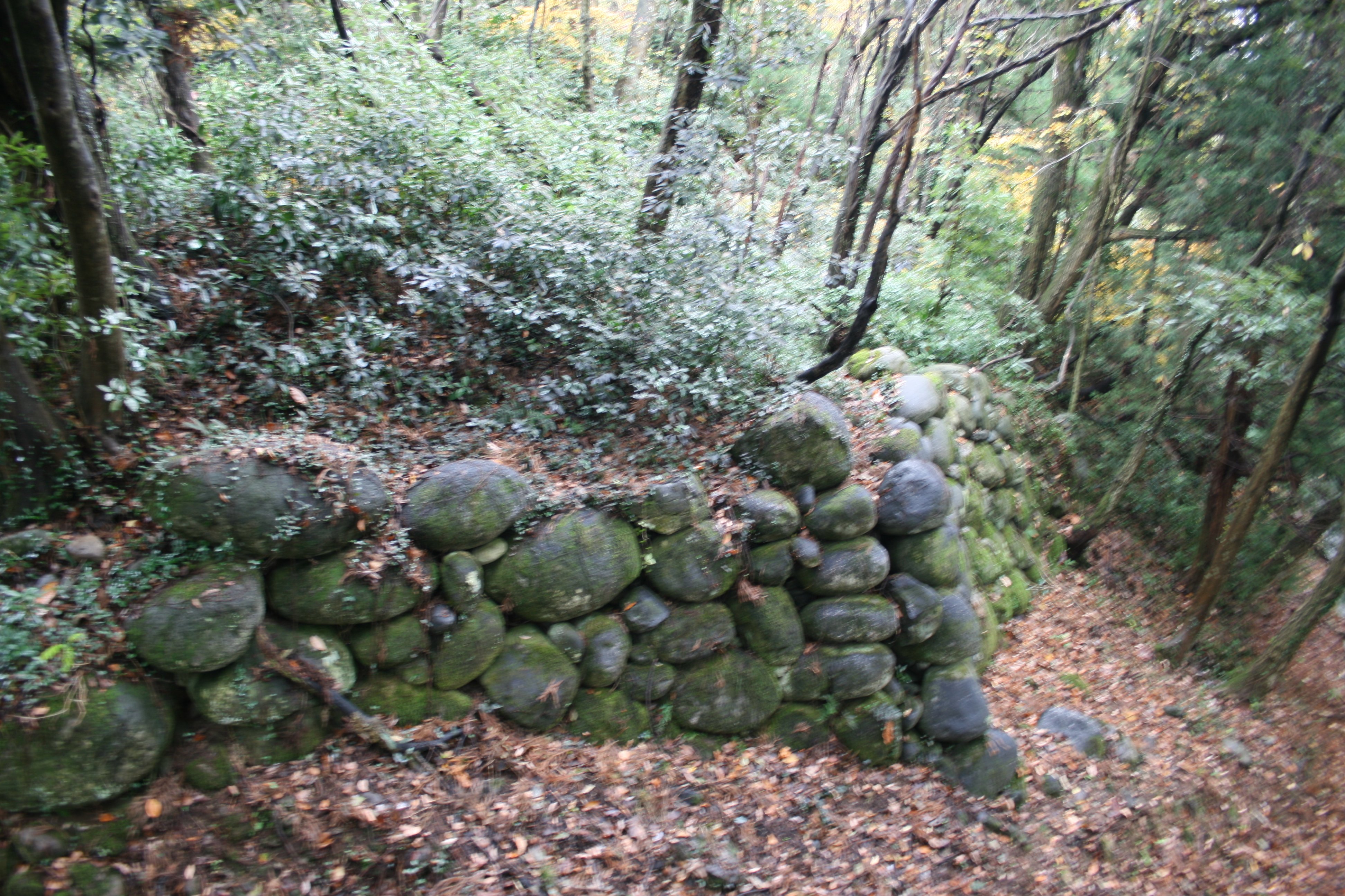 石の門は升方南城と水尾城の間に位置し、かつての山街道がここを通っていました。石の門の名の通り直径70~80cmの大きな川原石で築かれた石垣遺構が現在も健在です。石垣に使った石は早月川から採取したものでしょうね。