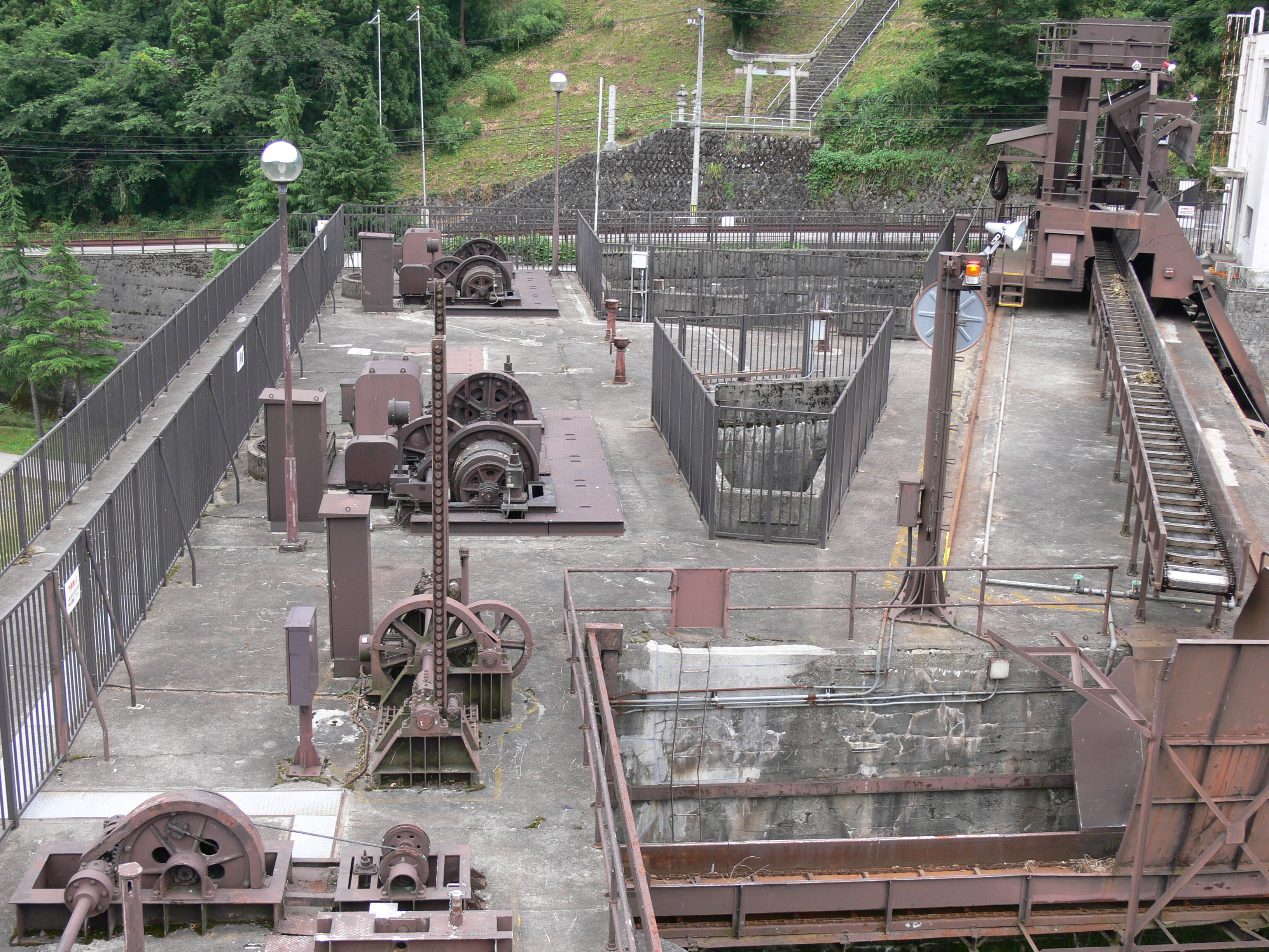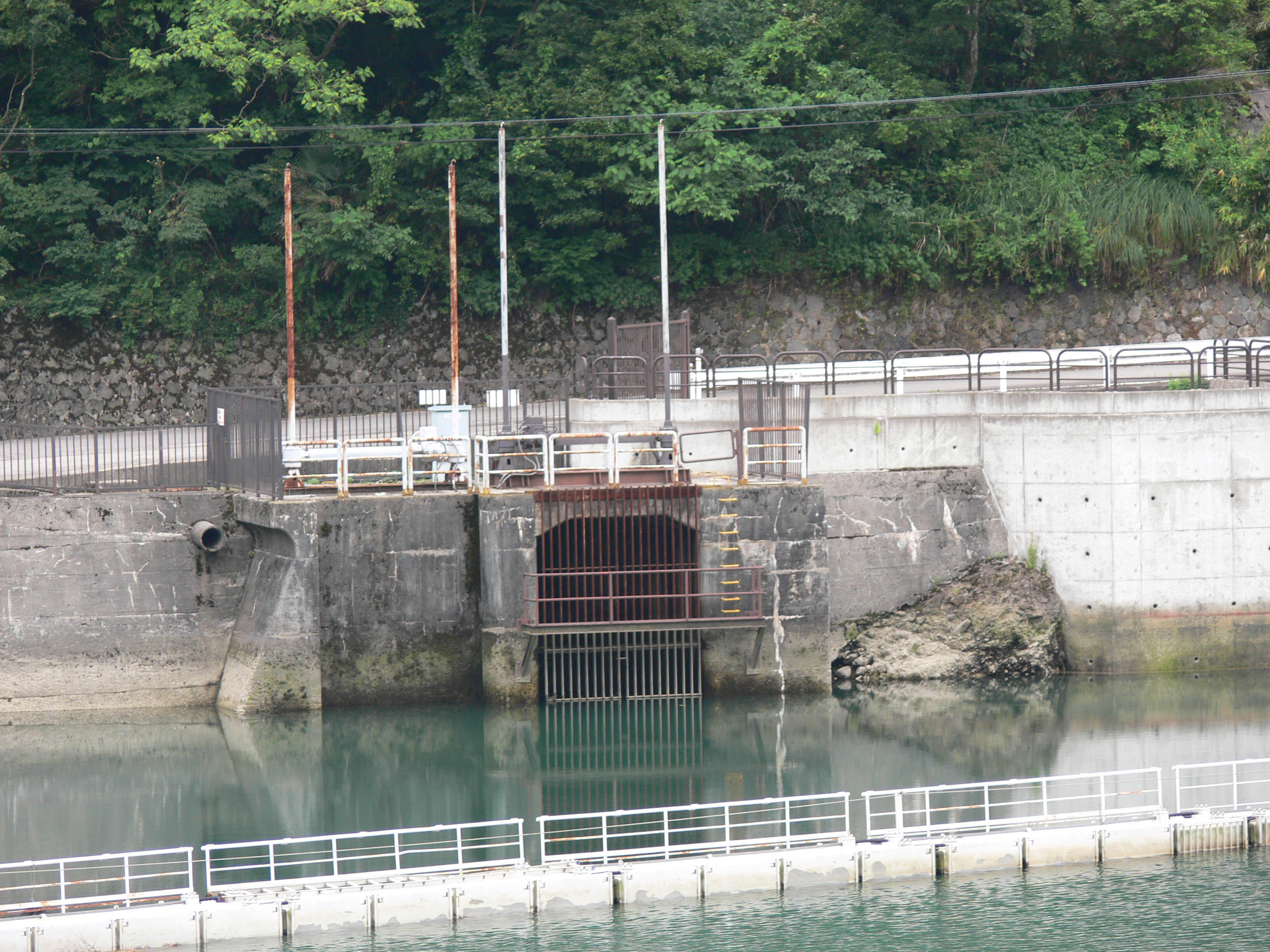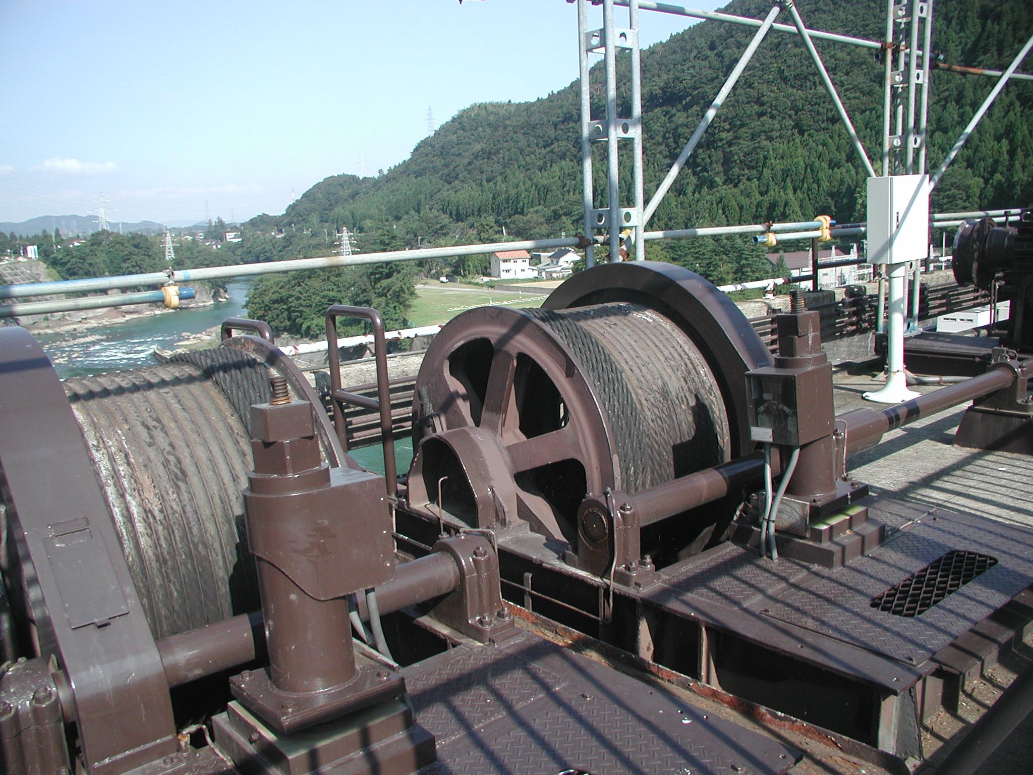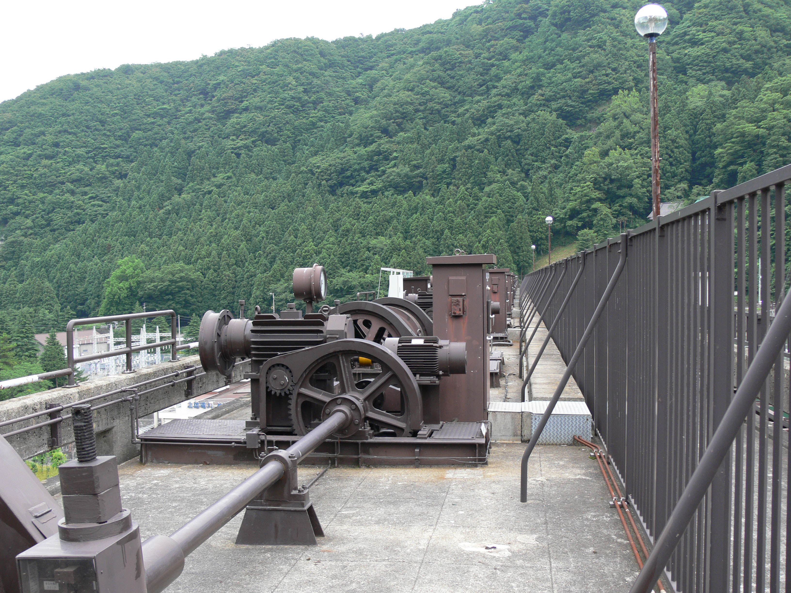 ダム湖は漕艇場にもなっています 取水口ゲート操作盤と巻き上げ機