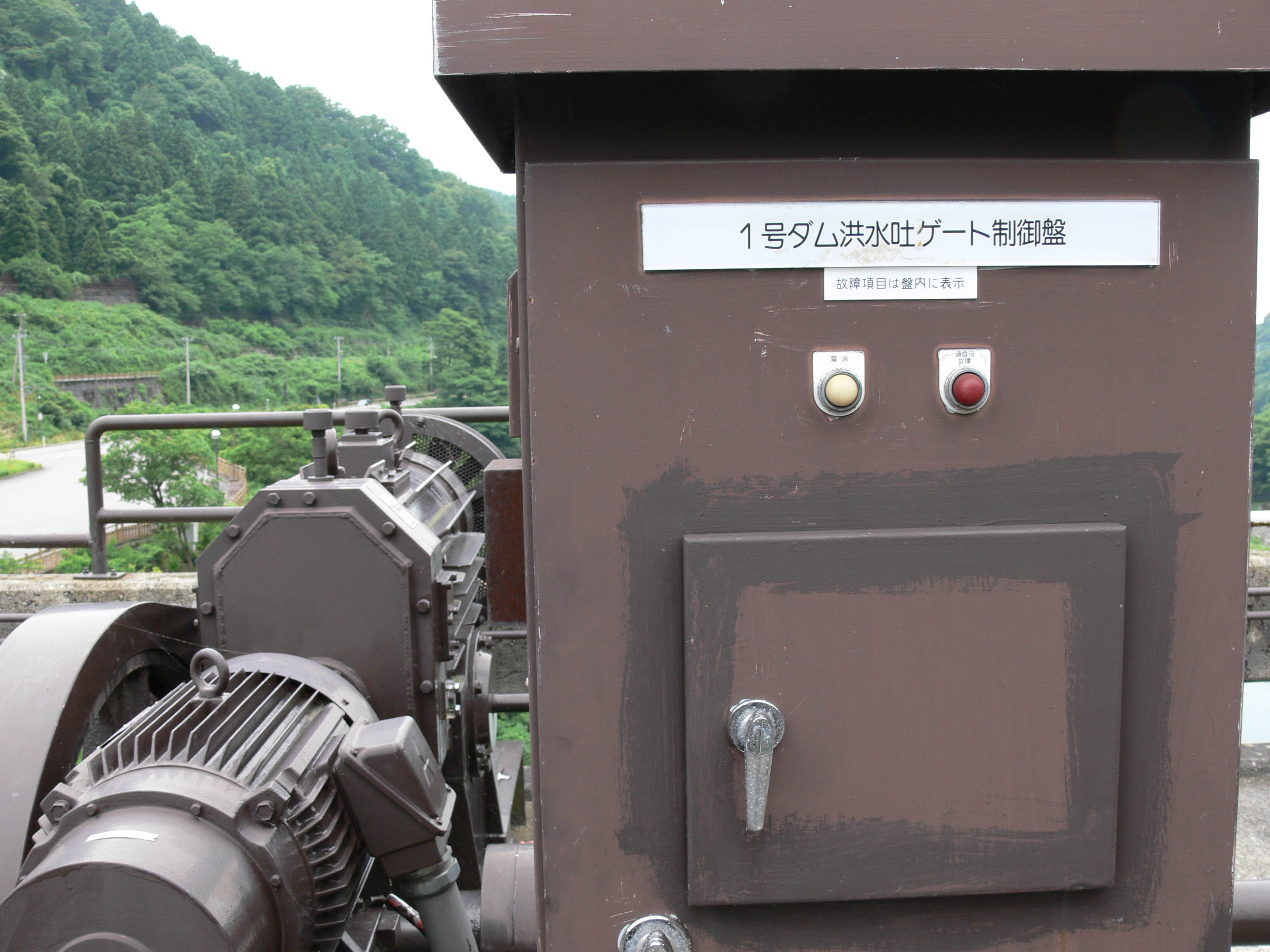 天端上の洪水吐きゲート制御盤 天端は歩行者が通れます