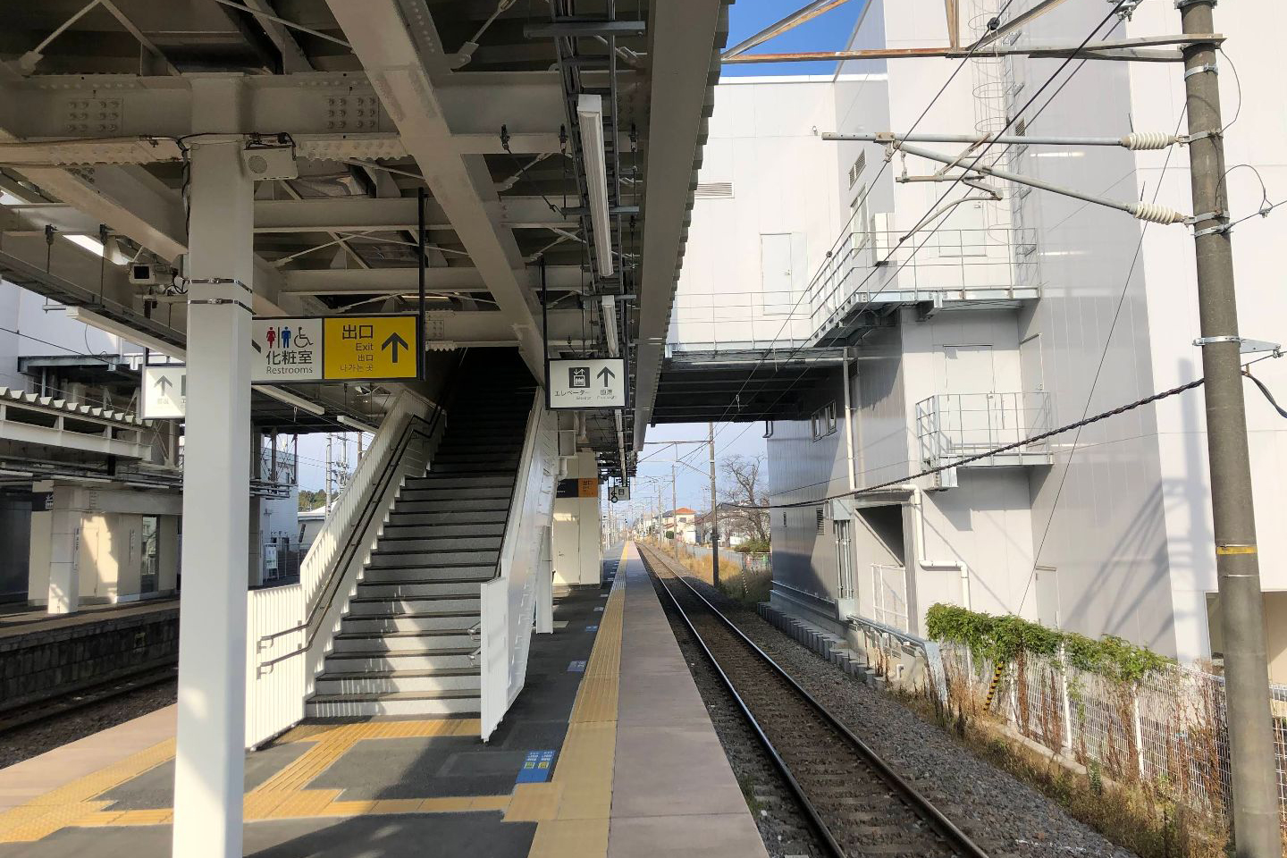 互いのホームは跨線橋で連絡している。2番線は通過待ちの列車が使用する。
