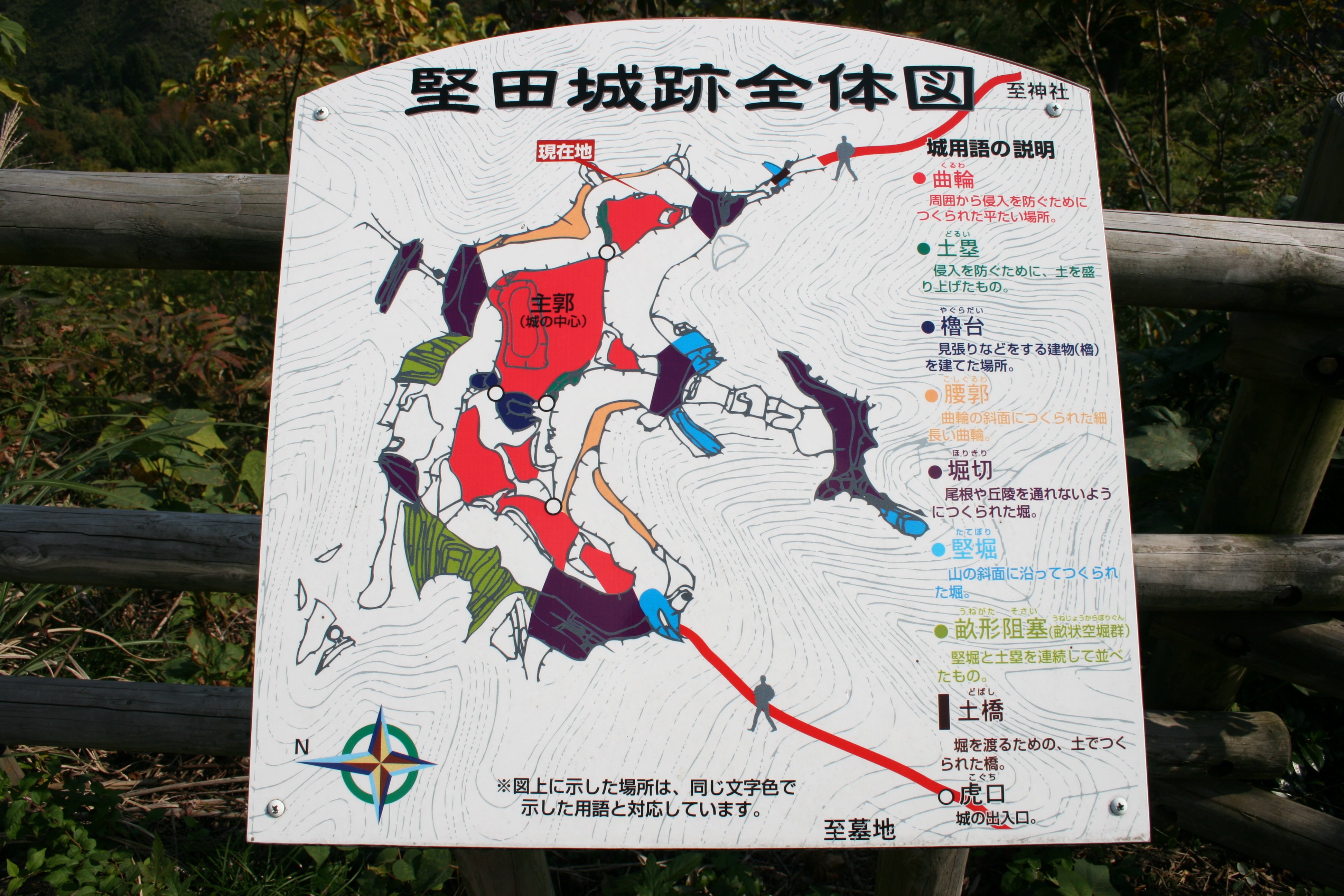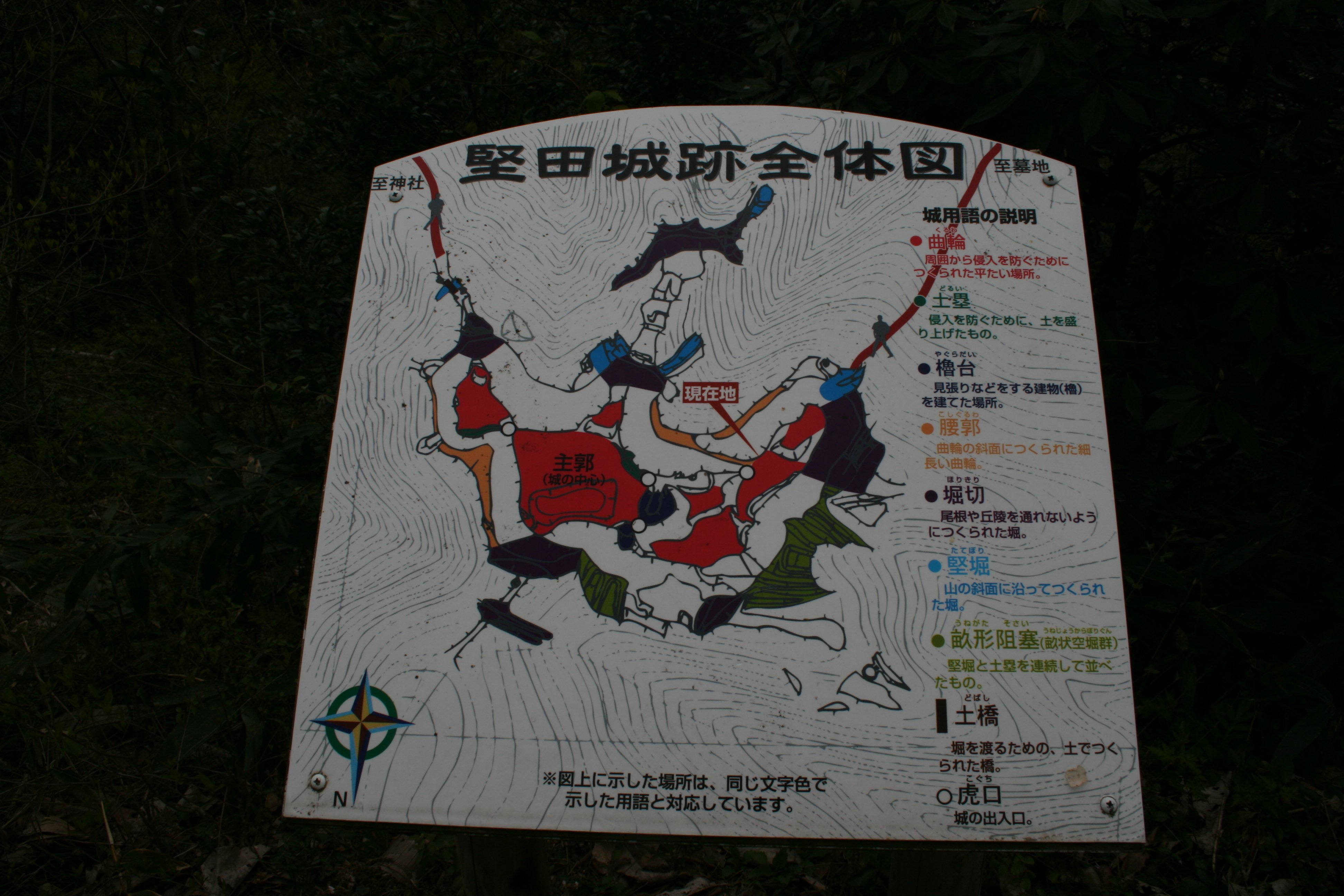 さて、この堅田城を我が軍が攻めるとすればどうするかですが、もっとも手薄なのが南東側なのでここの尾根筋を伝って主郭に攻め込みたいところですが、ここから攻めると守備側からは丸見えなので被害が大きくなりそうです。で、ここから攻める際には北側と南側からも同時に攻め込んで守備側に的を絞らせないようにする必要があるでしょう。主郭に入ってしまえば他の郭を落とすのはたやすいでしょう。しかしいずれにしても厳重な防御が施されている城ですので、攻め落とすのはたいへんでしょう。