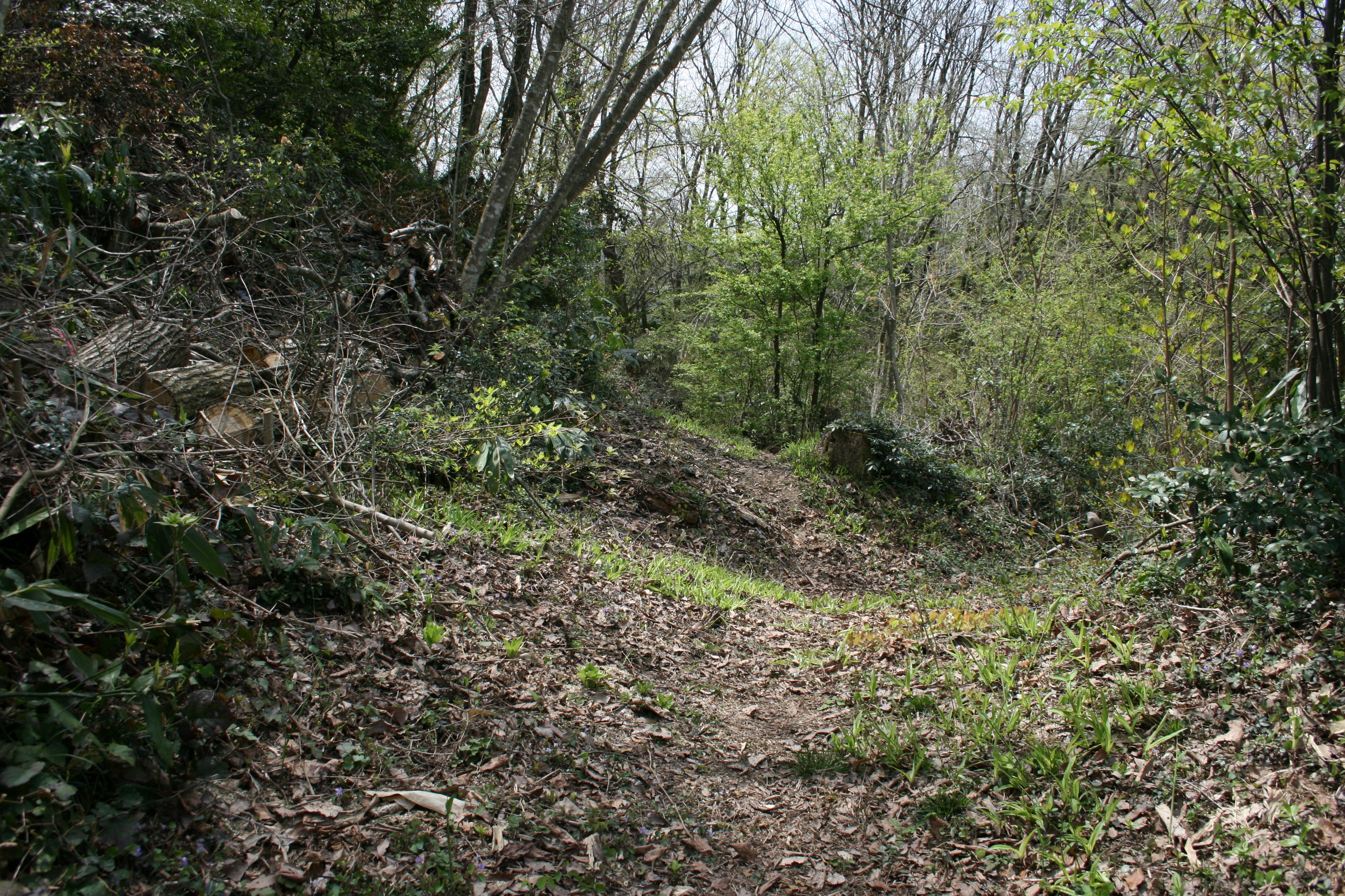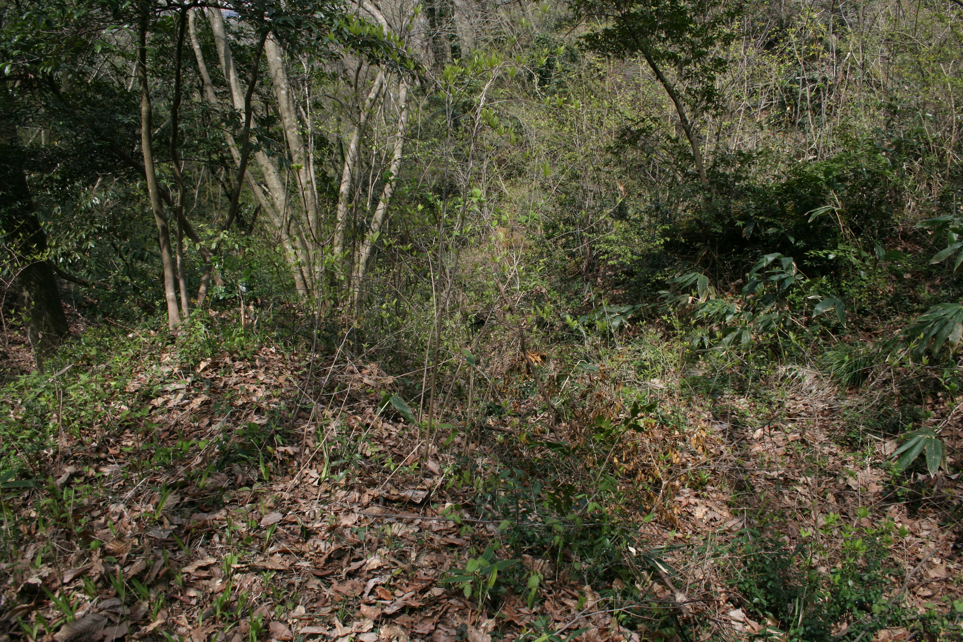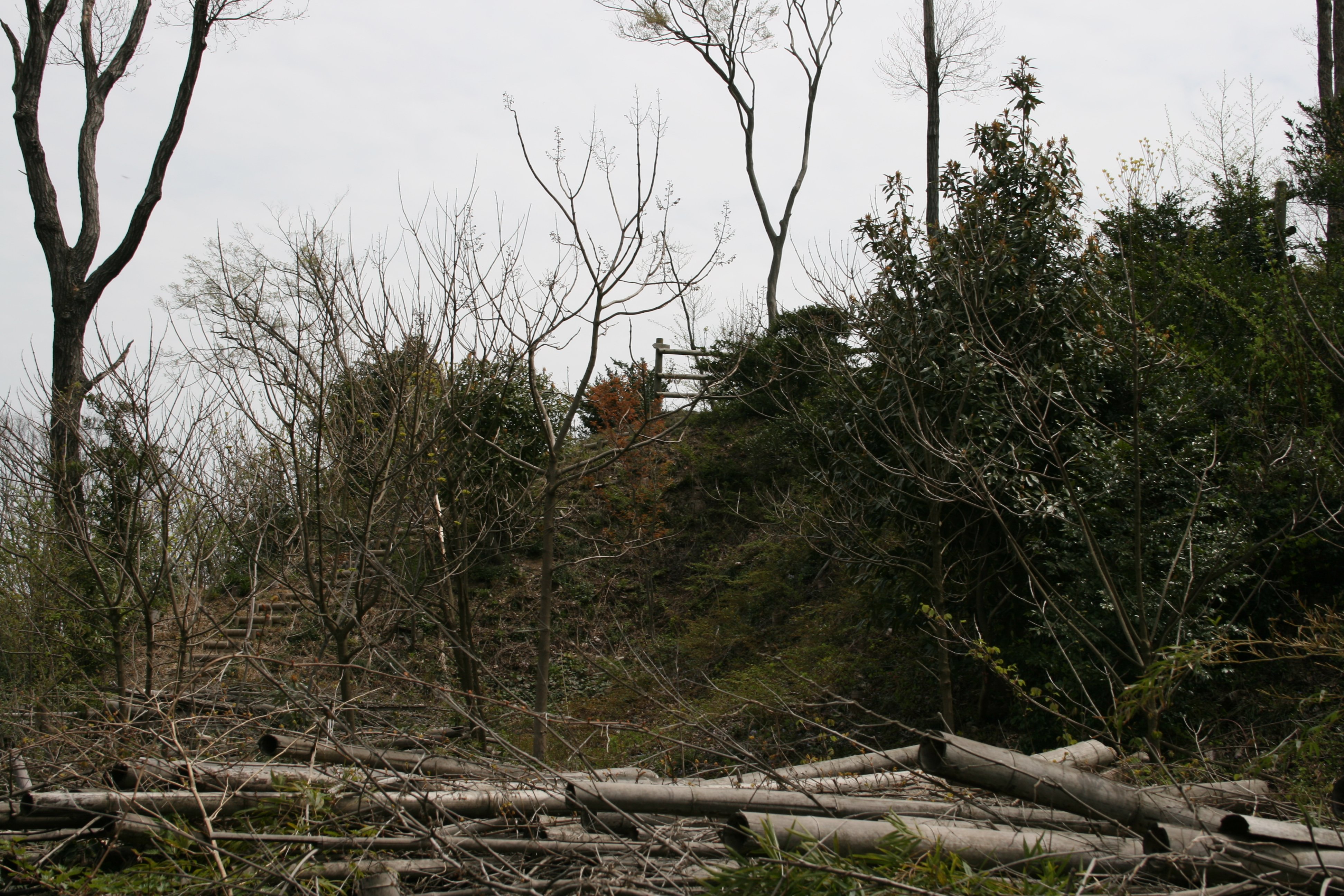 堅田城の縄張りは、西から階段状に5つの郭が連郭式に配置されていて、東側の4つ目の郭が主郭となっていて、その中でも土塁がやや高くなっているところに四等三角点があり、その標高は113.3mで最高地点となっています。主郭は約50m×30mという規模で最も広い郭です。主郭の削平状態は、ややいい加減という気もしますが、おそらくは自然の地形にやや手を入れただけというところが。しかし周囲の一部には土塁の形跡が残っています。