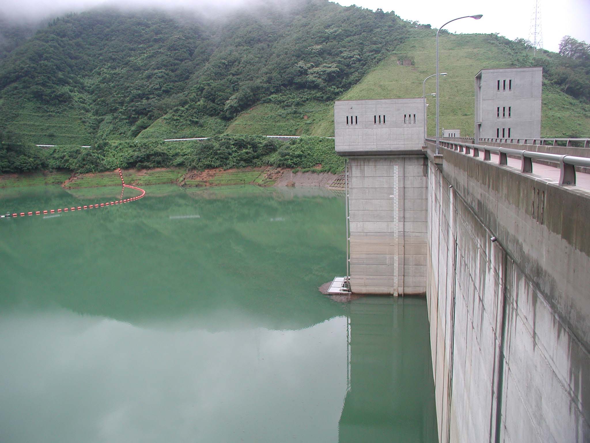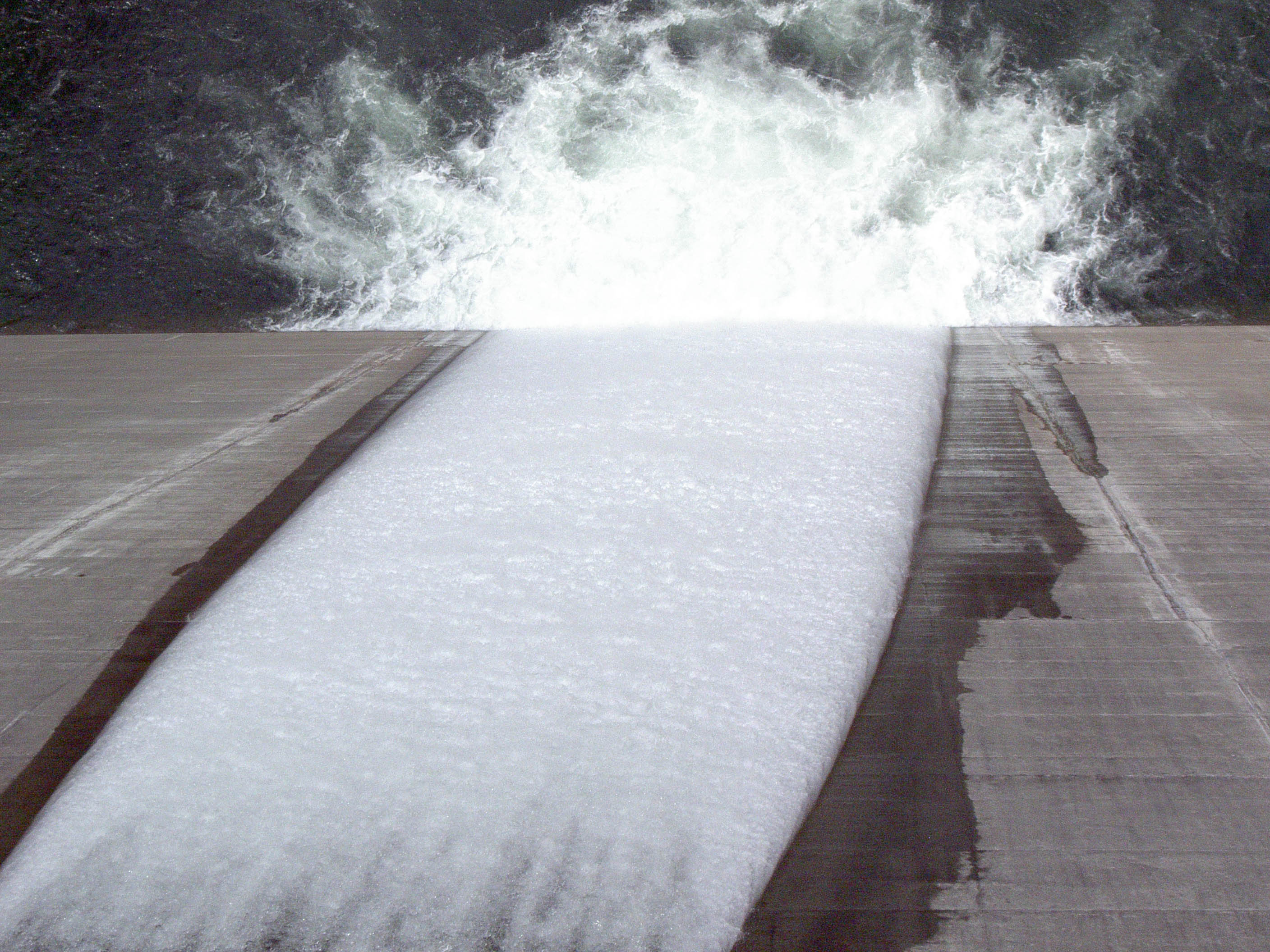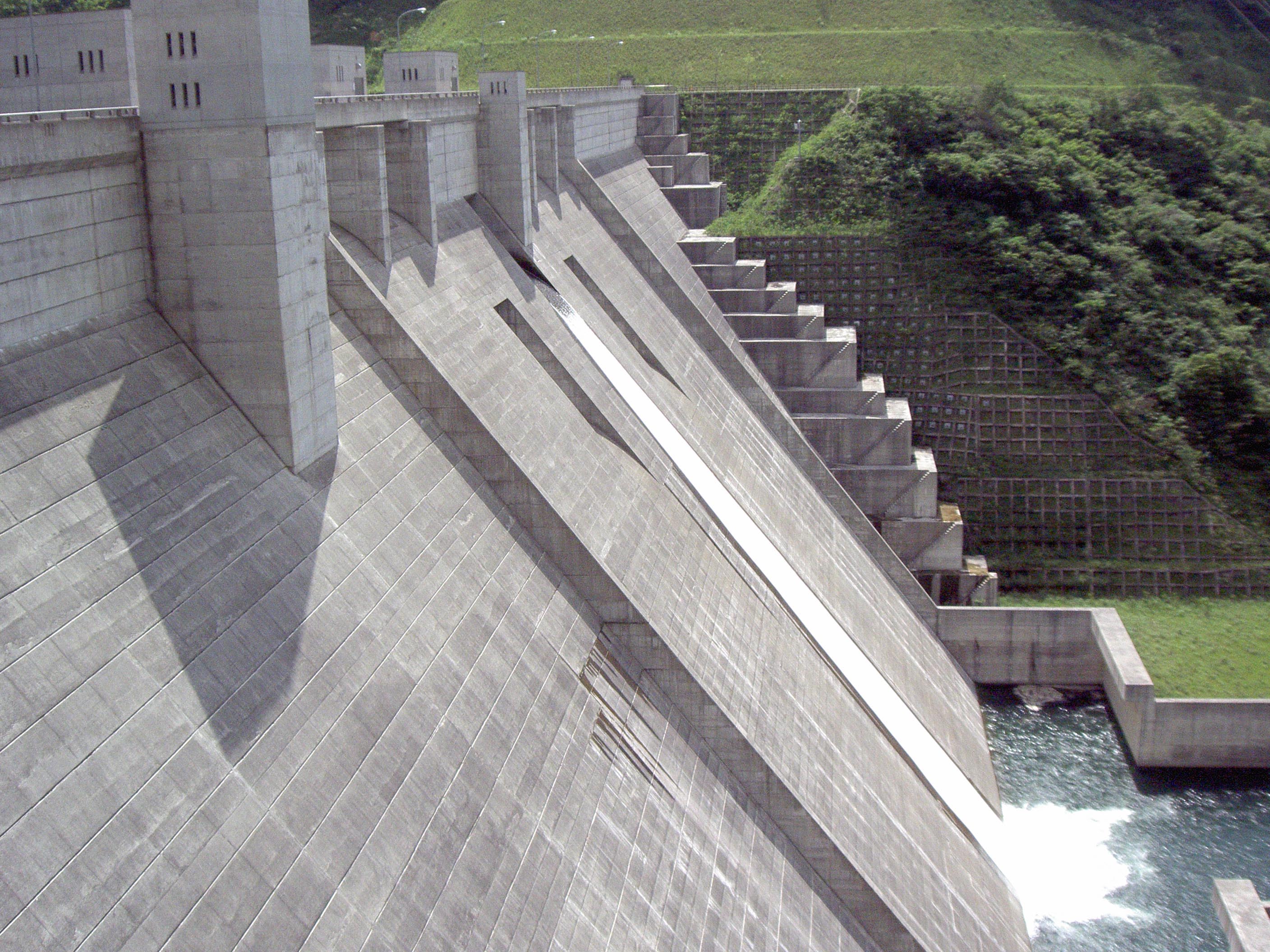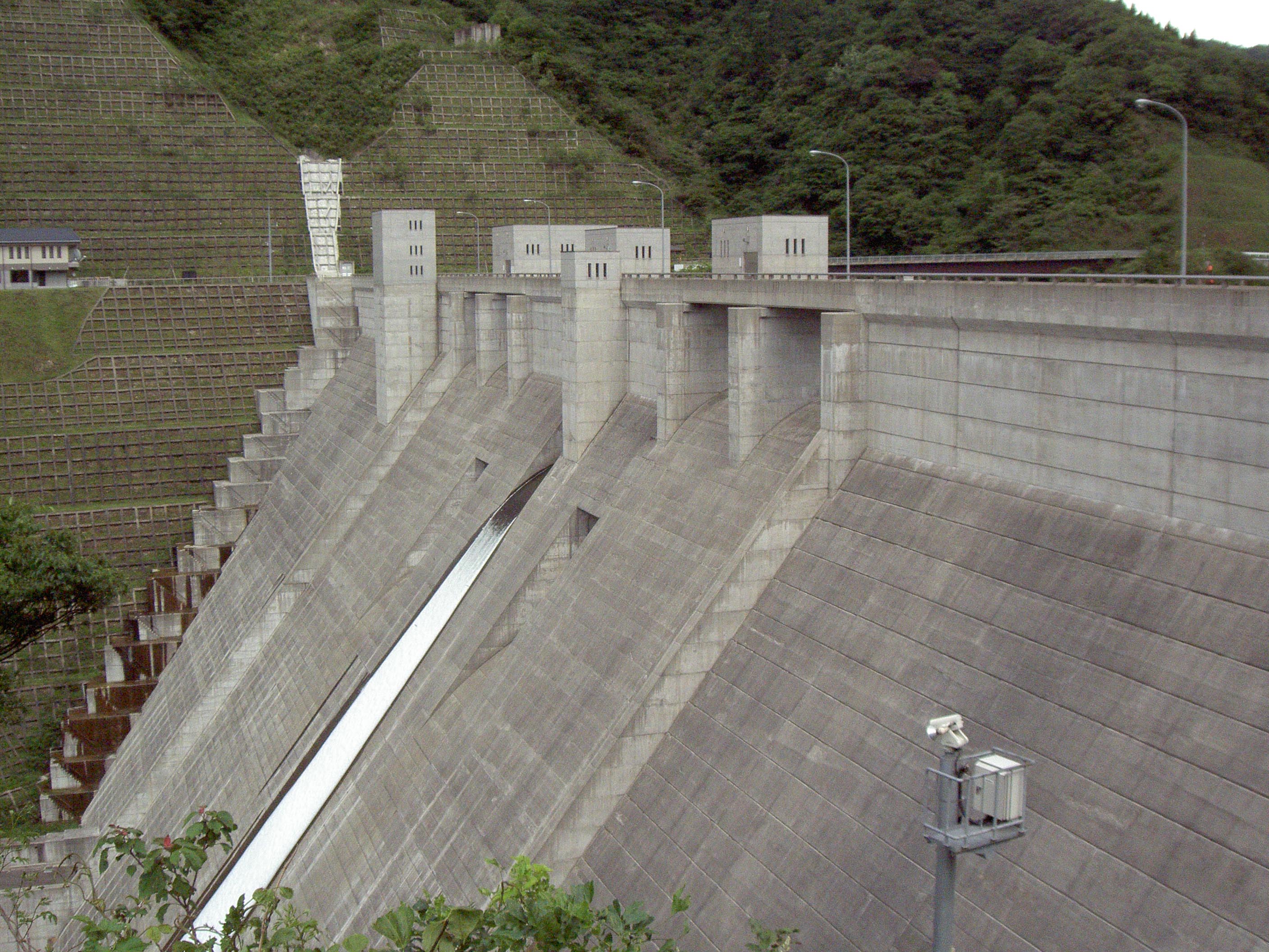 下流側から見ると、常用洪水吐が2門と非常用洪水吐が4門、さらに余水吐が1門あることが確認できます。