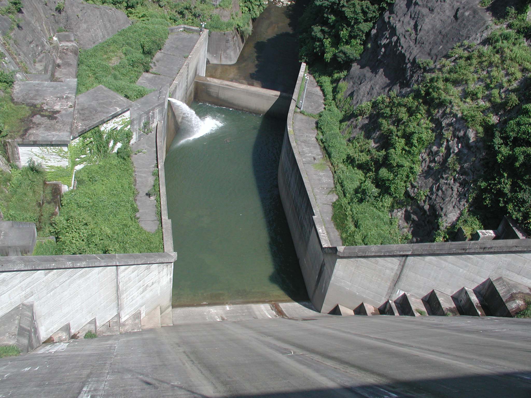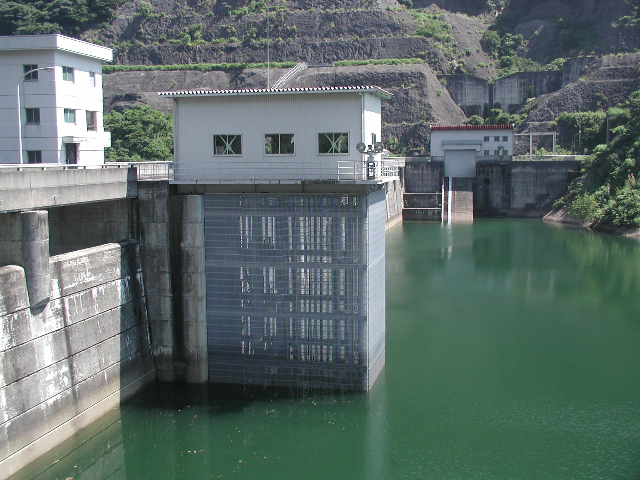 堤体上から導流部を眺める 上流側から選択取水塔を眺める
