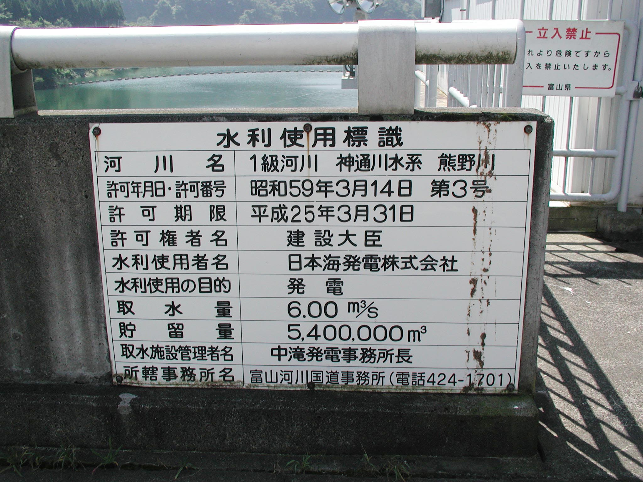 このダムの目的のひとつに富山市への上水道用水確保があったのですが、上水道需要の頭打ちで現在もここから上水道用水の取水は行われていません。