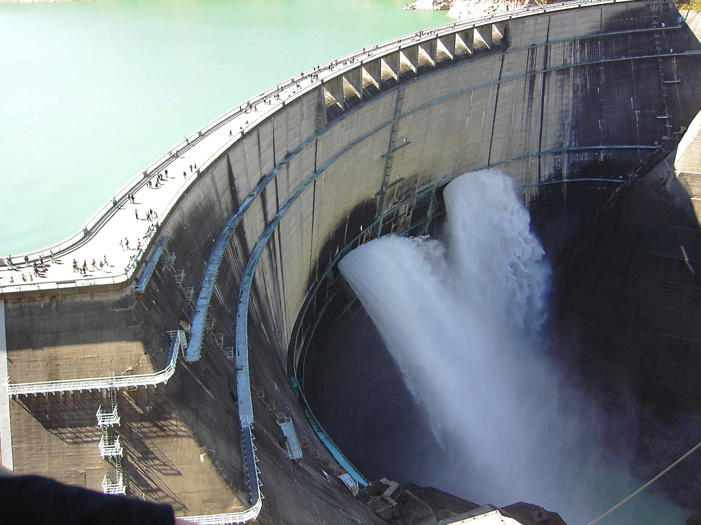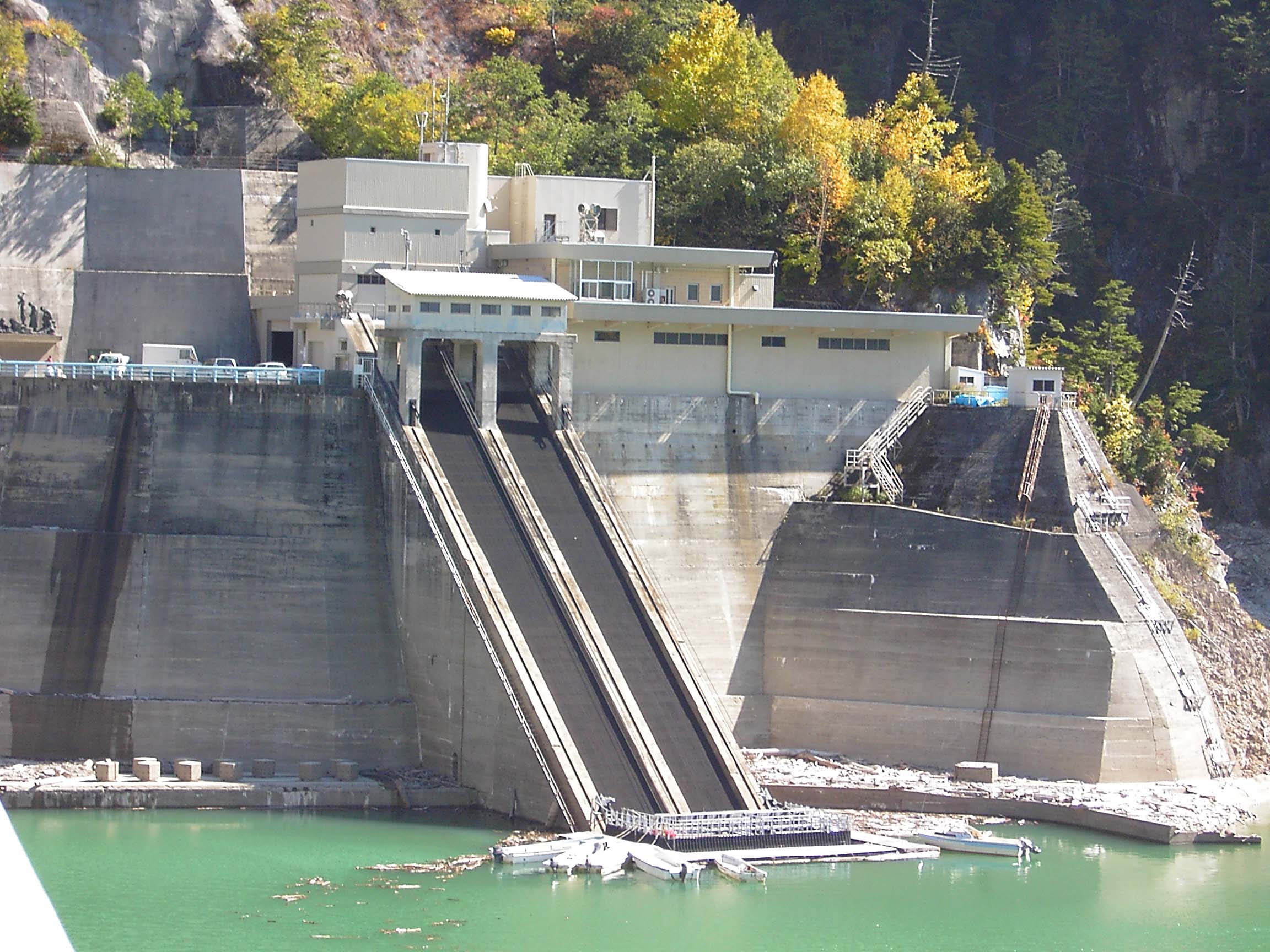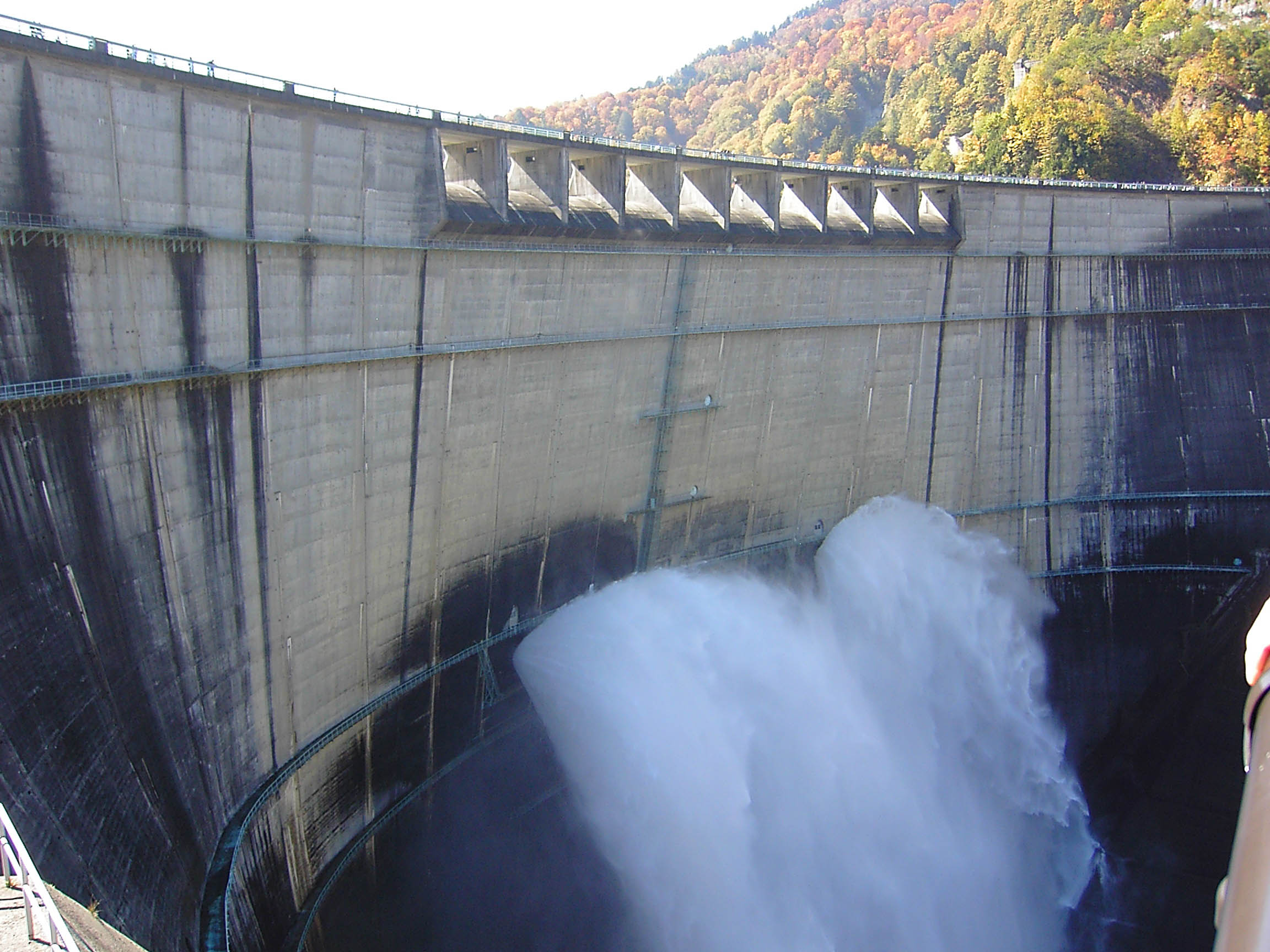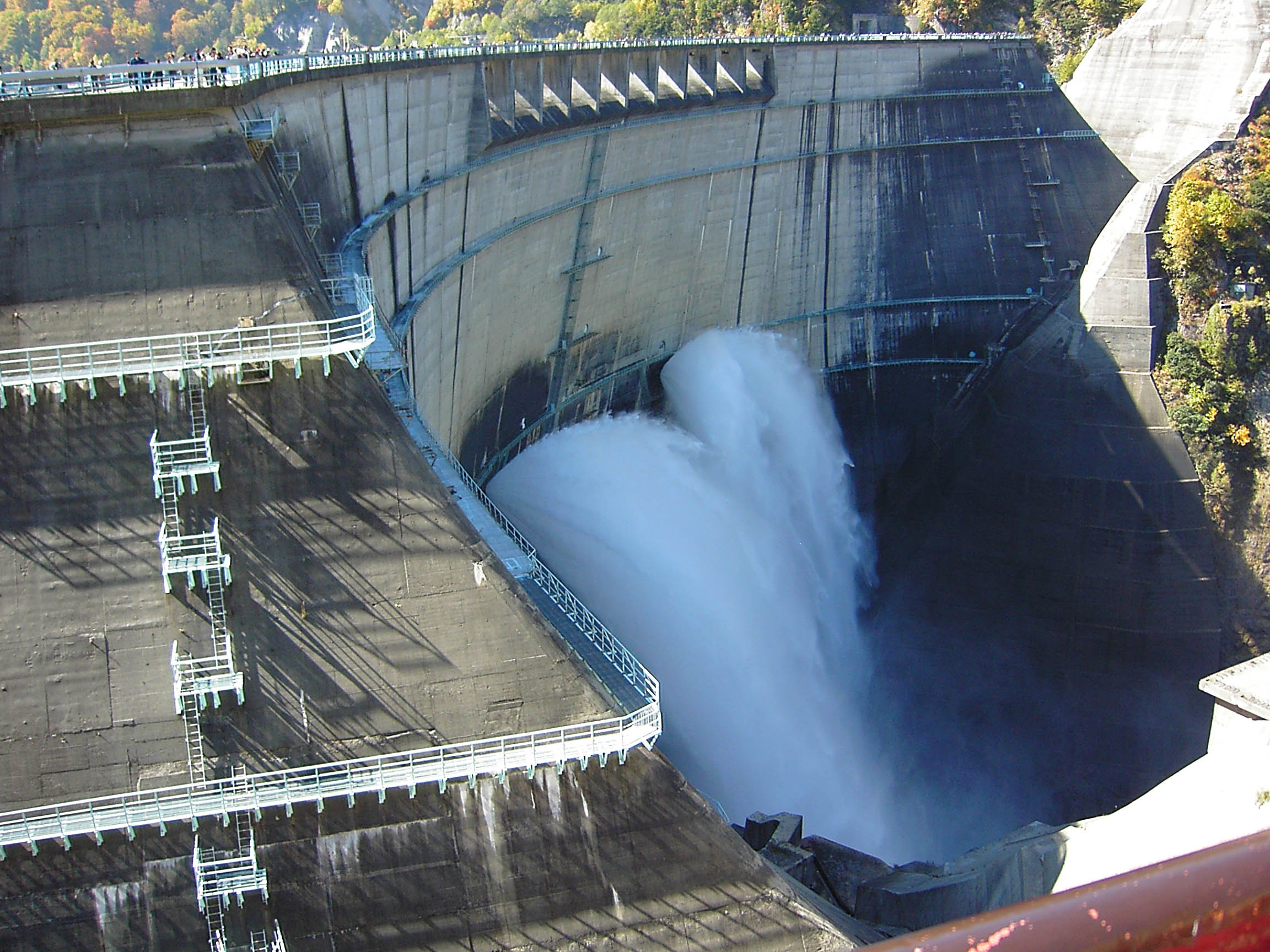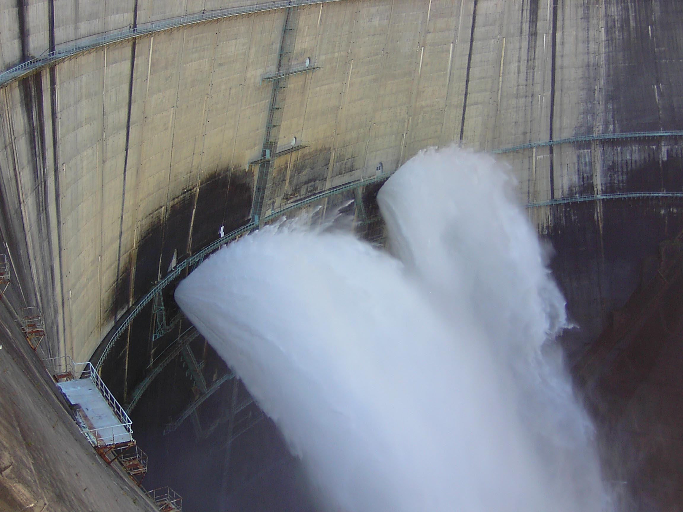 黒部ダムは、発電専用ダムなので放流設備はごく単純なのですが、クレストゲートは自然越流式洪水吐が10門と放流管としてハウエルバンガーバルブが高水位用に2門、中水位用に2門、低水位用に1門、装備しています。