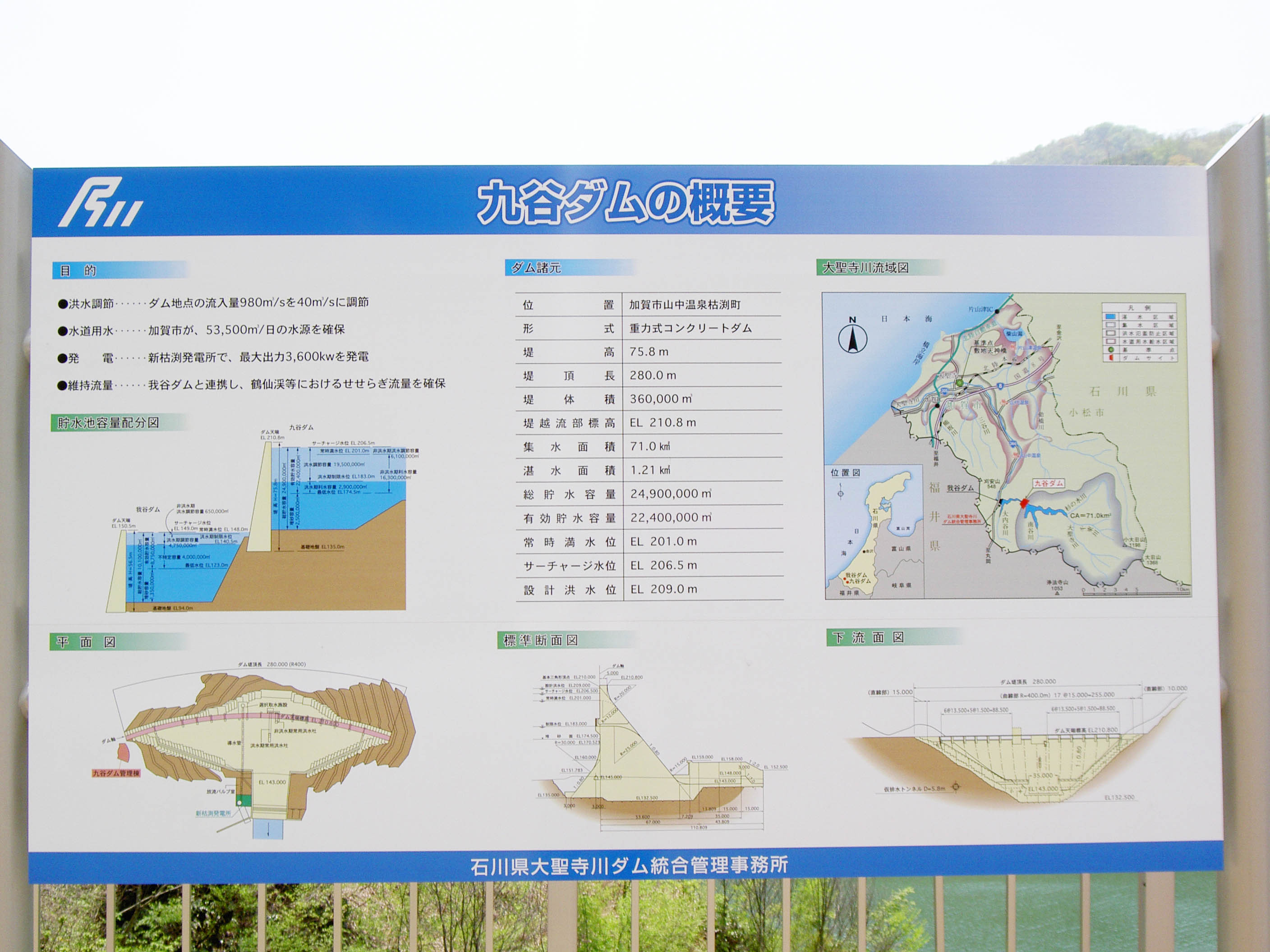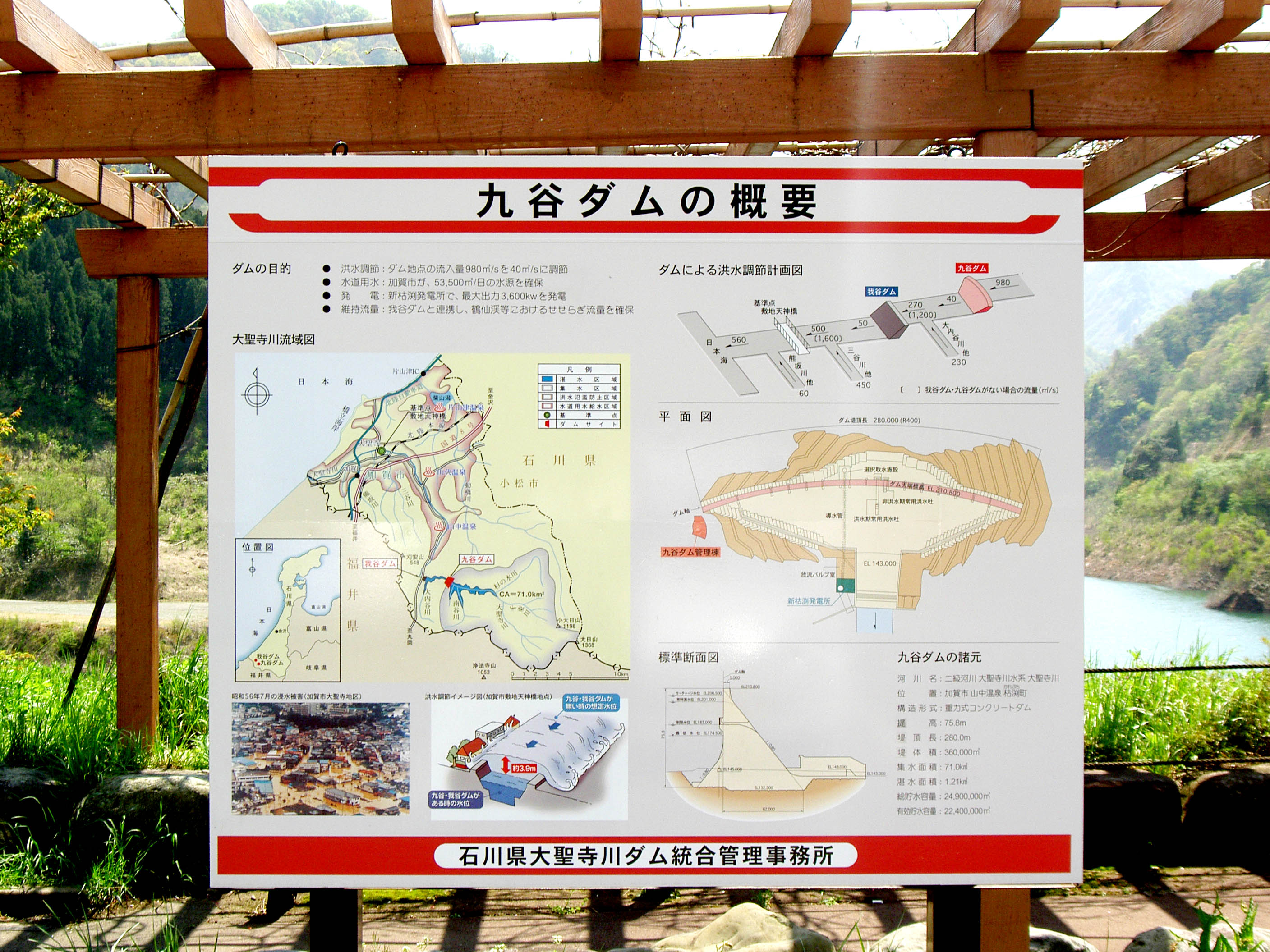 九谷ダムは、石川県が管理する多目的ダムです。洪水調節、上水道用水、発電の目的で建設されました。