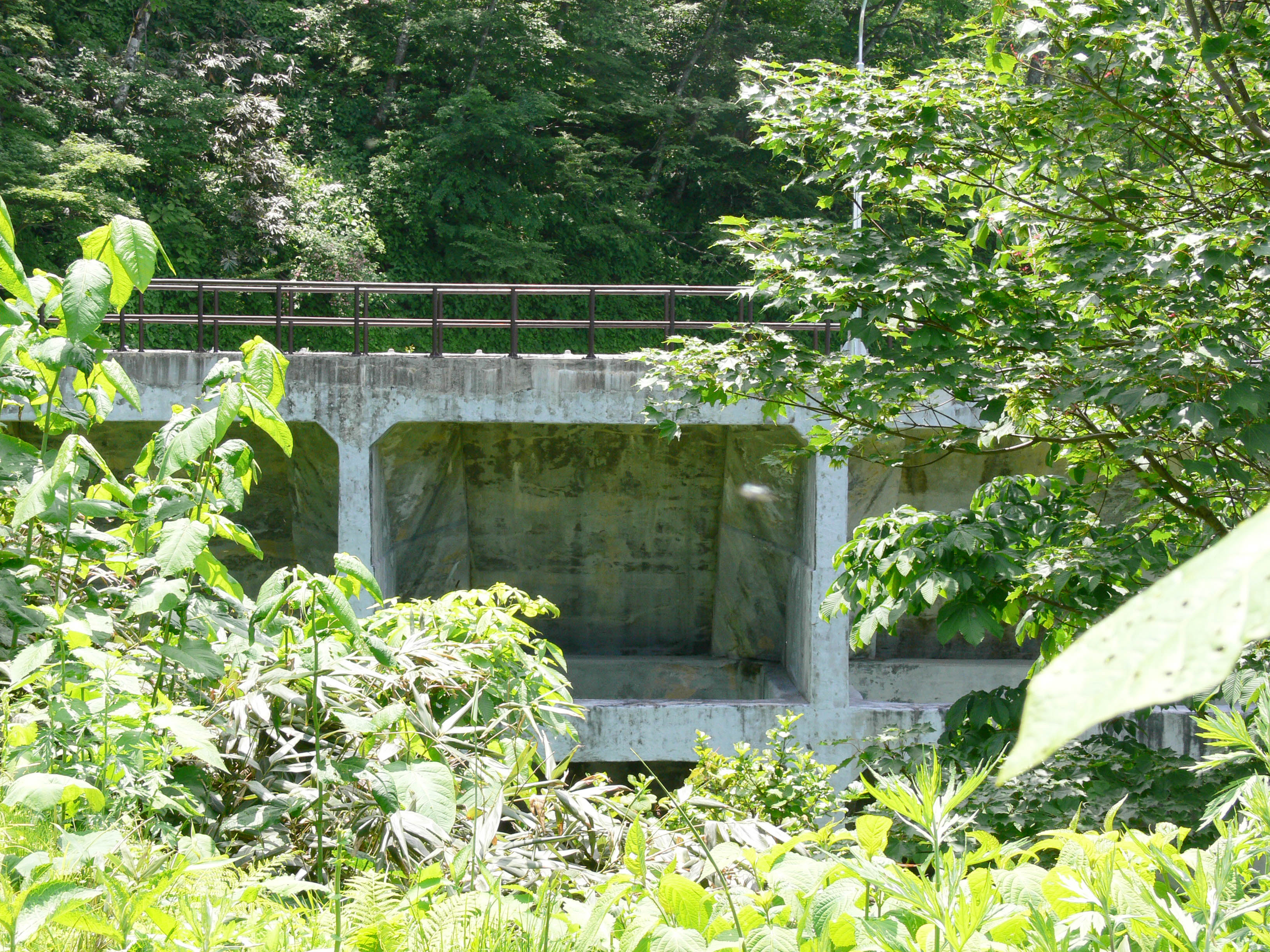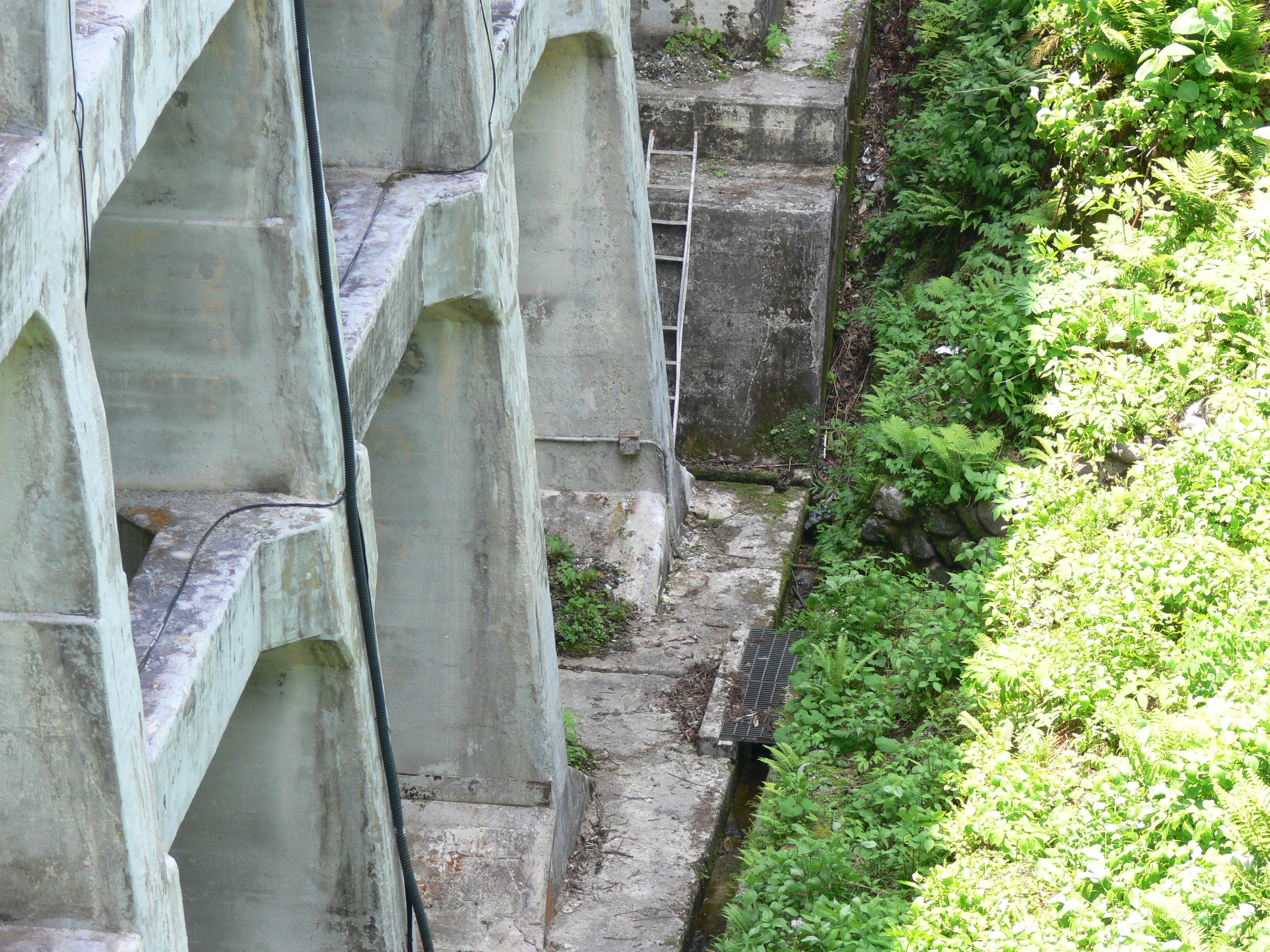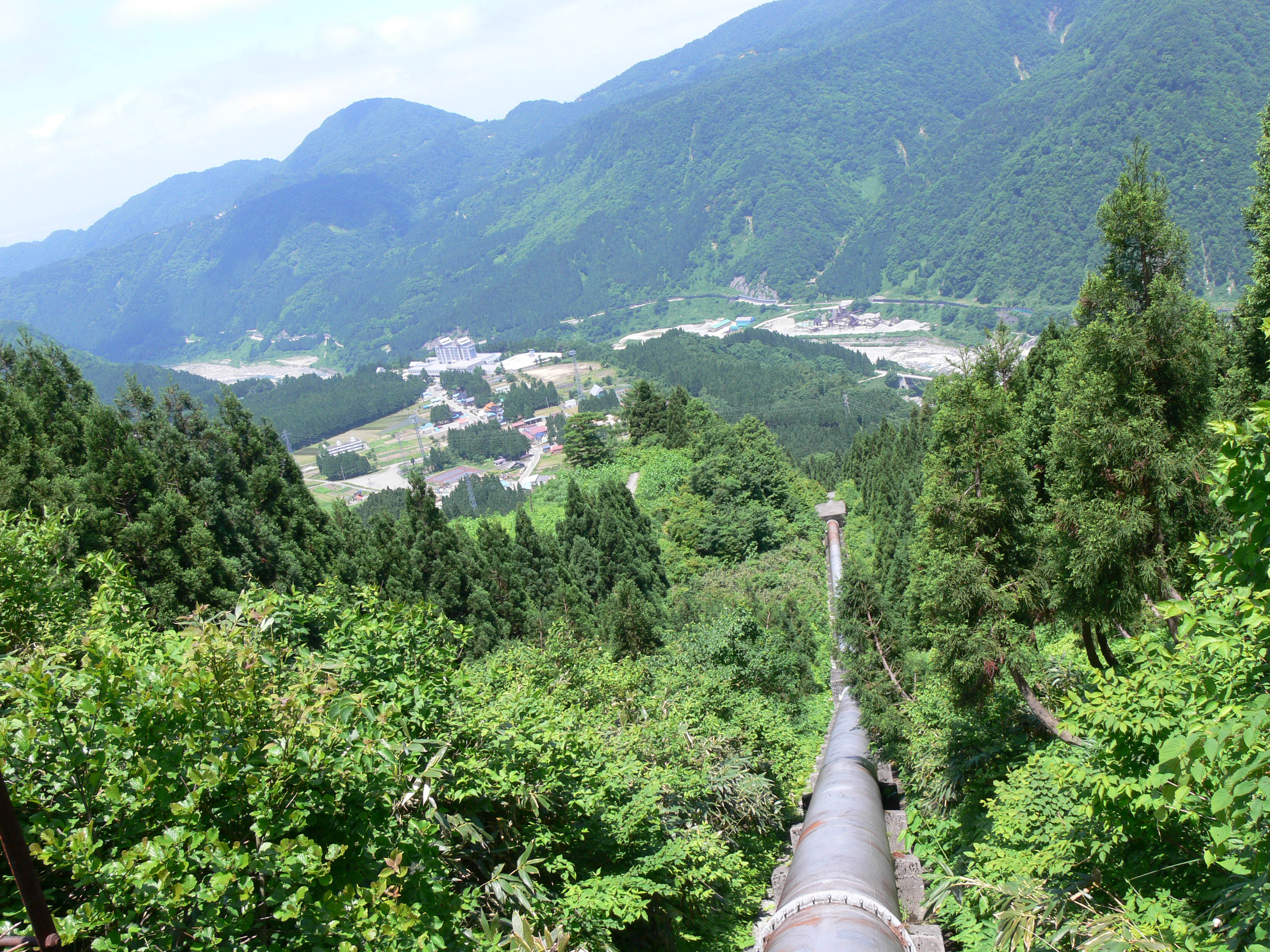 水圧鉄管を跨ぐ橋の上から下界を見下ろします ここまで来ればあと少しです