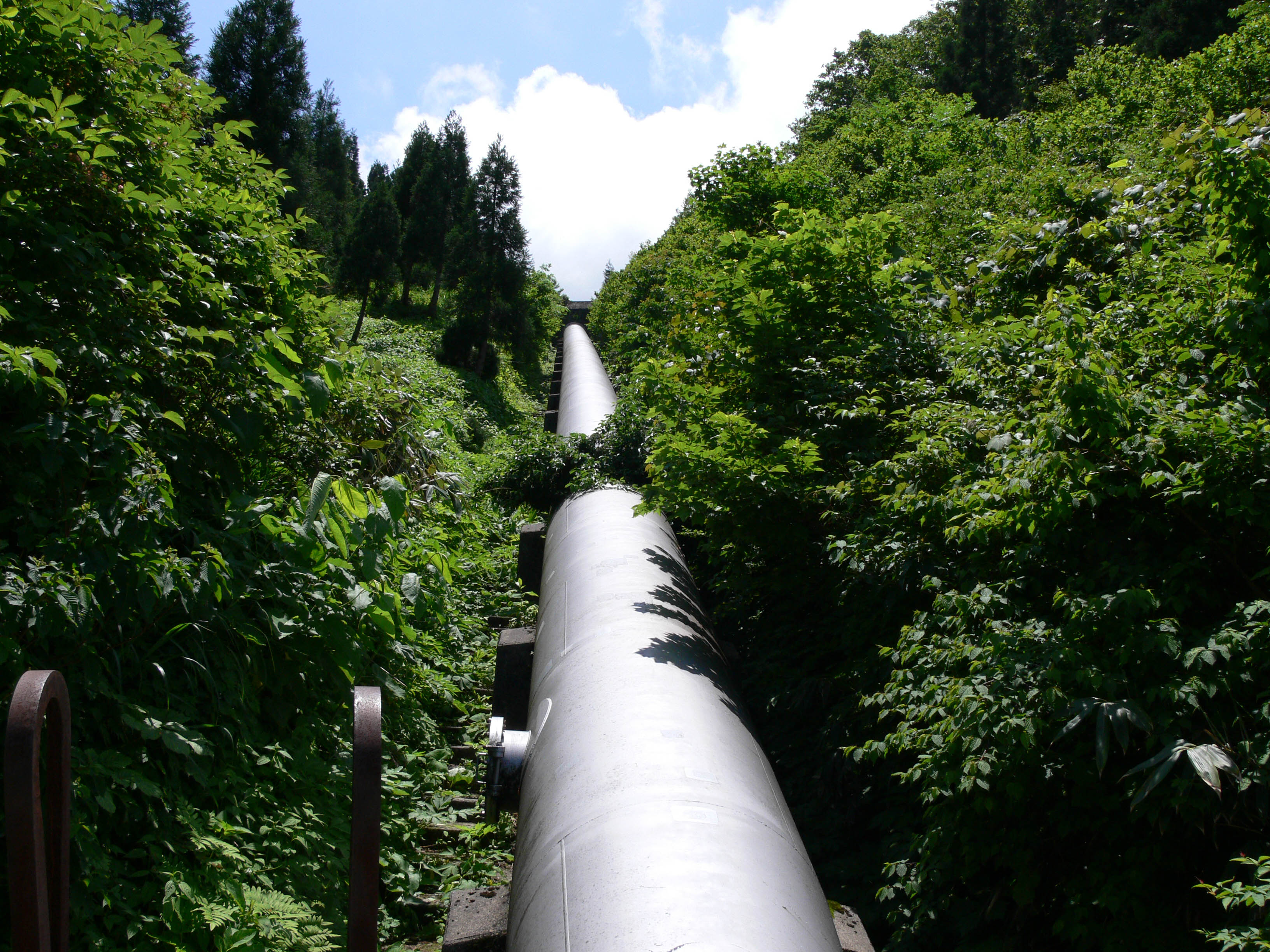 さらに急勾配の坂道を登ります 真川調整池からの水圧鉄管の上をまたぎます