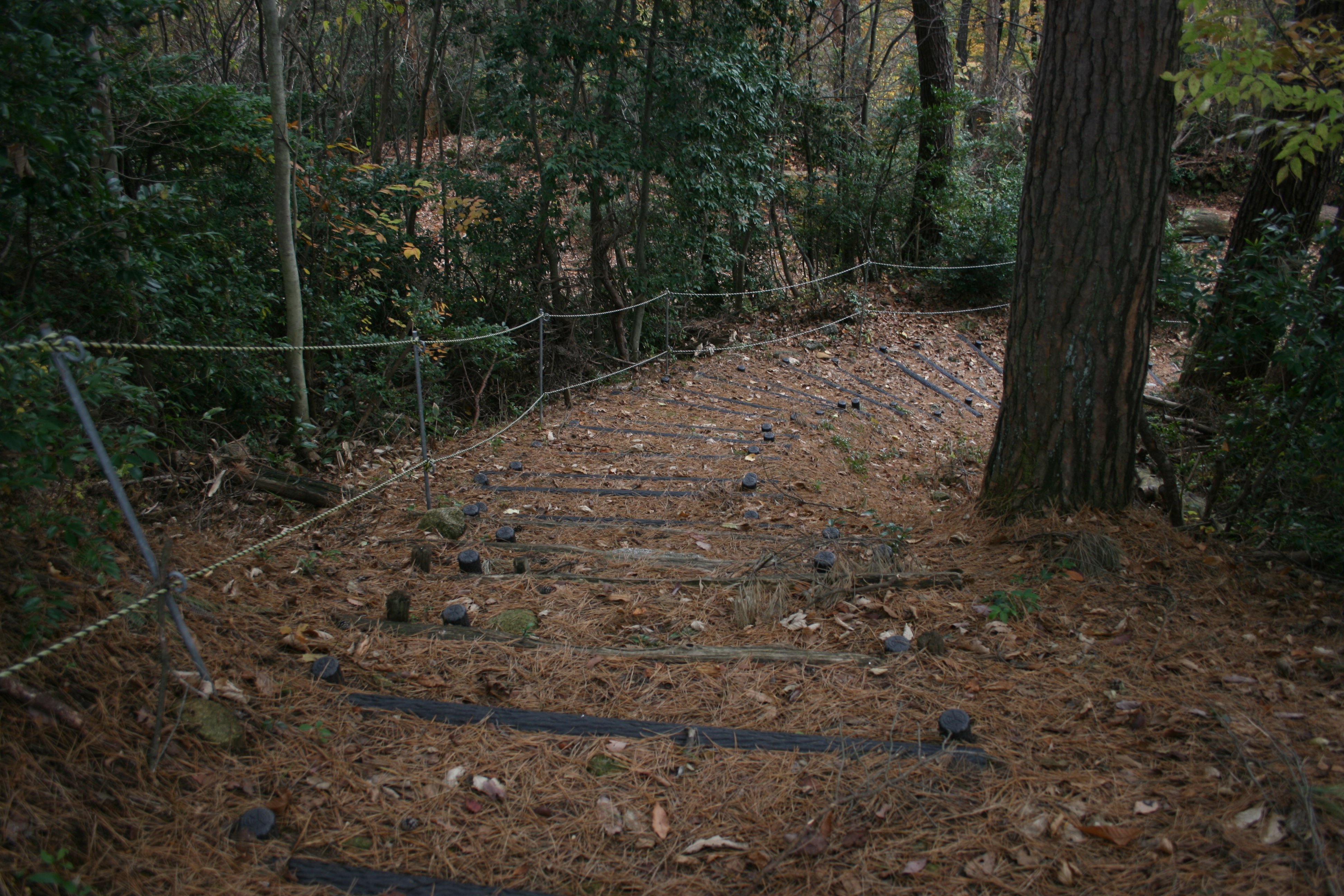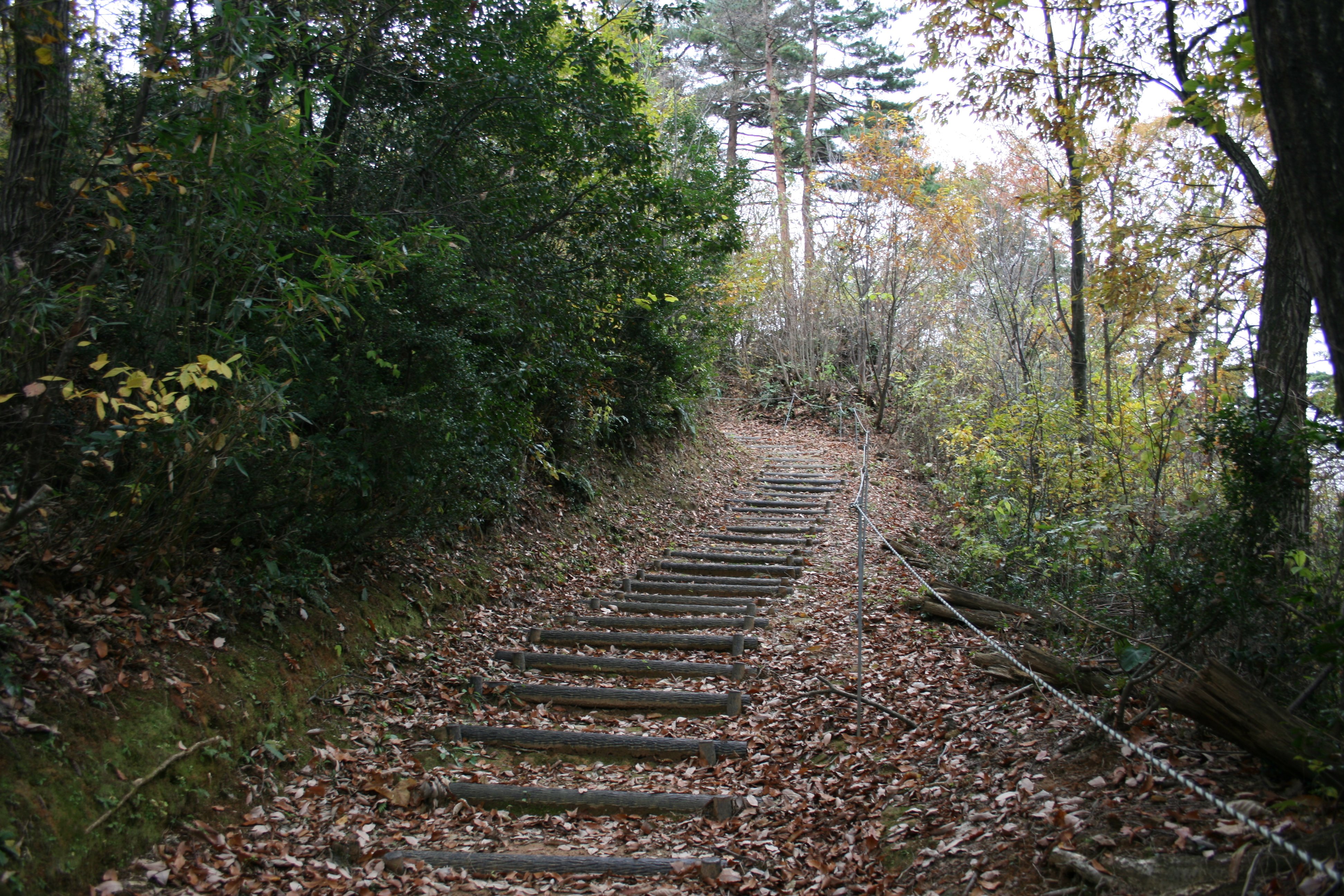 | 二の丸からの搦手道は急な上に曲がりくねっています |