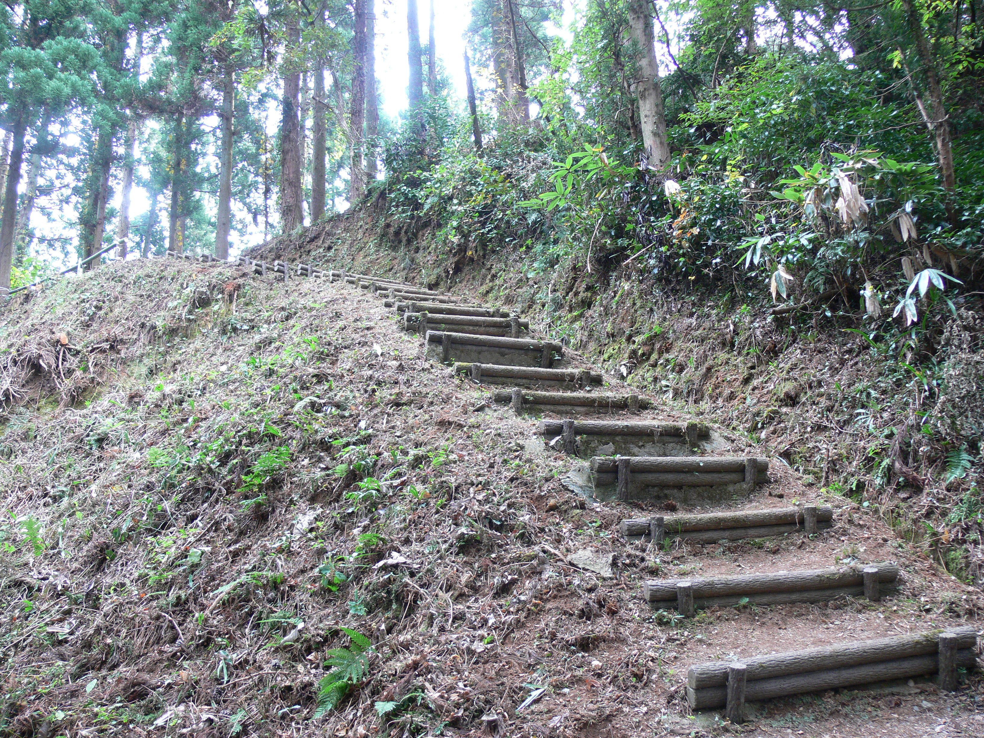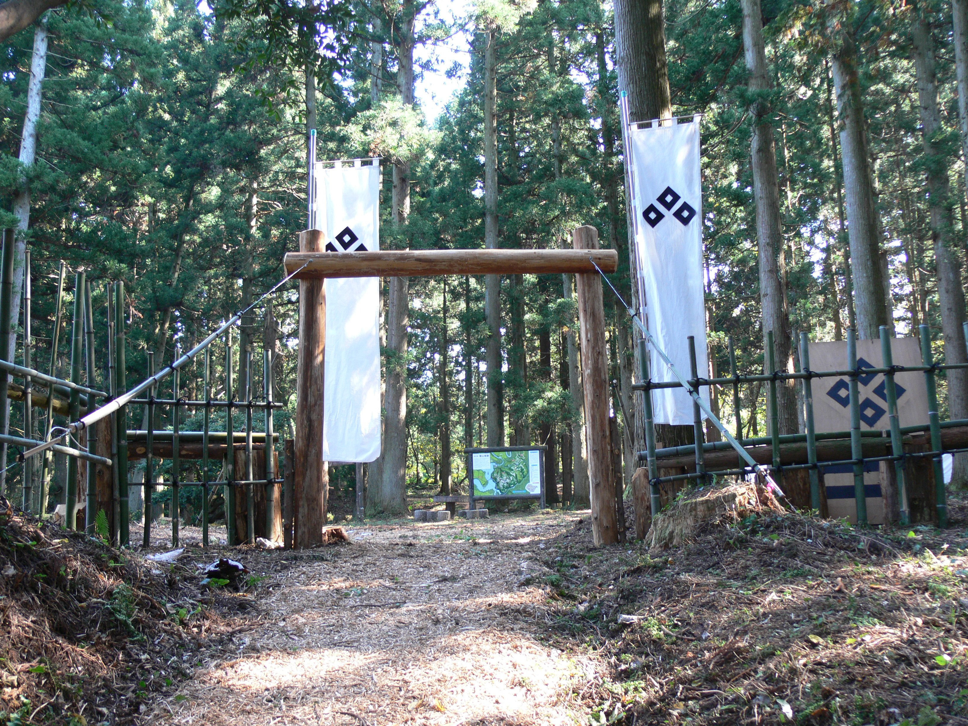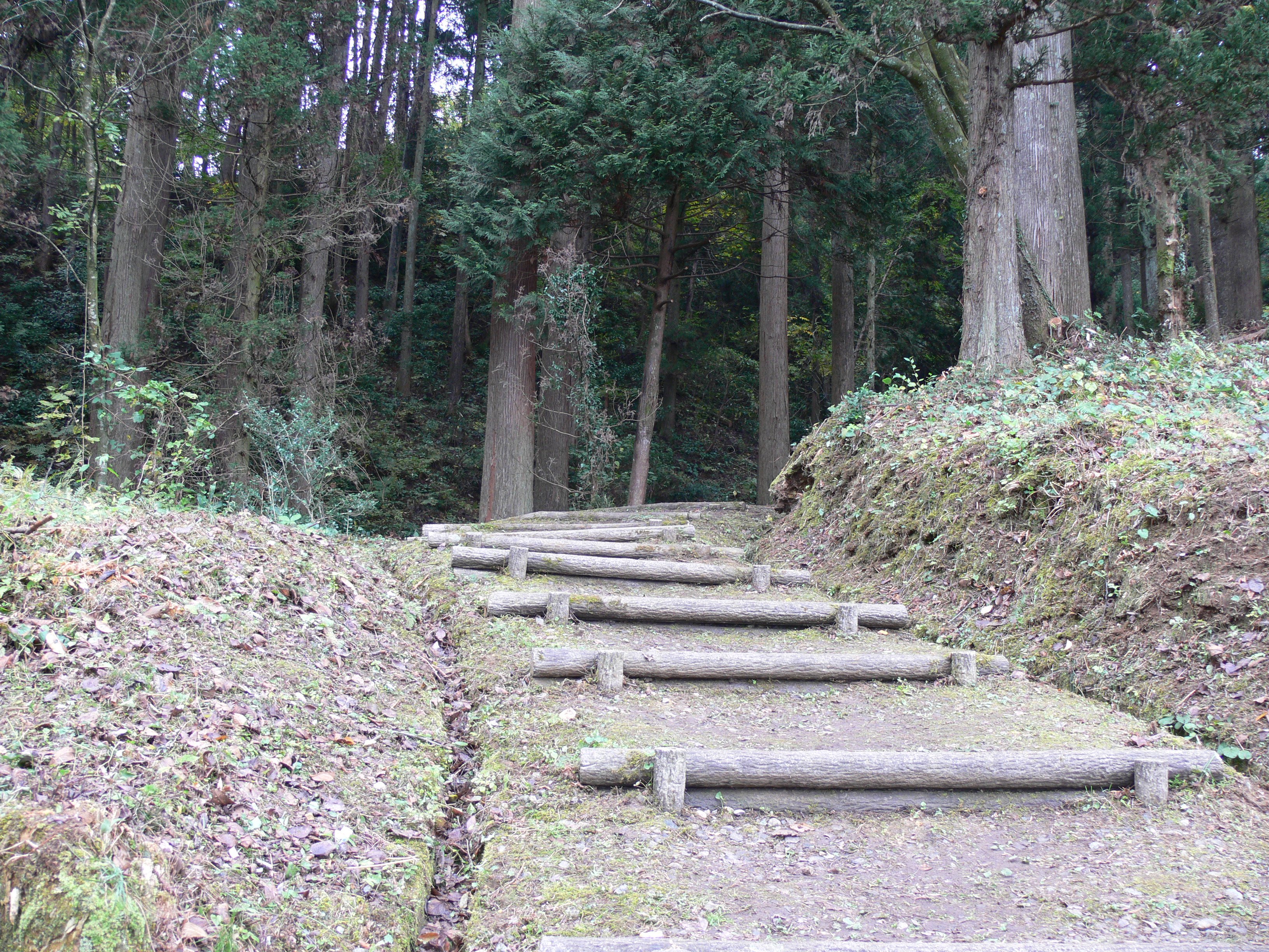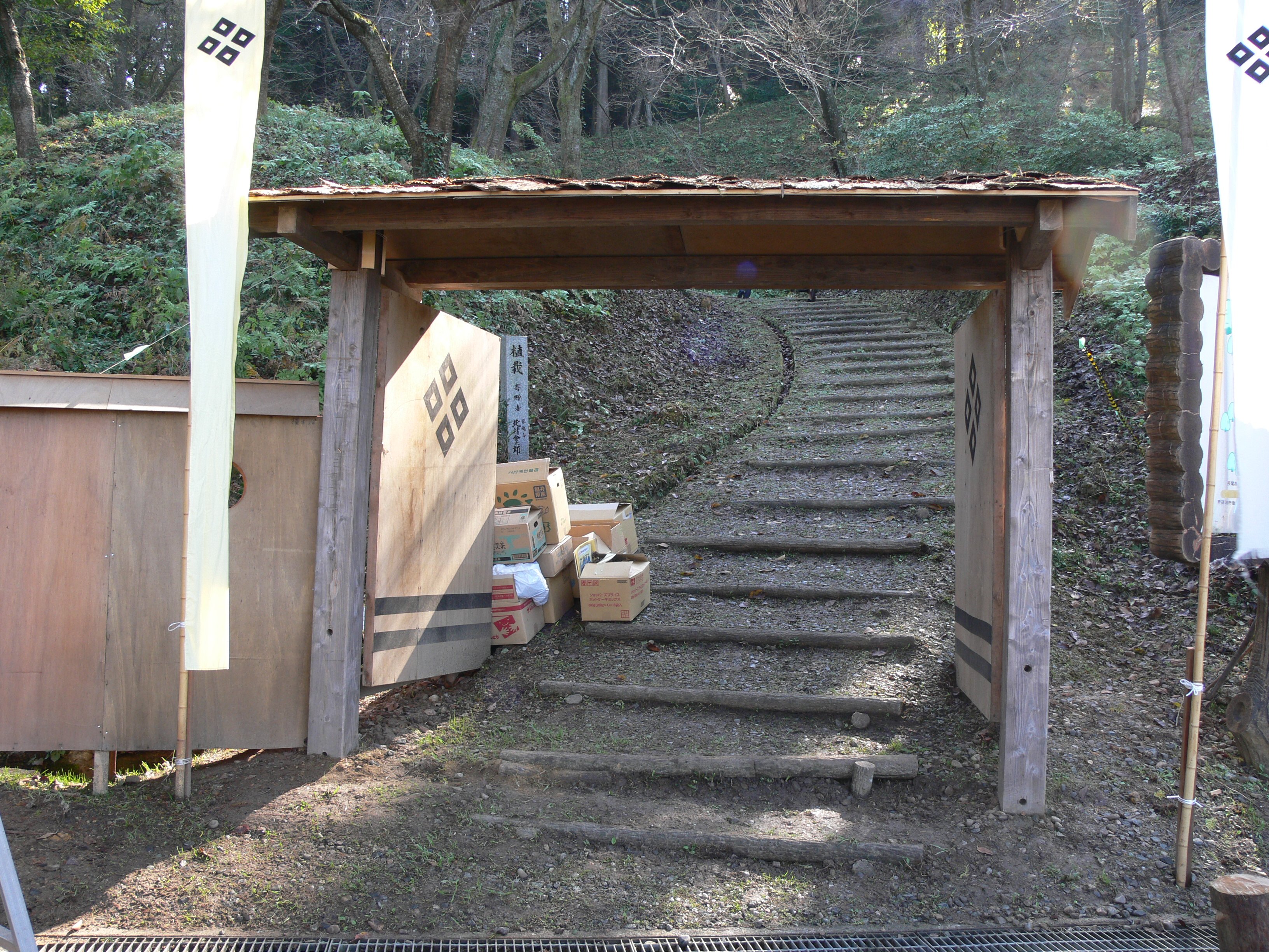 ウラナギ口には手前に駐車スペースがありますので、普通の人はこちらから入り込みます。ただし、ここからの登りはけっこうきついところもありますが、最近では整備されて足元が悪いということはなくなったようです。途中には堀切があったり小規模ながらF郭があったりと見所が多いのですが、勾配自体はずっと登りですので一の丸への入り口まできたときにはフラフラになっている人もいるかも知れません。これでは城攻めも楽じゃないですね。二の丸への迂回ルートの入口には冠木門が設置されていますが、確かにここに門がないと無防備なのです。ただ、七曲がり口からのルートとの合流点から一の丸へ入る階段がありますが、これは当時はなかったのでしょう。