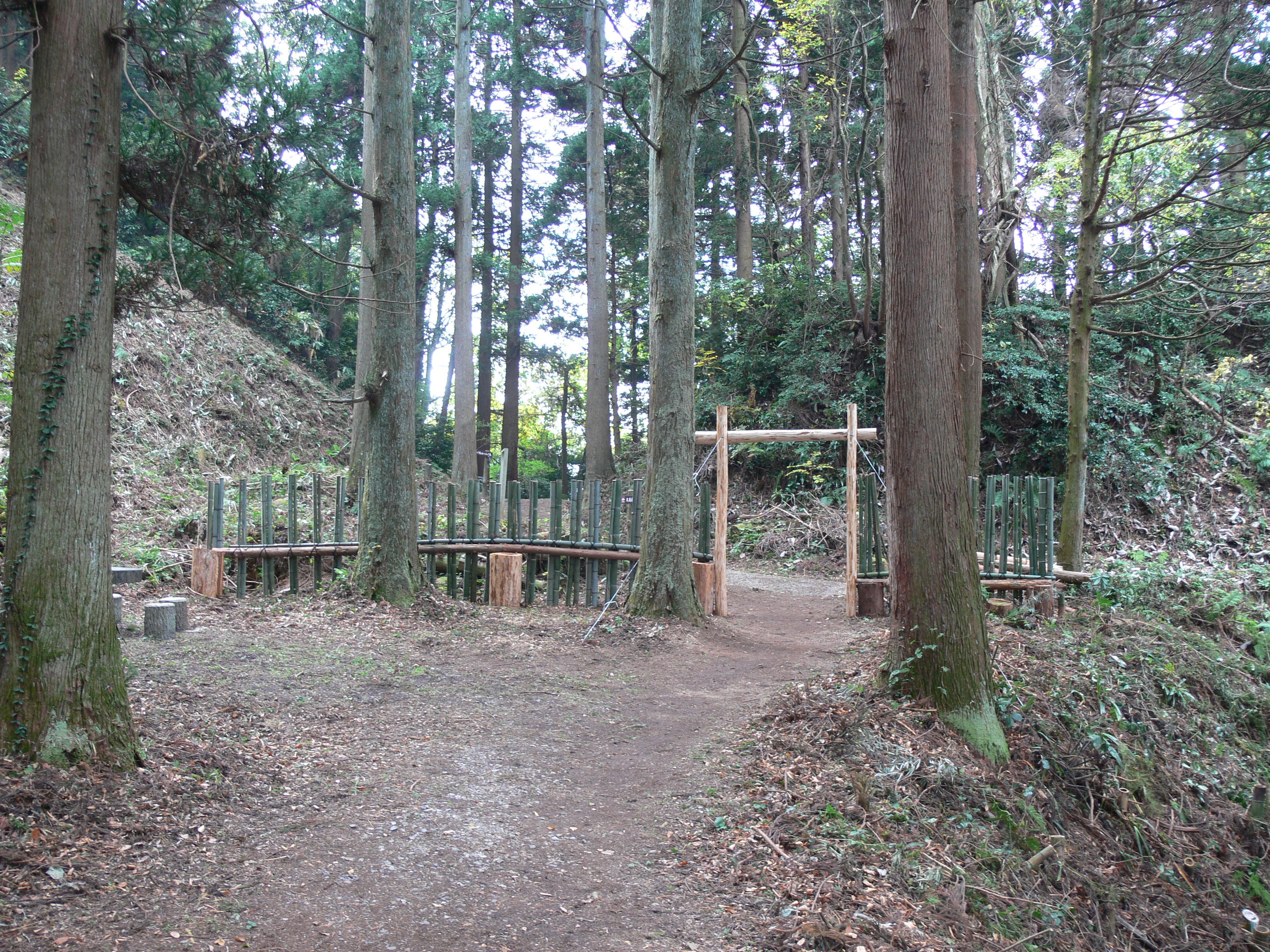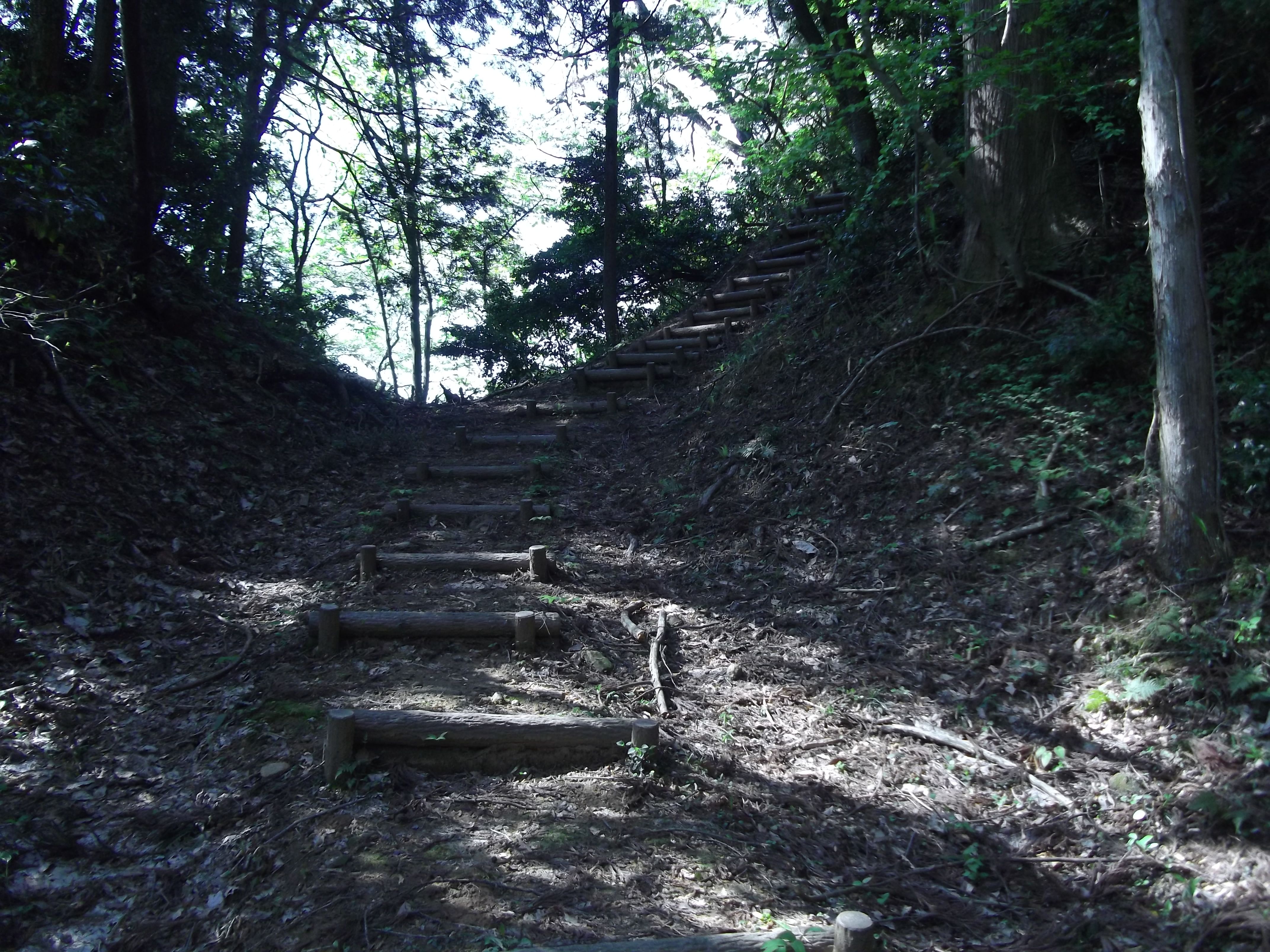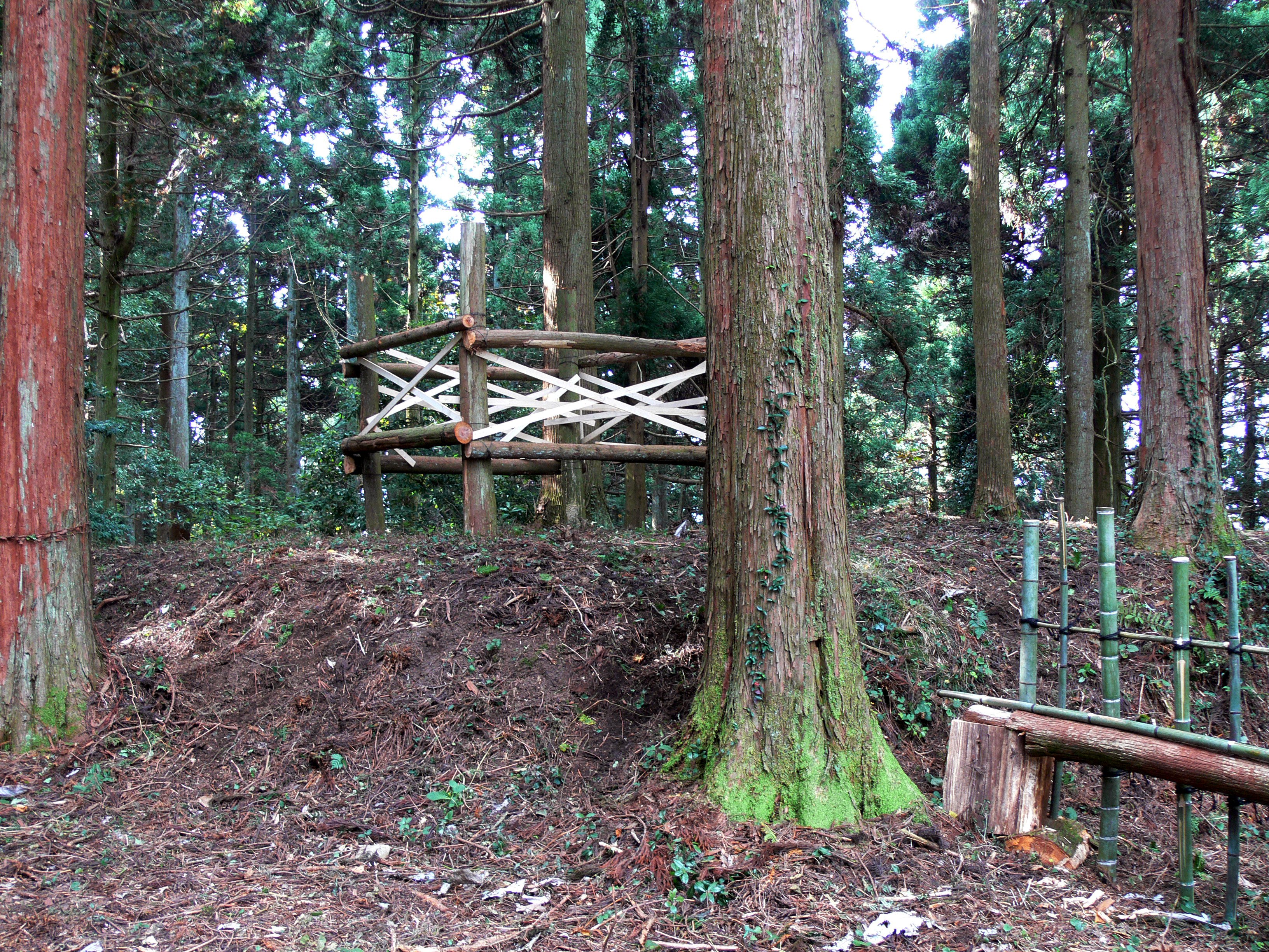 ウラナギ口には手前に駐車スペースがありますので、普通の人はこちらから入り込みます。ただし、ここからの登りはけっこうきついところもありますが、最近では整備されて足元が悪いということはなくなったようです。途中には堀切があったり小規模ながらF郭があったりと見所が多いのですが、勾配自体はずっと登りですので一の丸への入り口まできたときにはフラフラになっている人もいるかも知れません。これでは城攻めも楽じゃないですね。二の丸への迂回ルートの入口には冠木門が設置されていますが、確かにここに門がないと無防備なのです。ただ、七曲がり口からのルートとの合流点から一の丸へ入る階段がありますが、これは当時はなかったのでしょう。