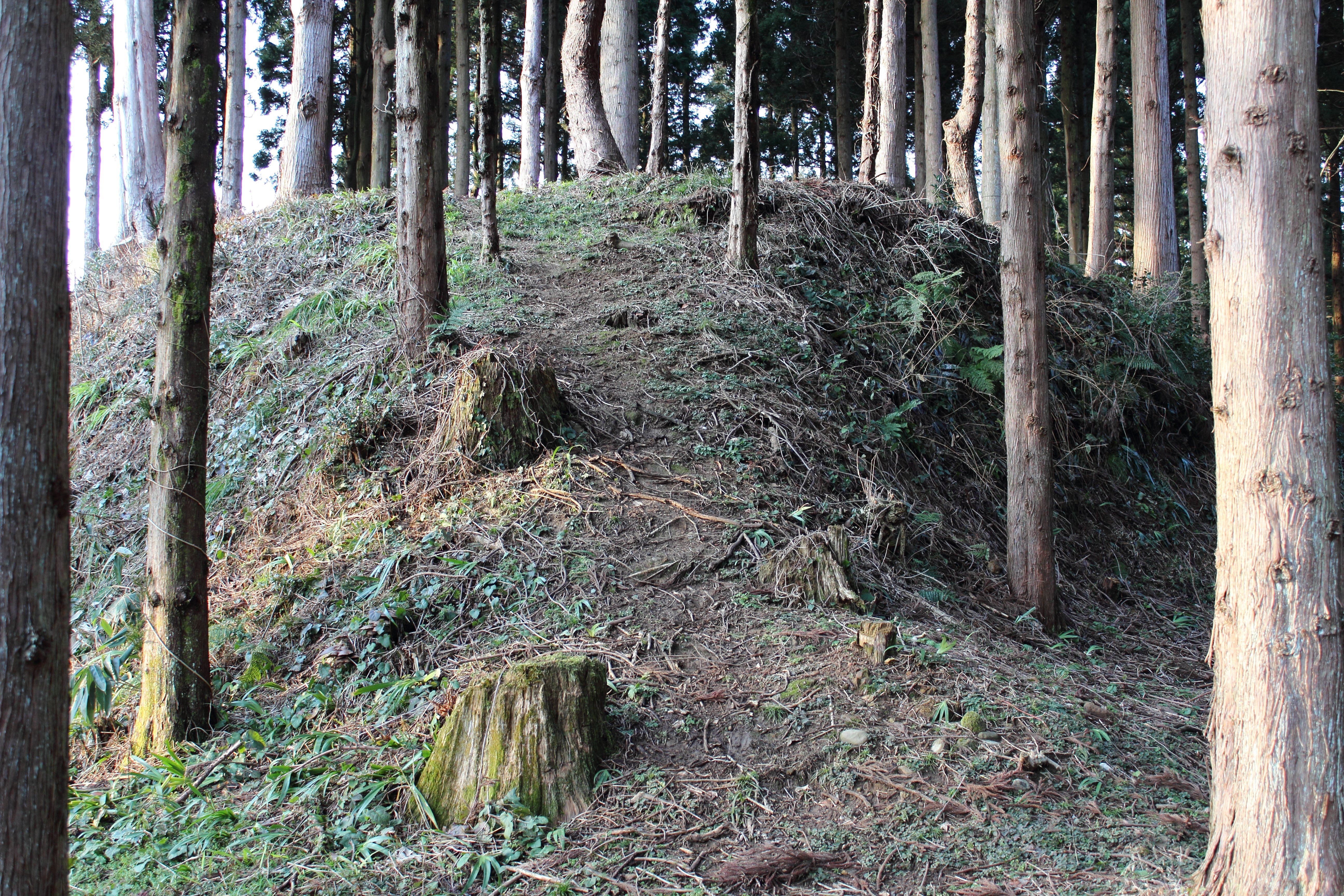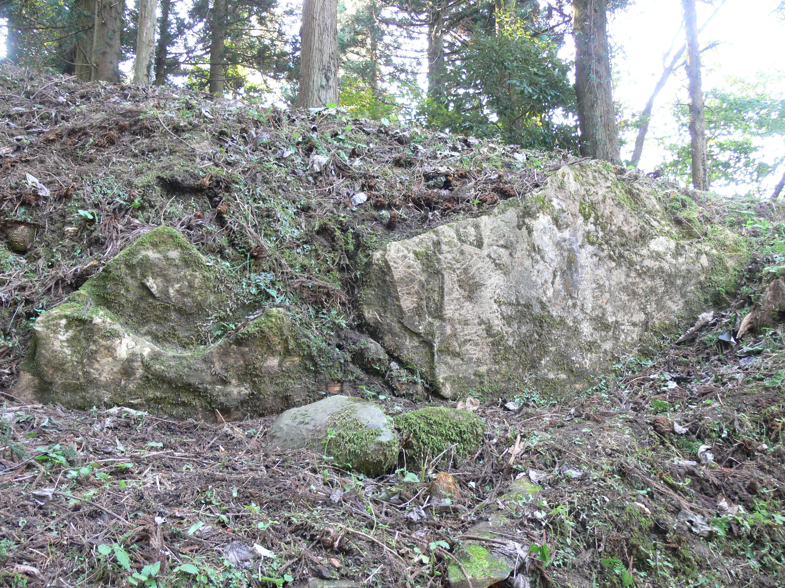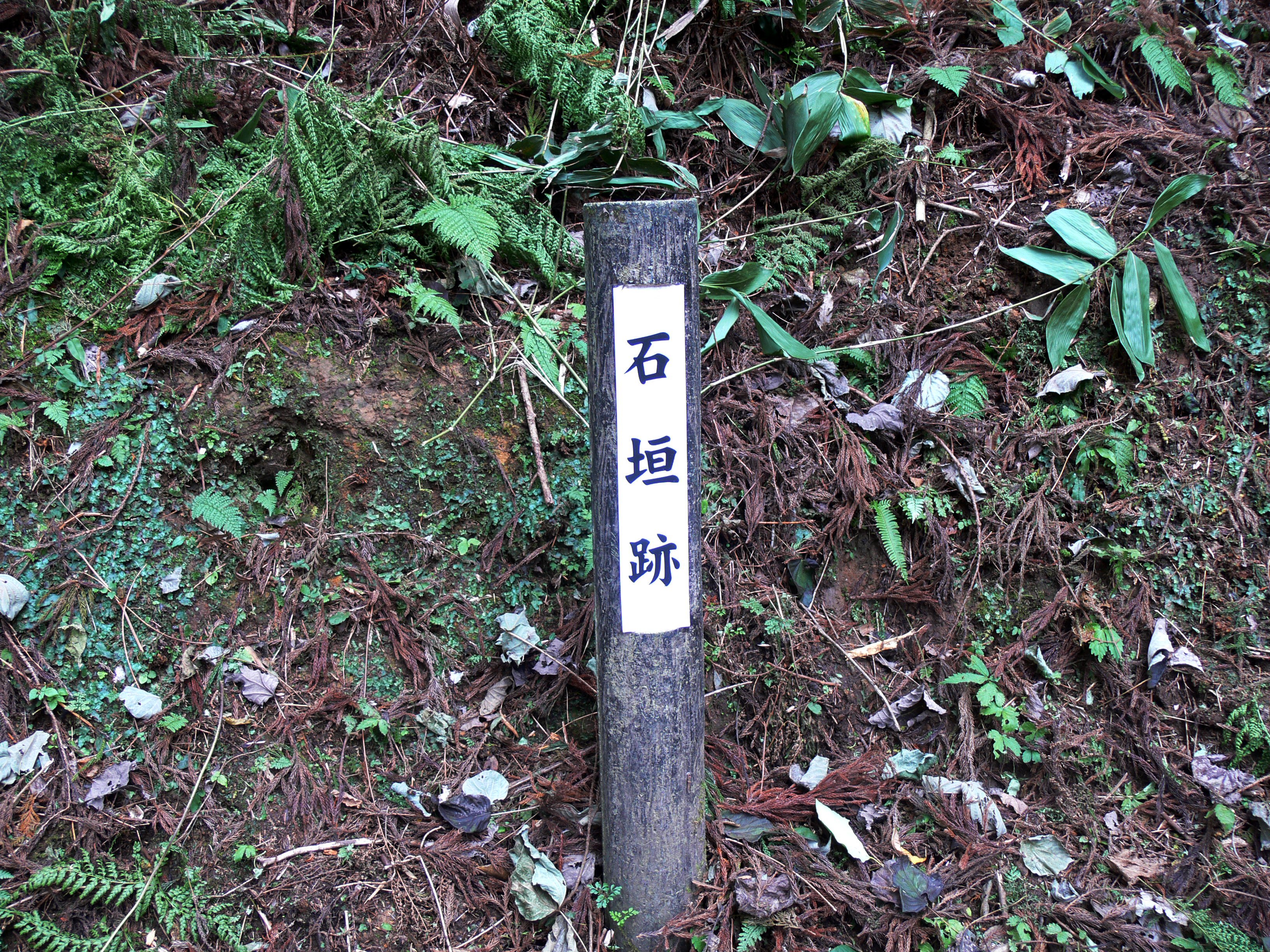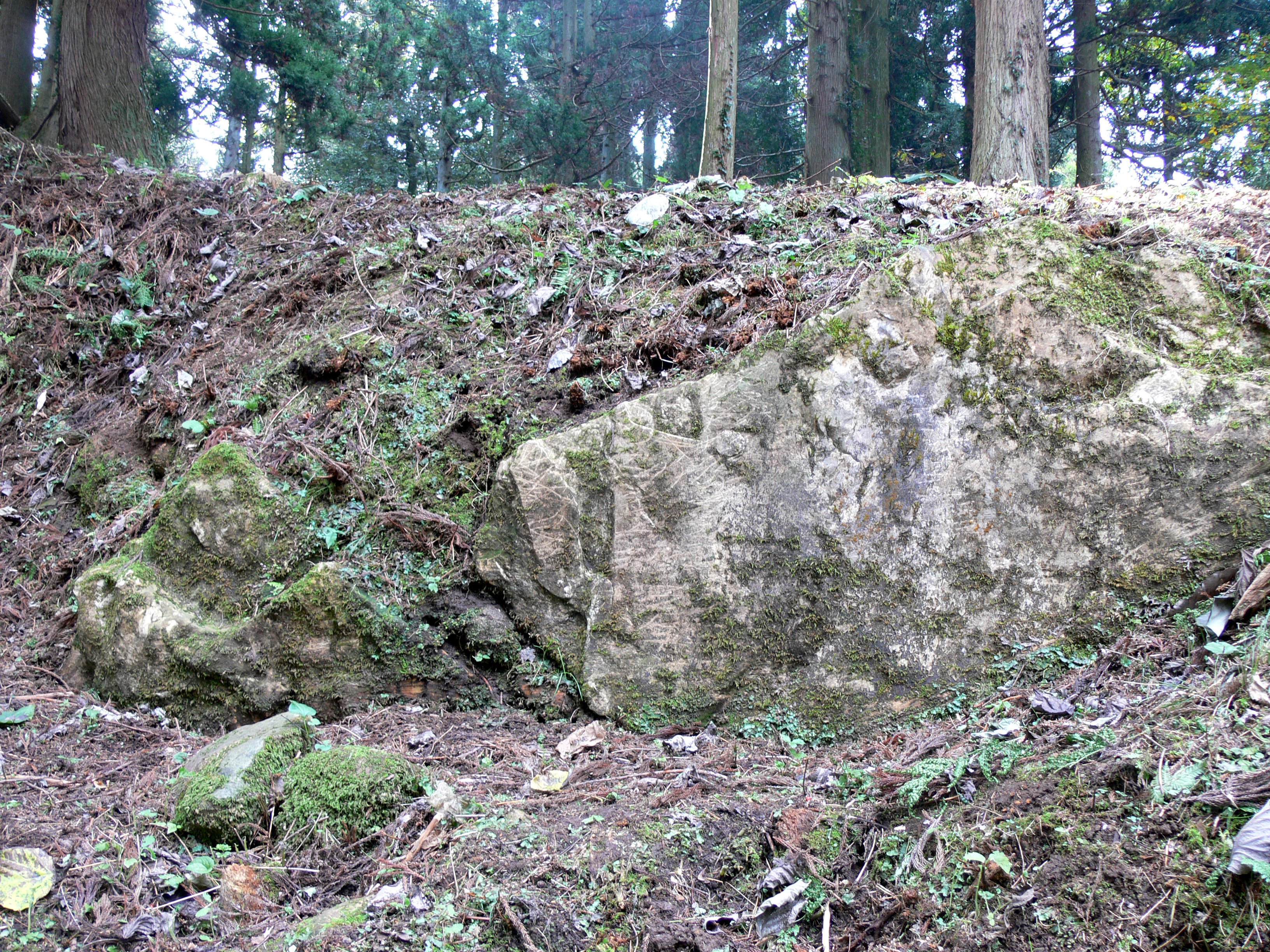 この手の城は土塁だけかと思っていたら二の丸への入口付近に石垣跡がありました。もっとも、どこが石垣なんだという気もします。と言うか、富山城のような石垣を想像してはいけないのであって、ごく小規模な石垣なのでした。