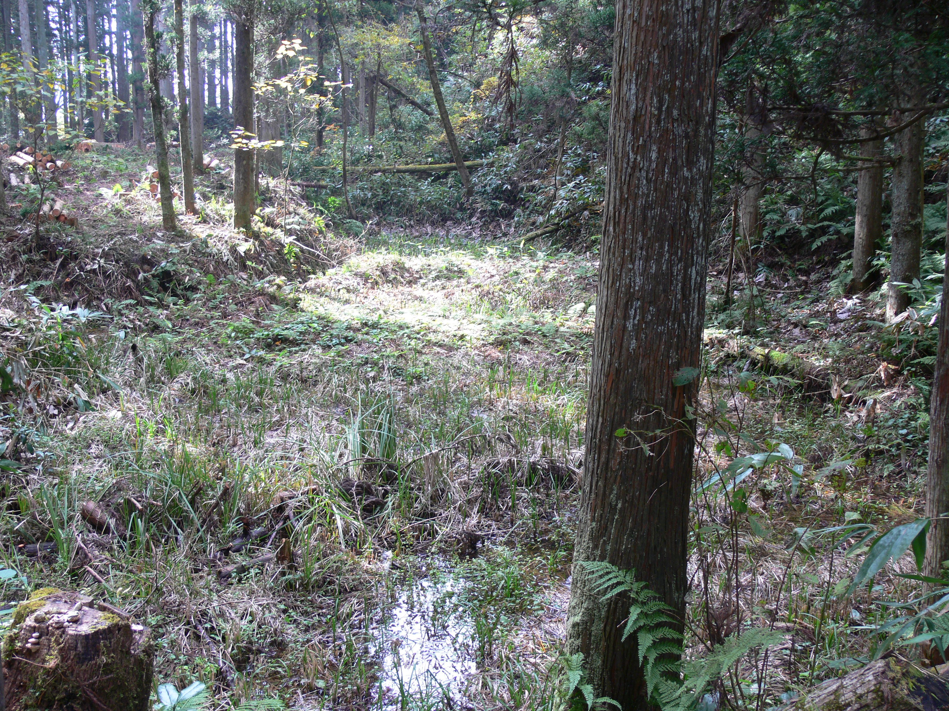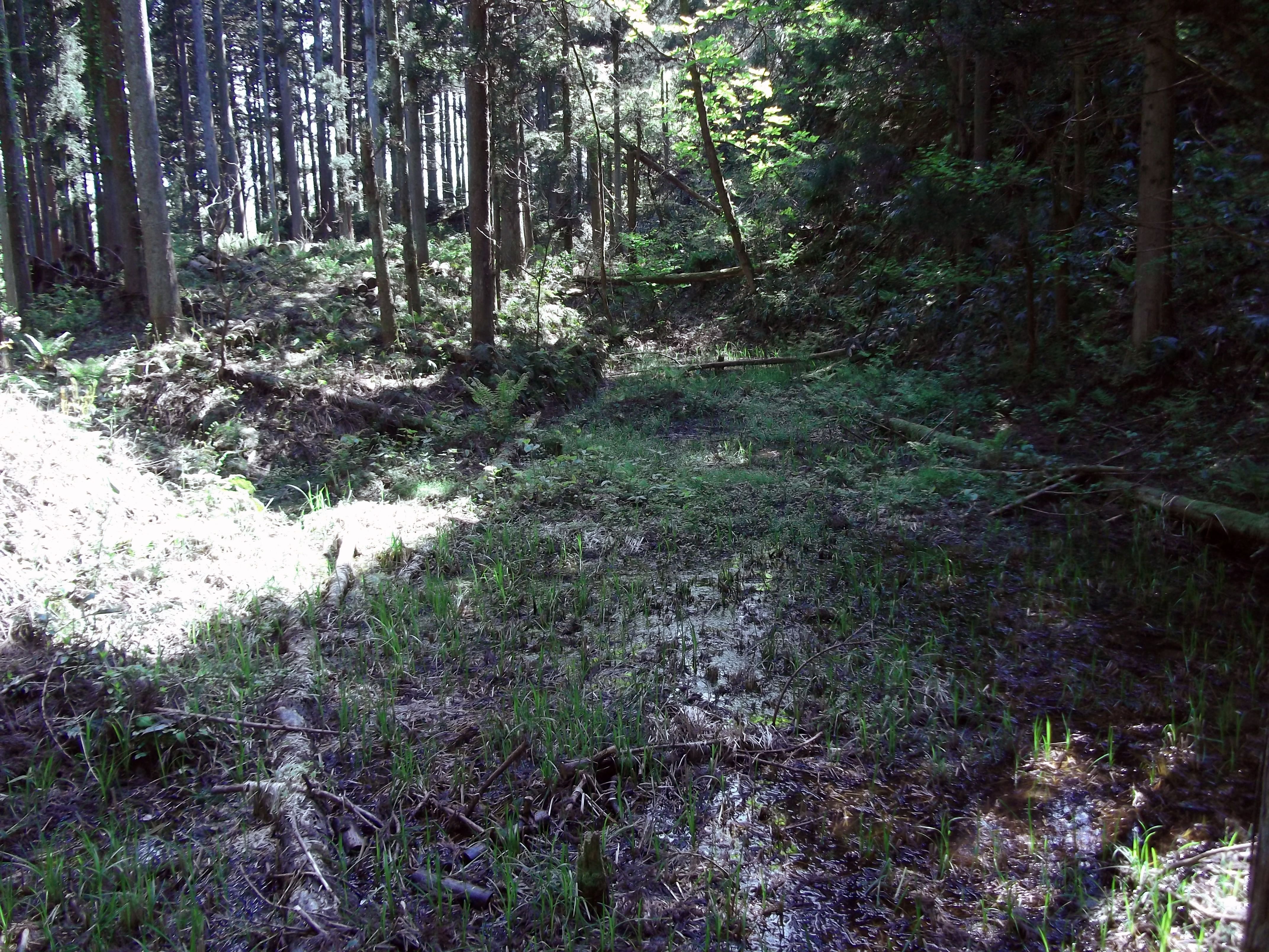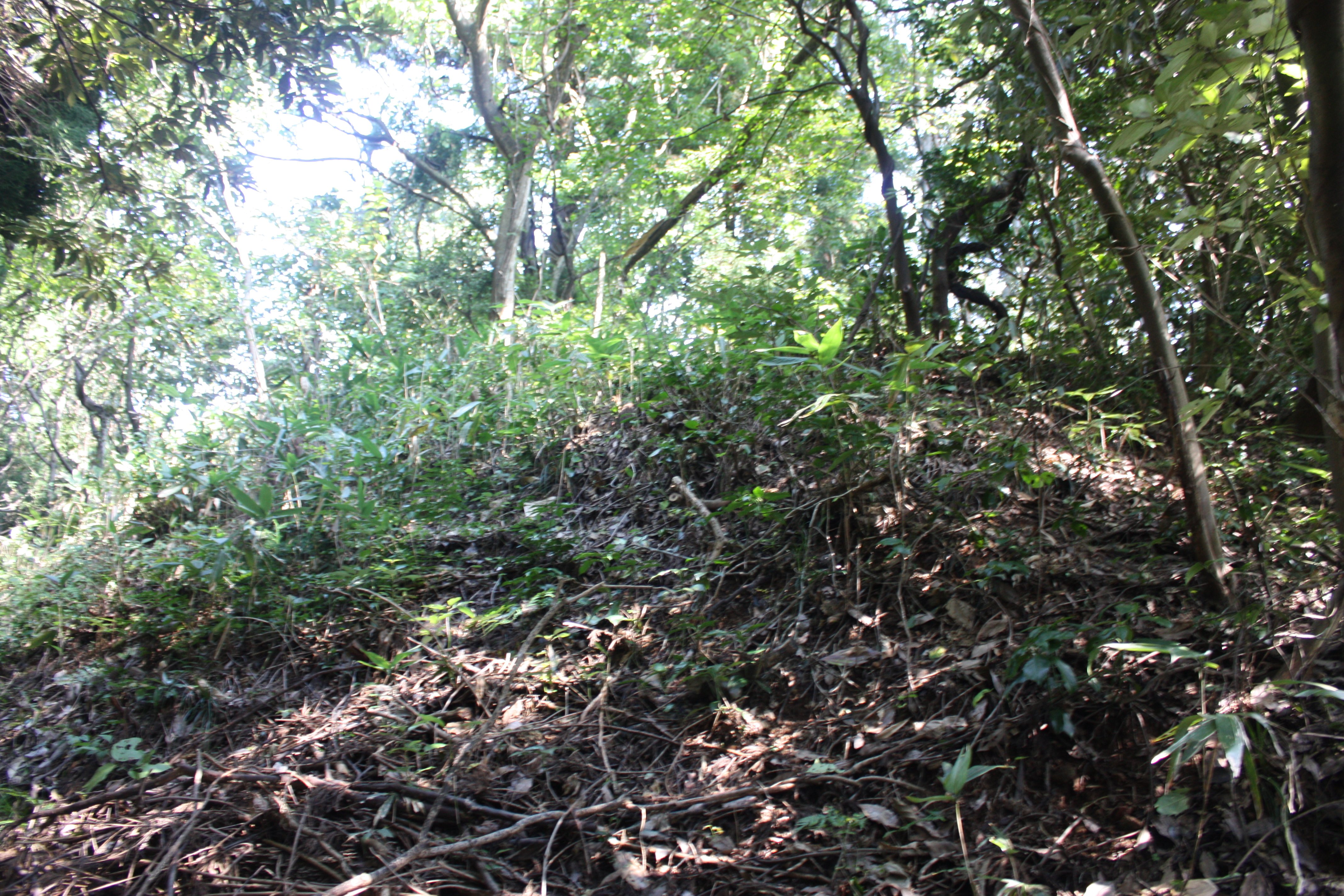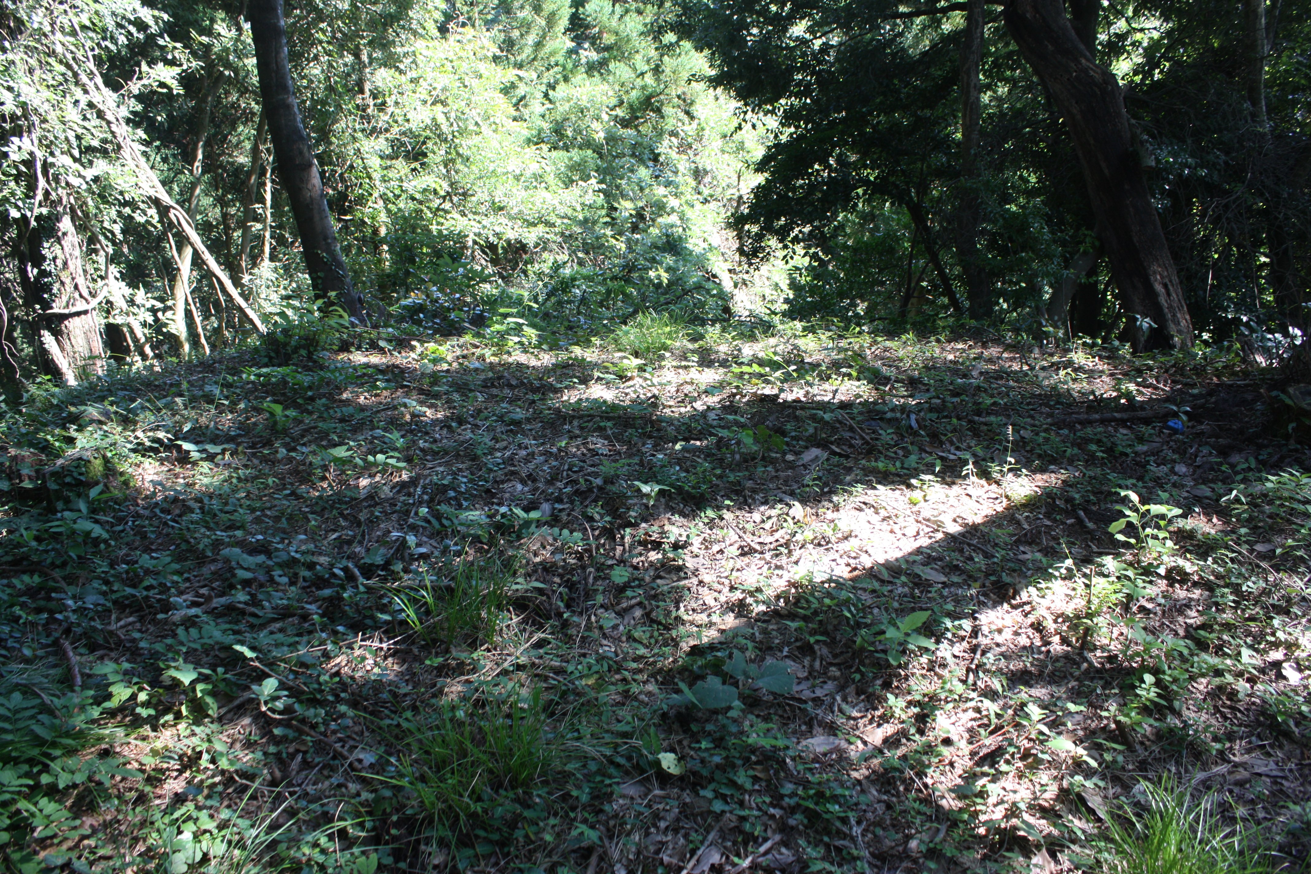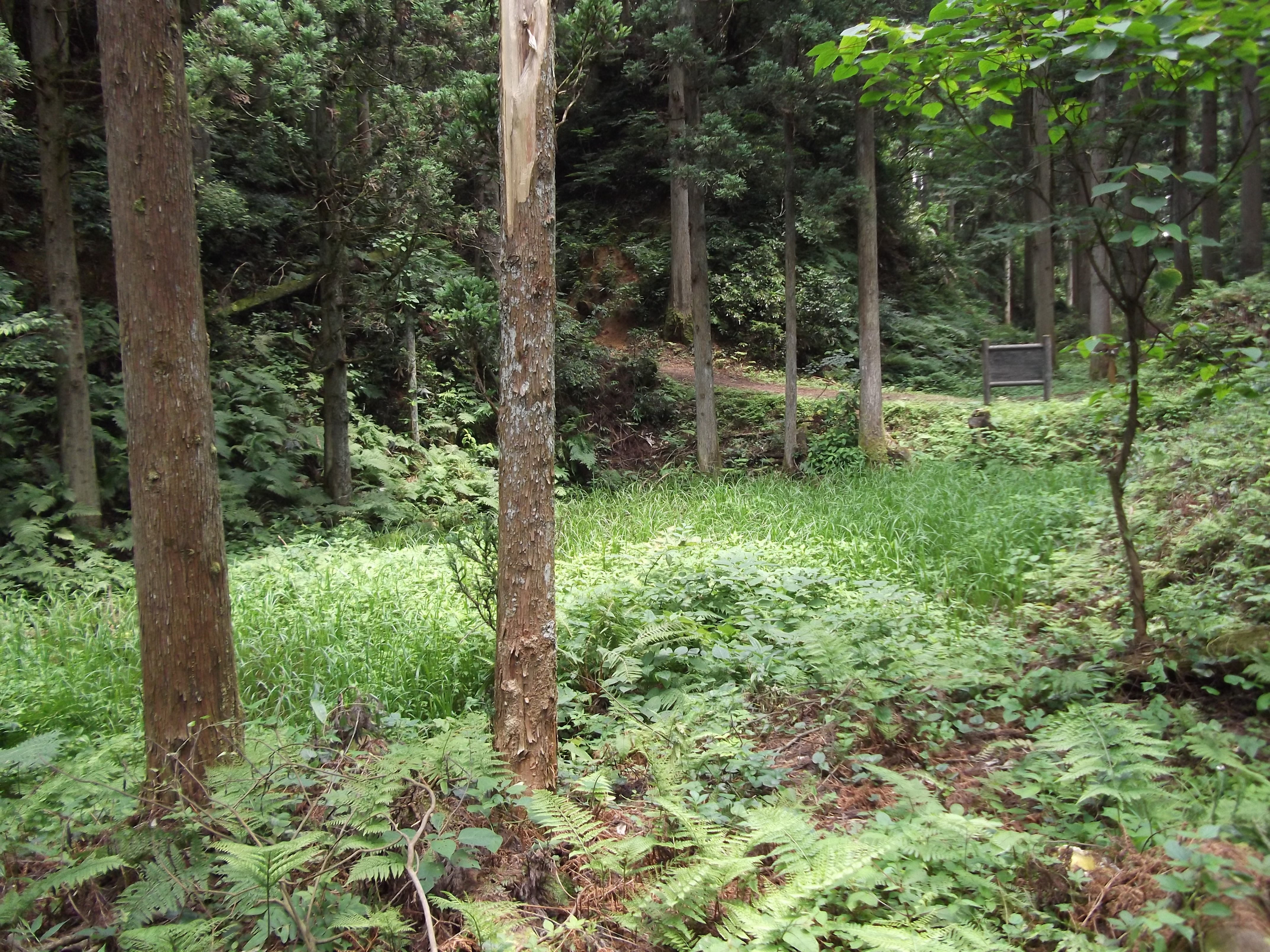 二の丸と三の丸の間には馬洗池があり、ここで城主の馬を洗ったと言われていますが、現在では水がほとんどないようです。現在では沼地という感じです。馬洗池のそばを通って南側にはK郭がありますが、こちらは完全にブッシュで入りにくいのです。安室屋敷と鐘楼堂の間の堀切を通ってしばらく行くと石垣跡があり、一の丸からのルートと合流してそのまま二の丸へ入れます。二の丸は増山城の曲輪の中では最も広く、他の曲輪に守られていて最も入りにくい曲輪と言えます。