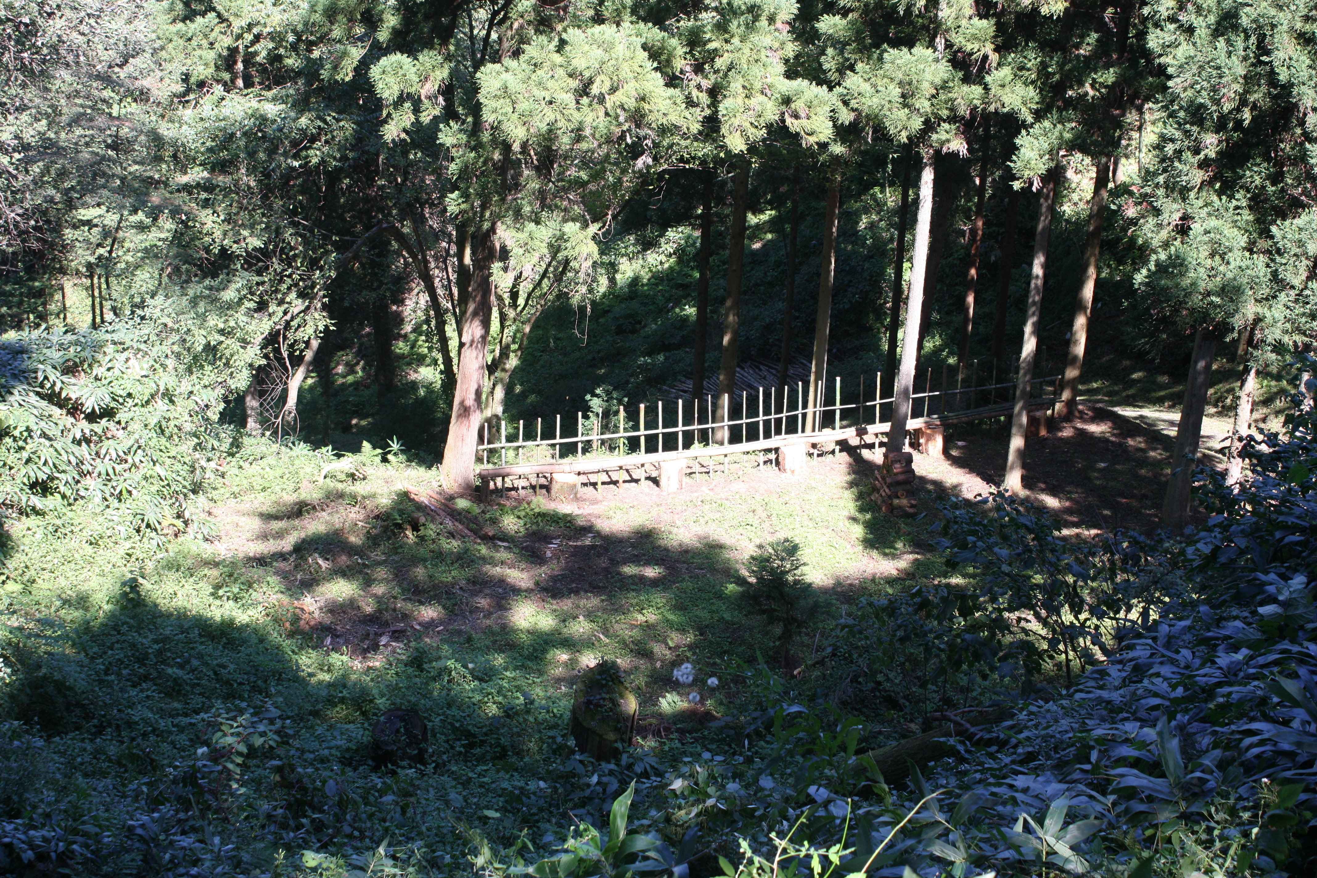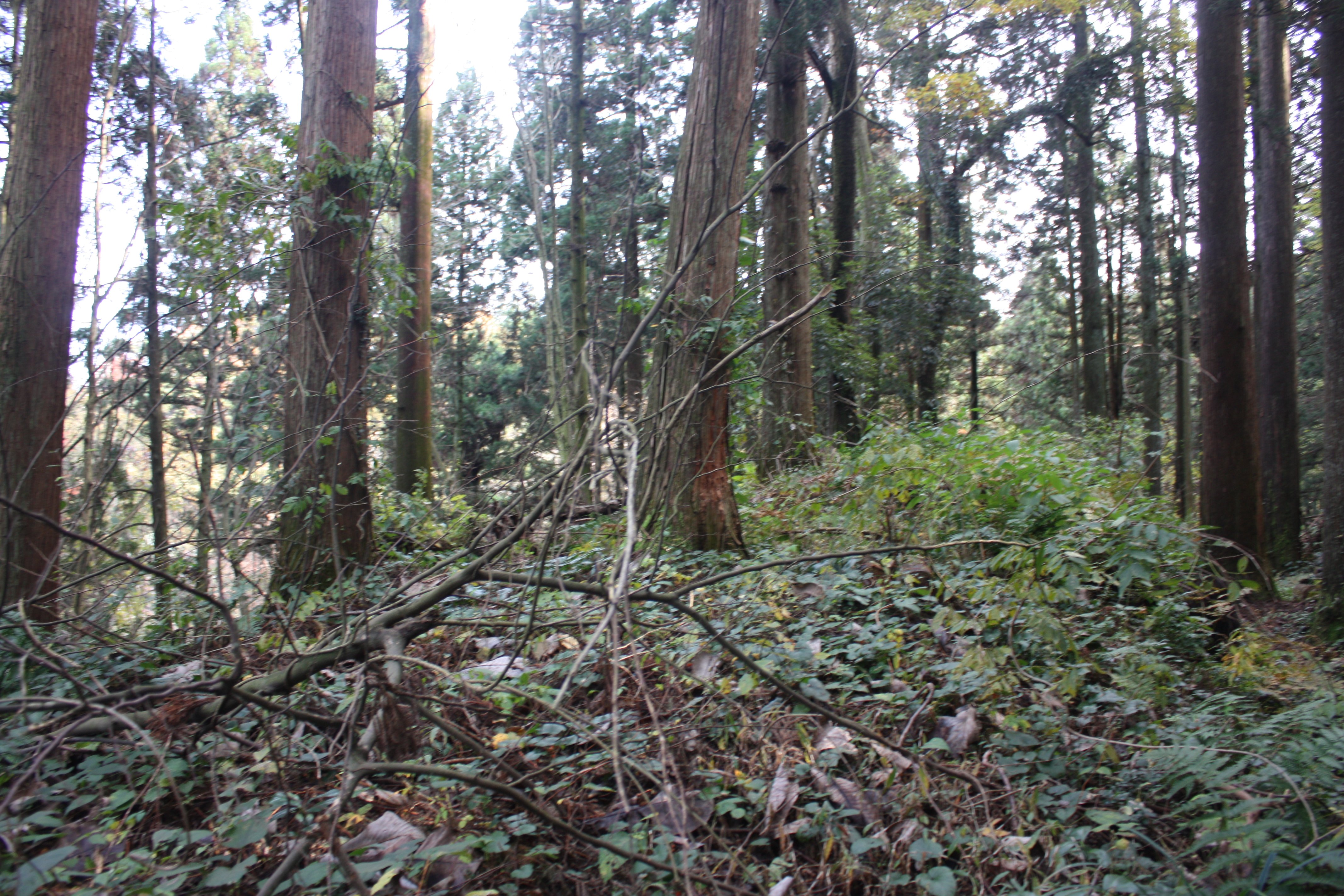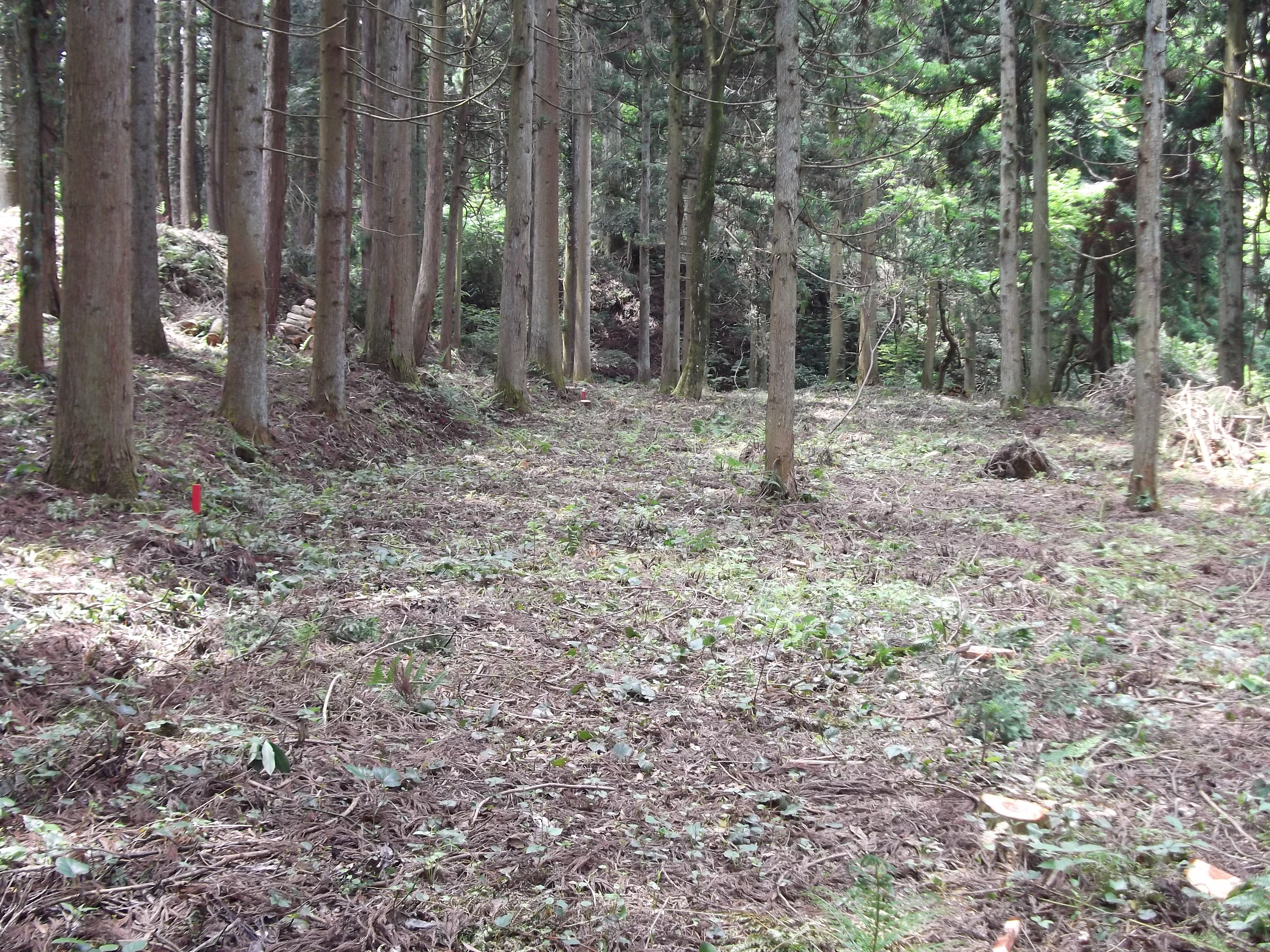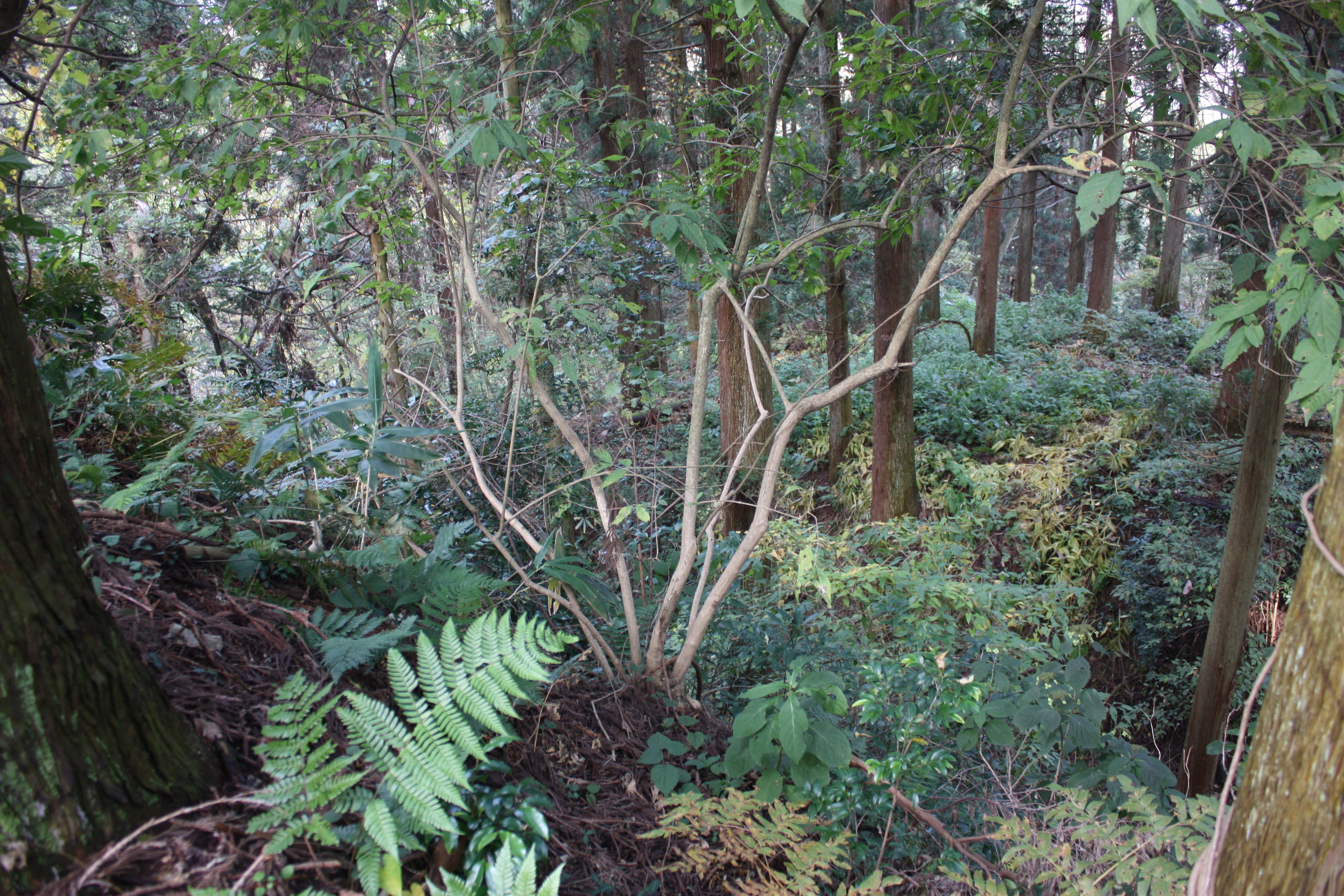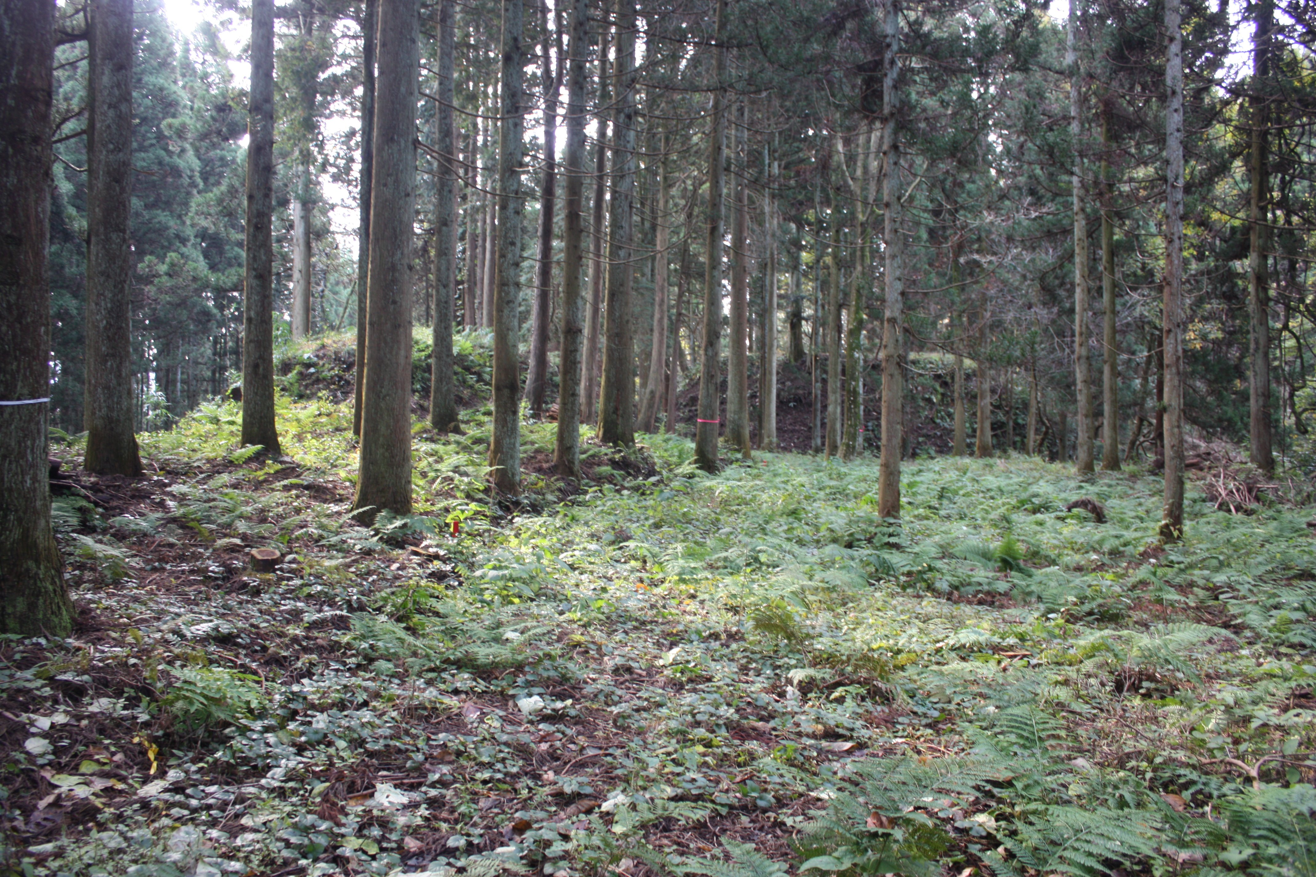二の丸と三の丸の間には馬洗池があり、ここで城主の馬を洗ったと言われていますが、現在では水がほとんどないようです。現在では沼地という感じです。馬洗池のそばを通って南側にはK郭がありますが、こちらは完全にブッシュで入りにくいのです。安室屋敷と鐘楼堂の間の堀切を通ってしばらく行くと石垣跡があり、一の丸からのルートと合流してそのまま二の丸へ入れます。二の丸は増山城の曲輪の中では最も広く、他の曲輪に守られていて最も入りにくい曲輪と言えます。