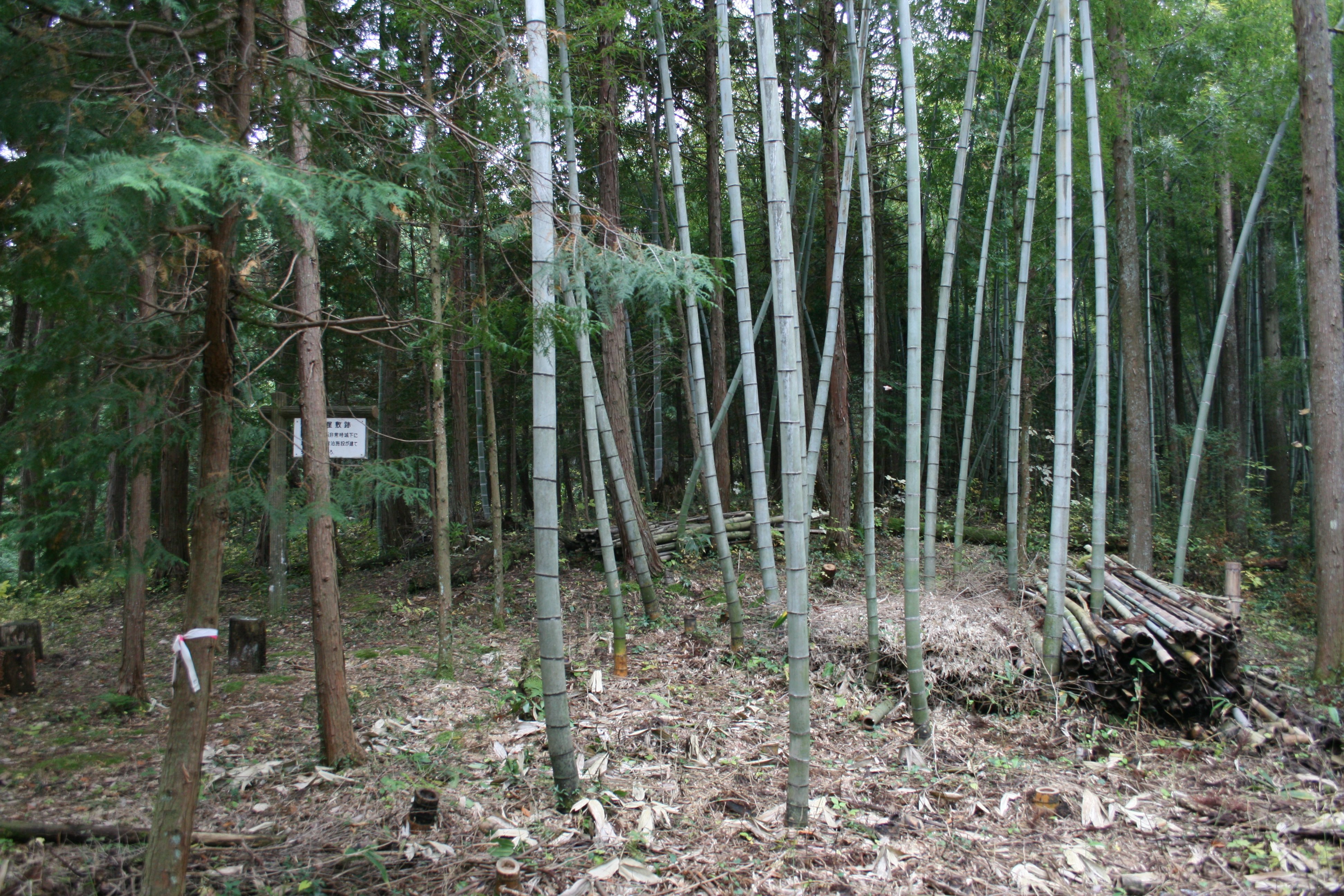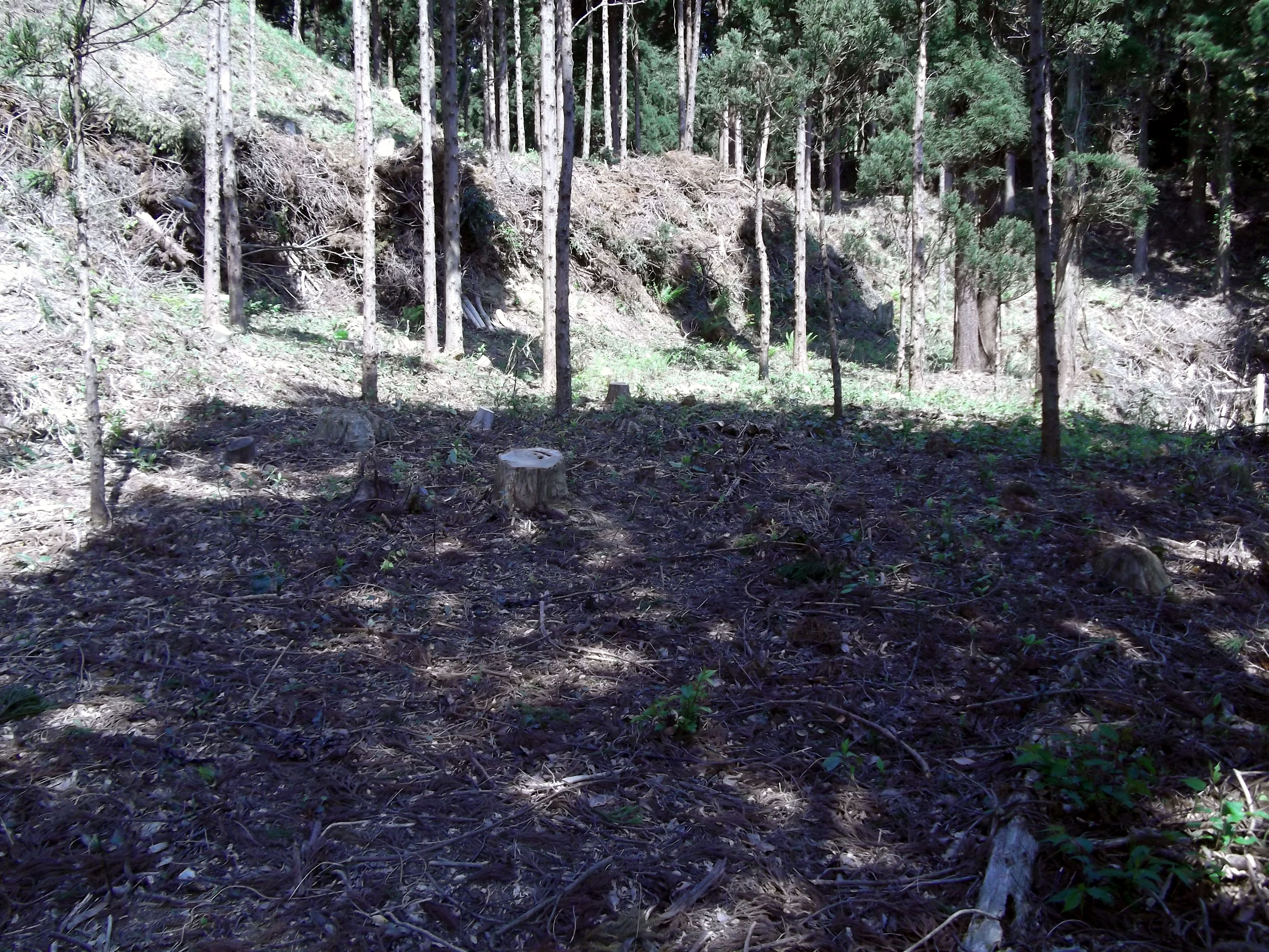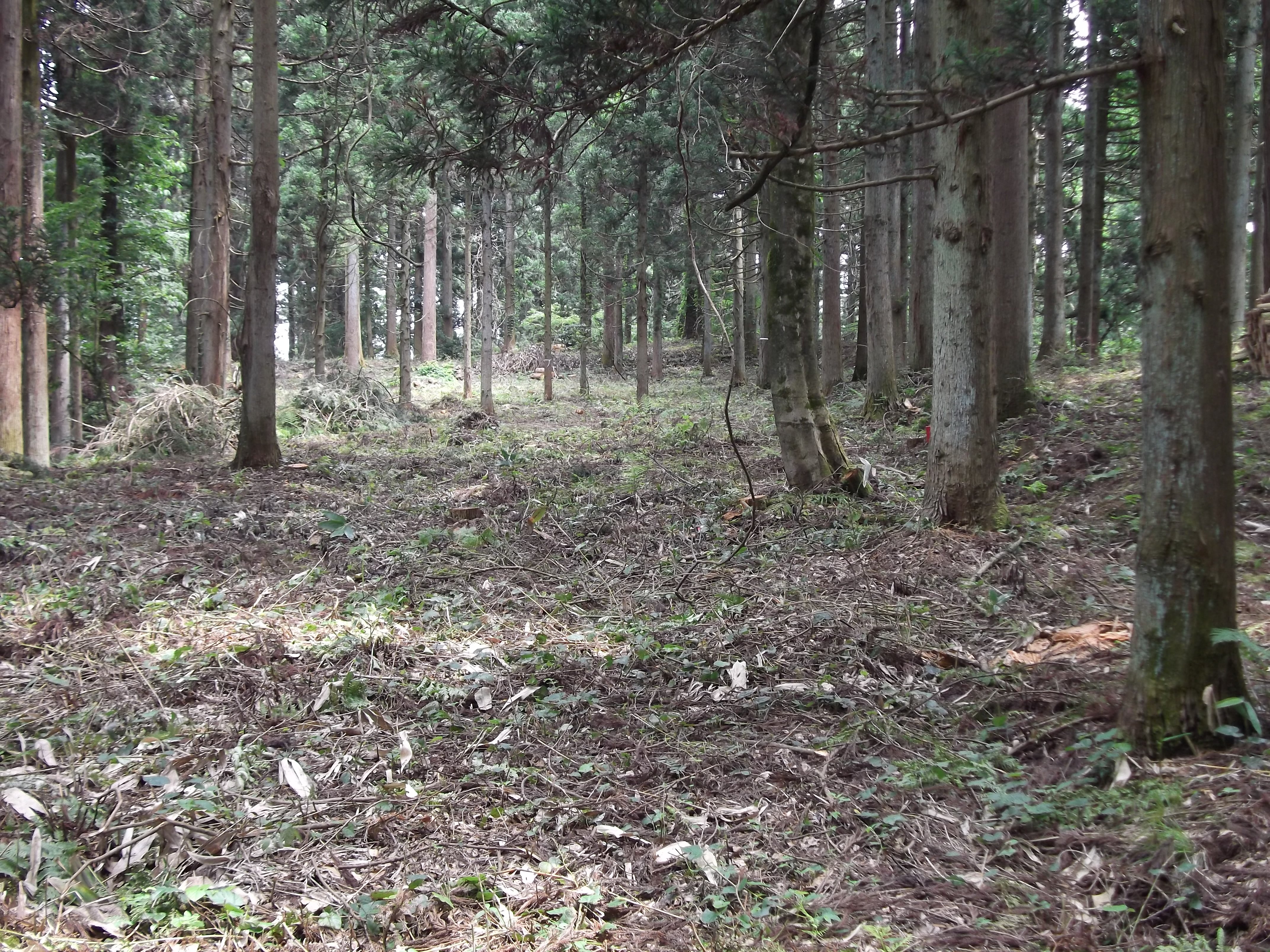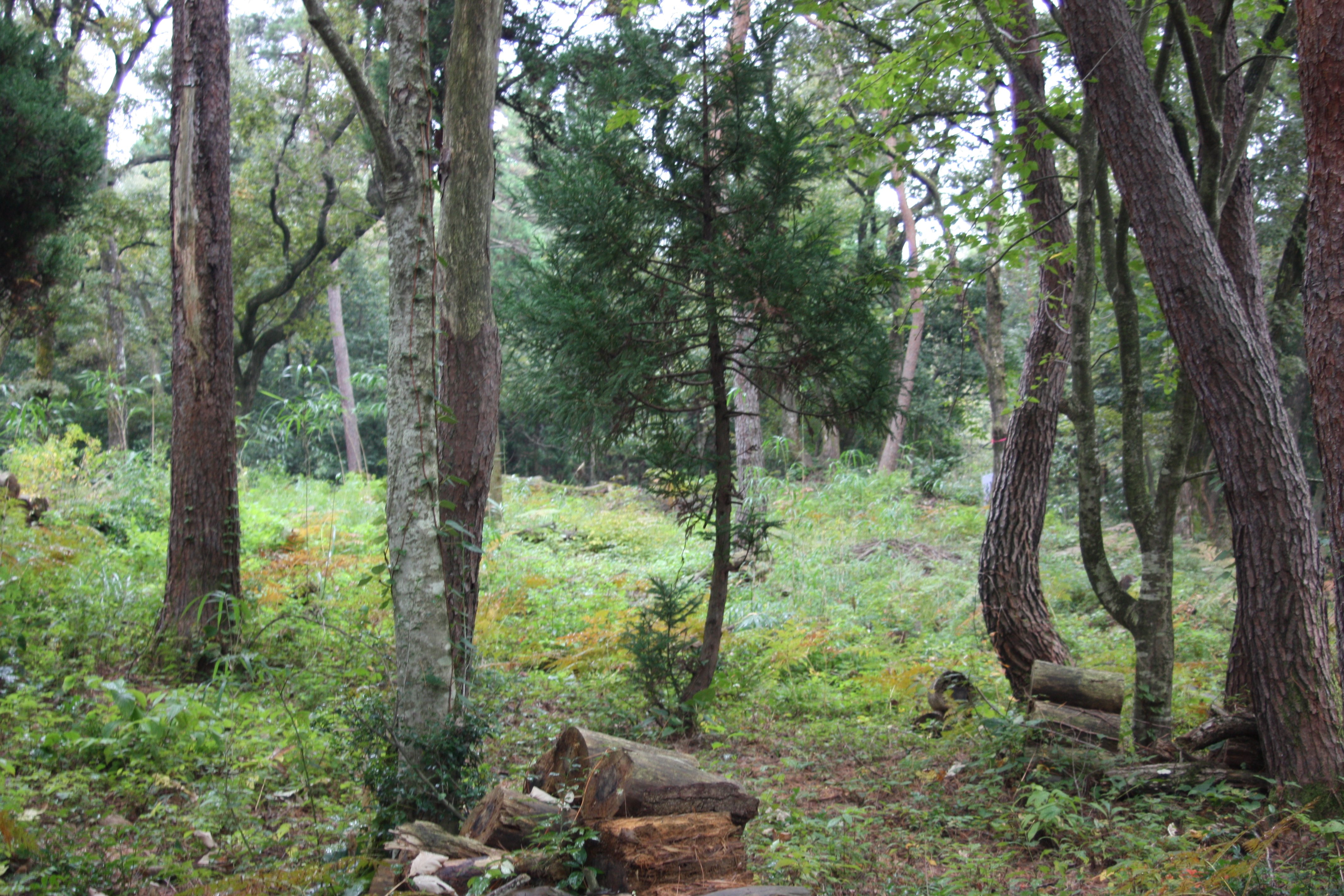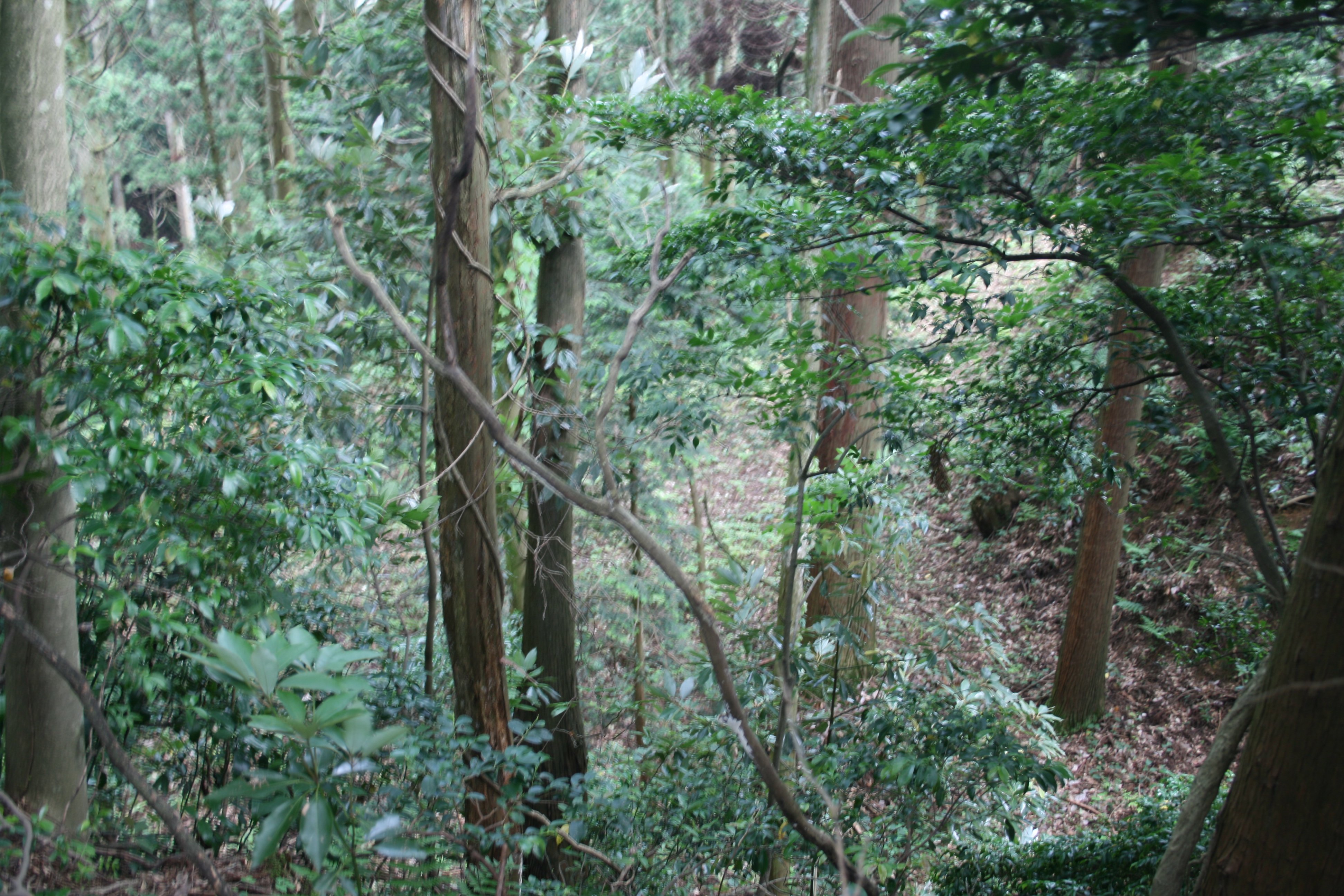 二の丸と三の丸の間には馬洗池があり、ここで城主の馬を洗ったと言われていますが、現在では水がほとんどないようです。現在では沼地という感じです。馬洗池のそばを通って南側にはK郭がありますが、こちらは完全にブッシュで入りにくいのです。安室屋敷と鐘楼堂の間の堀切を通ってしばらく行くと石垣跡があり、一の丸からのルートと合流してそのまま二の丸へ入れます。二の丸は増山城の曲輪の中では最も広く、他の曲輪に守られていて最も入りにくい曲輪と言えます。
