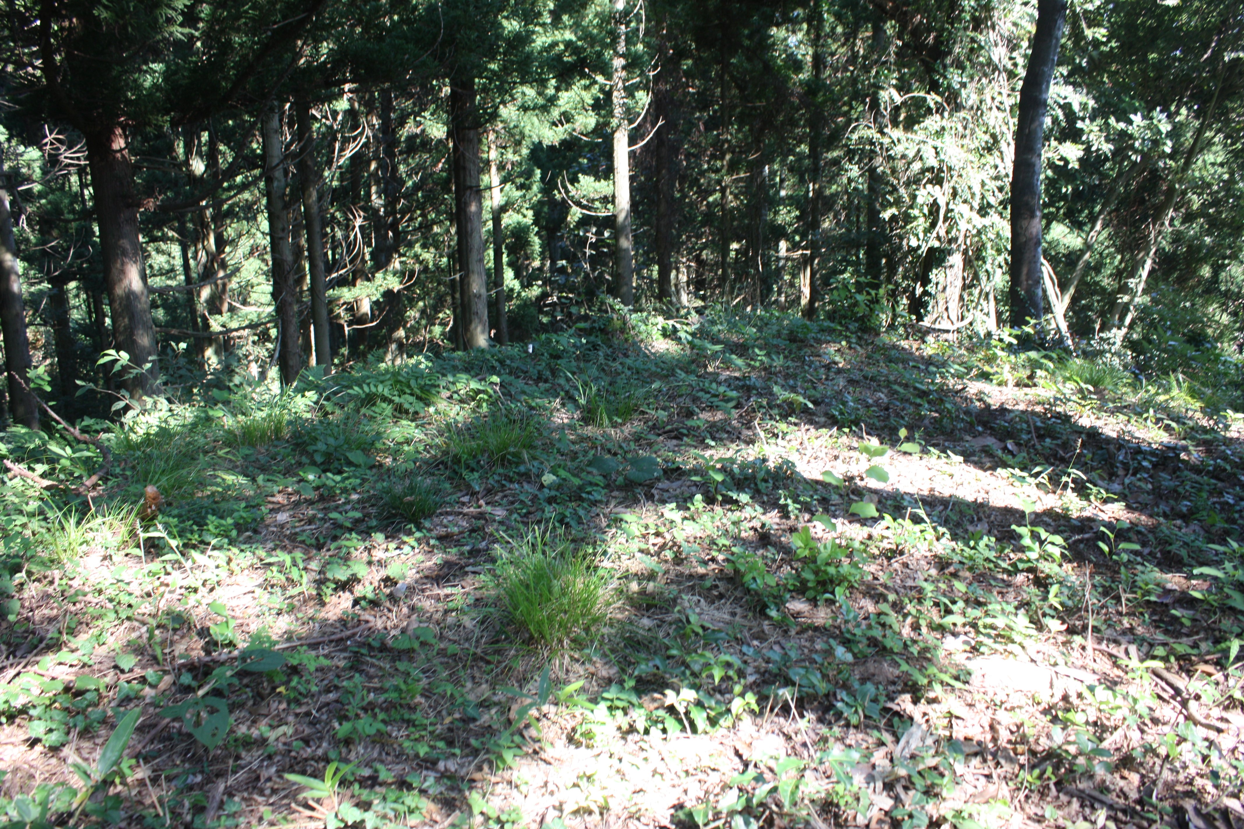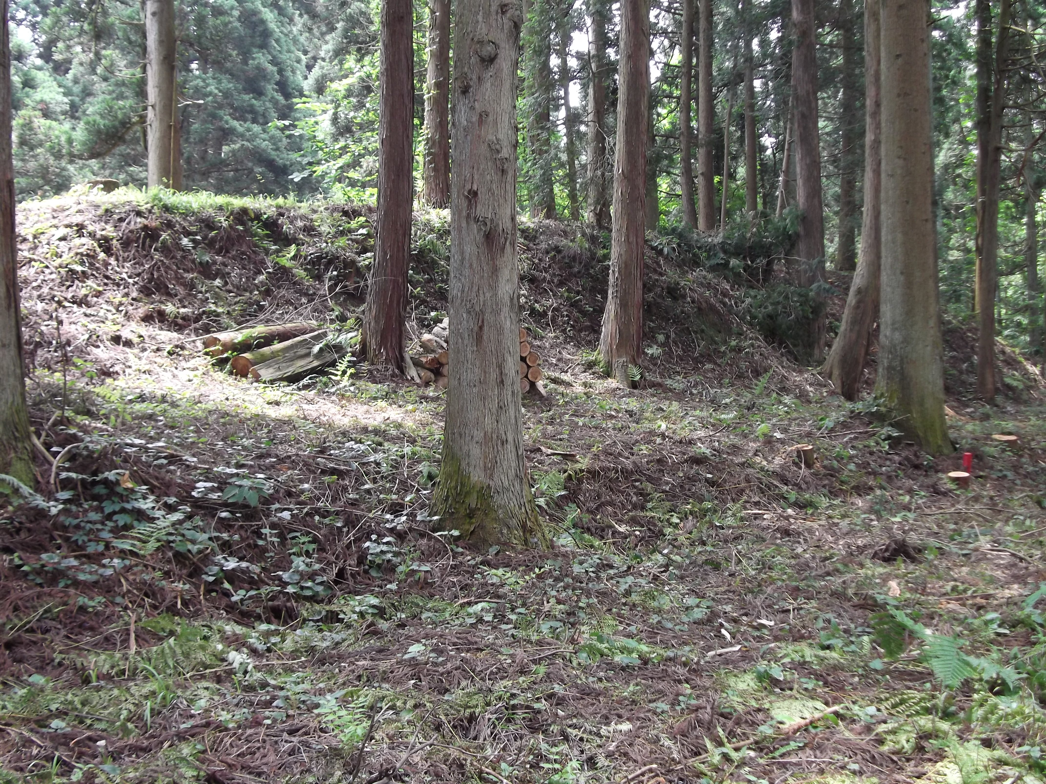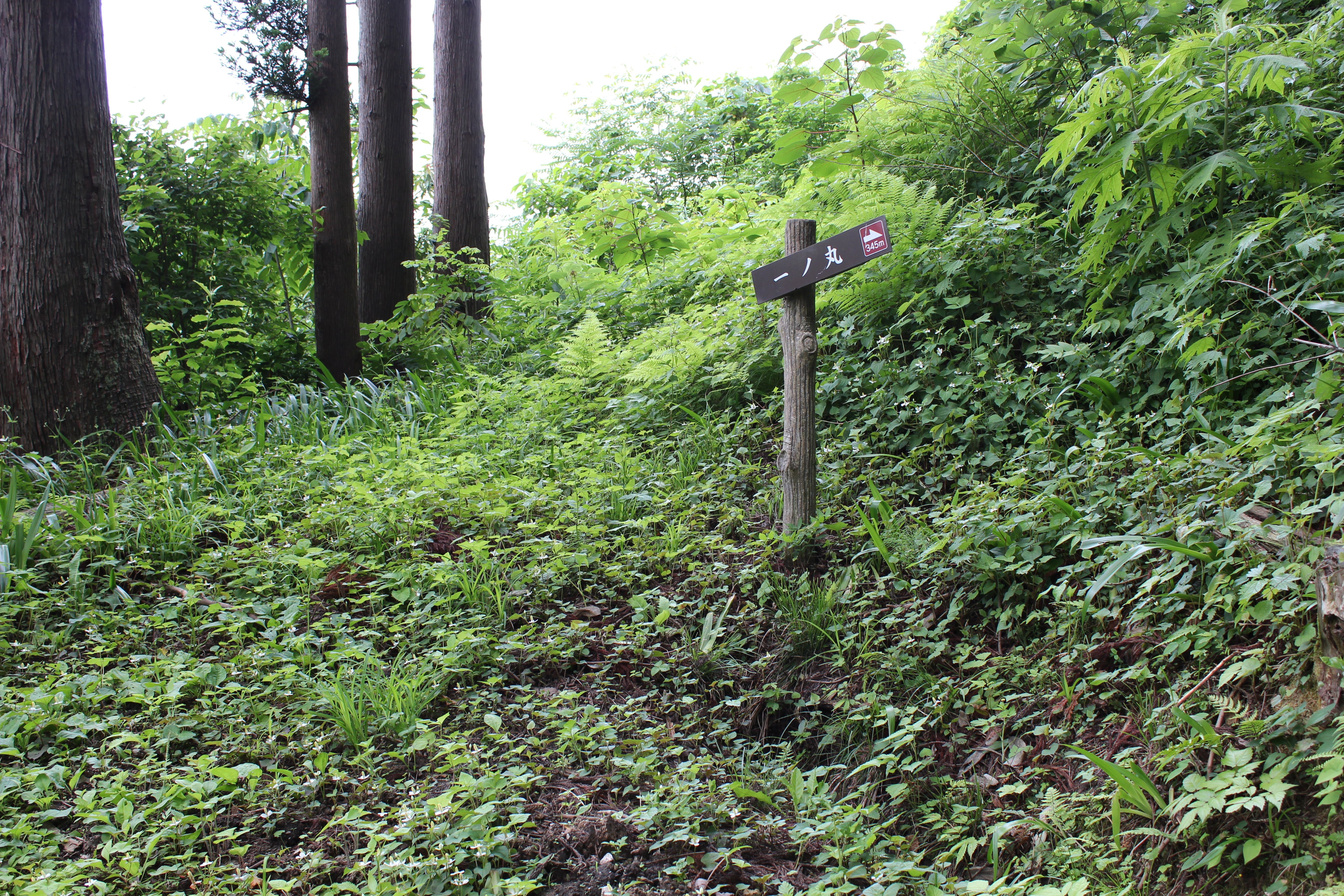 一の丸は、二の丸の西側にあり、二の丸を守るための曲輪と思われますが、曲輪の西側の切岸は絶壁で高く、見所の一つです。また南側には竪堀が残っていますし、二の丸へのルートには虎口があります。南側にはヘッタリと呼ばれる腰曲輪がありますが、ここはブッシュとなっています。このあたりでもニホンカモシカを目撃したことがあるので、もし見かけたら写真に撮っておきましょう。