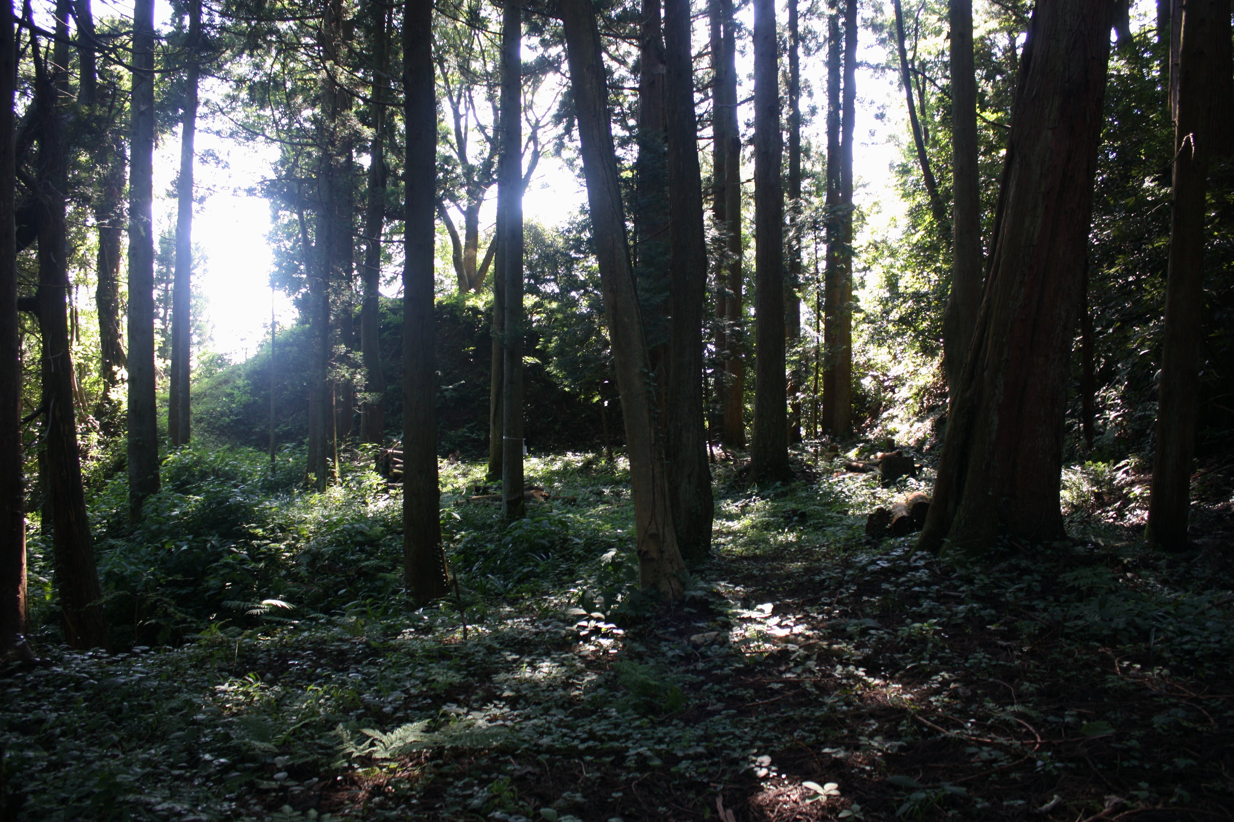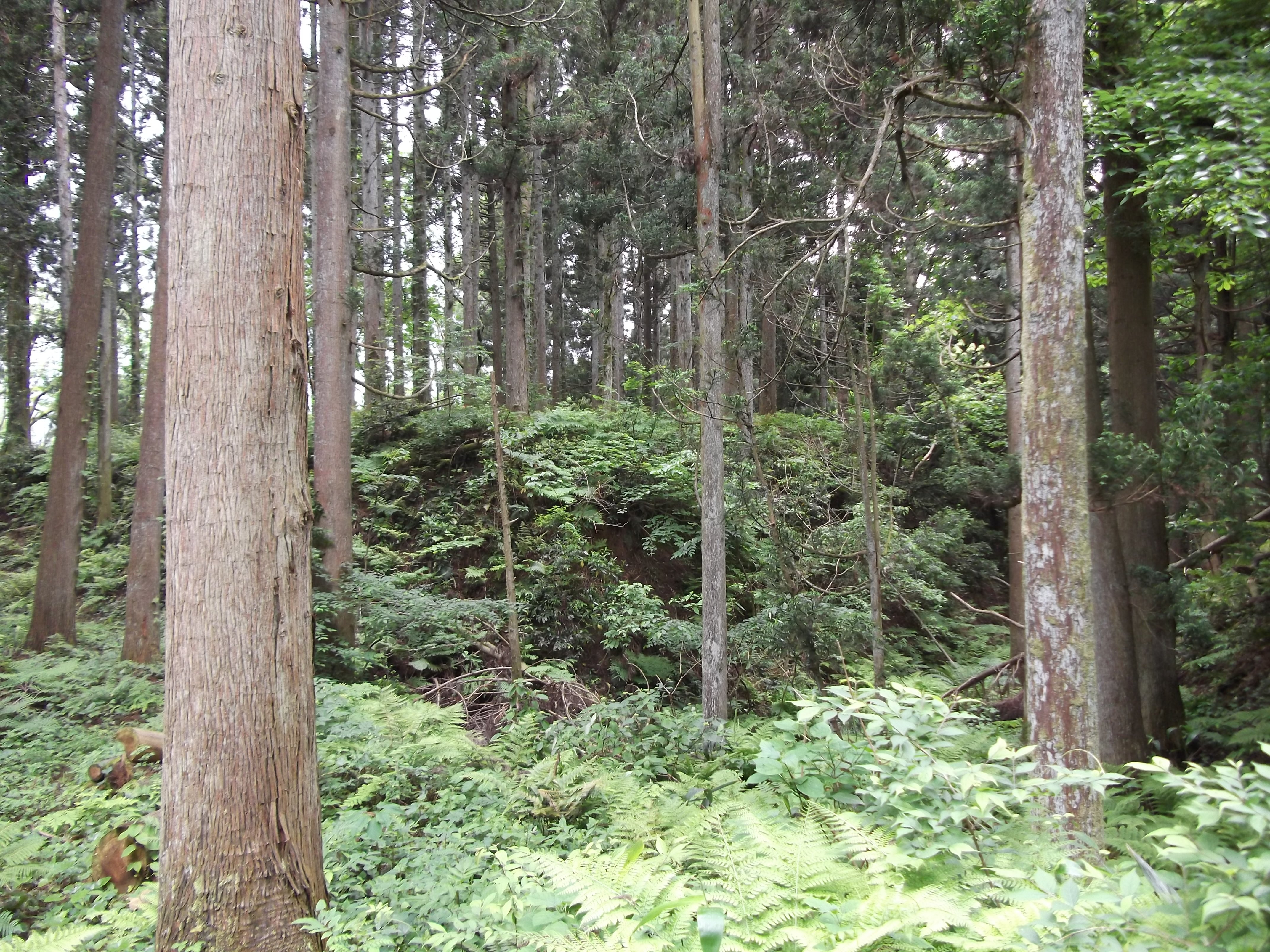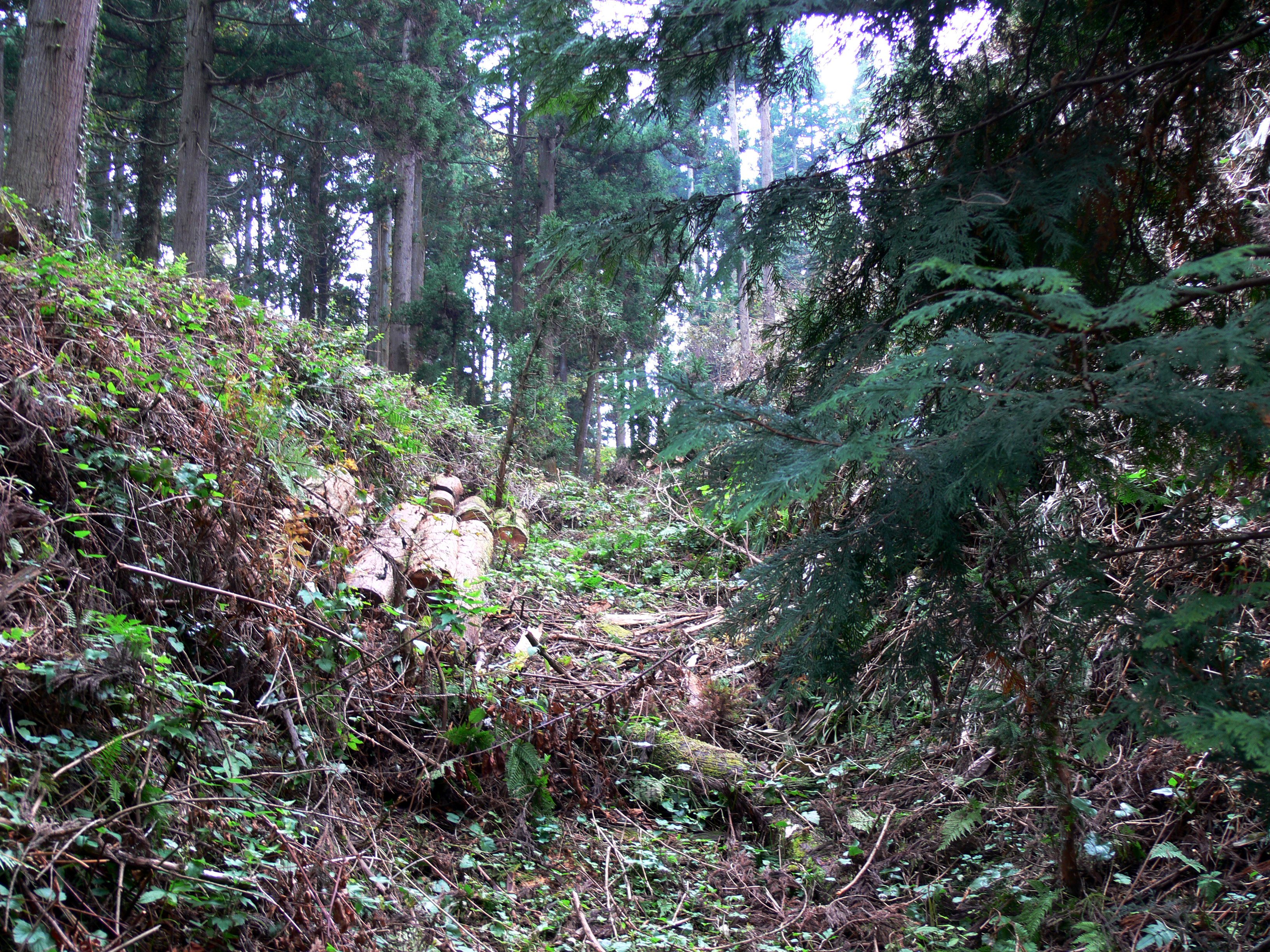 一の丸は、二の丸の西側にあり、二の丸を守るための曲輪と思われますが、曲輪の西側の切岸は絶壁で高く、見所の一つです。また南側には竪堀が残っていますし、二の丸へのルートには虎口があります。南側にはヘッタリと呼ばれる腰曲輪がありますが、ここはブッシュとなっています。このあたりでもニホンカモシカを目撃したことがあるので、もし見かけたら写真に撮っておきましょう。