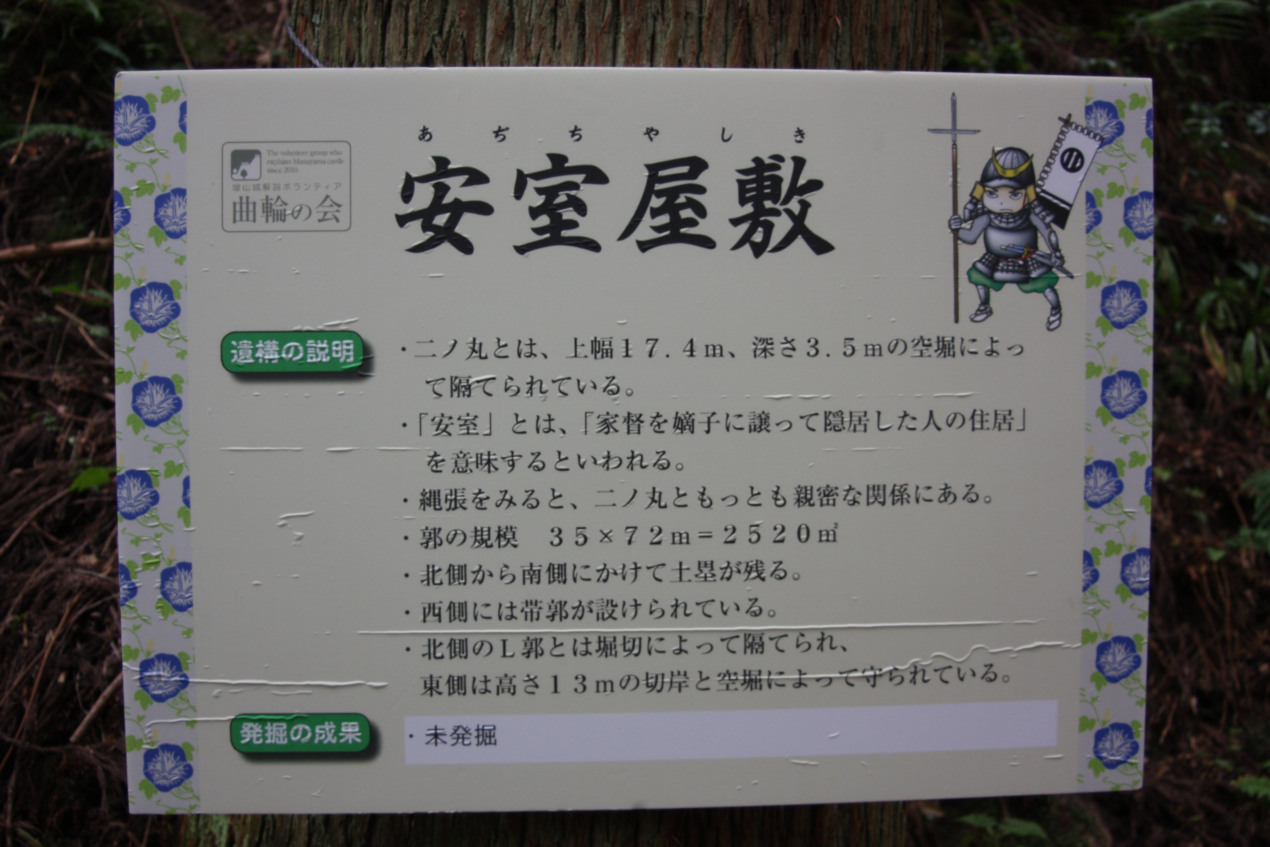 なぜか三の丸への入口に案内板がないのですが、三の丸はたいへん分かりにくい位置にあるので、これは設置しておかないといけないでしょう。安室屋敷にもありませんが、ここは梯子があるので、まだ許せます。