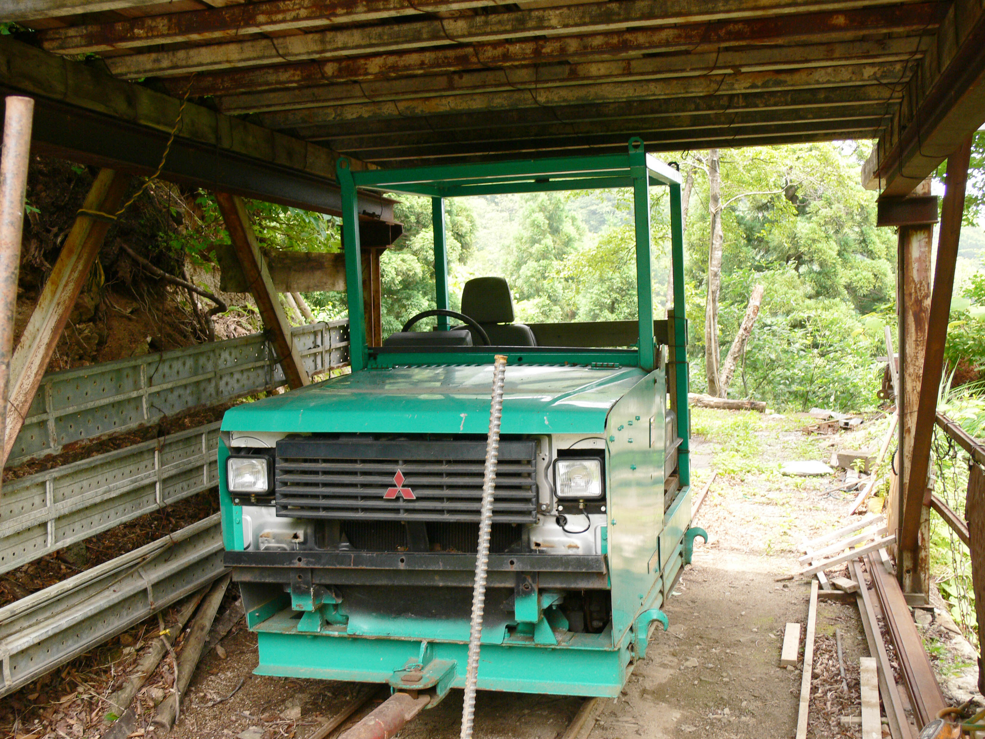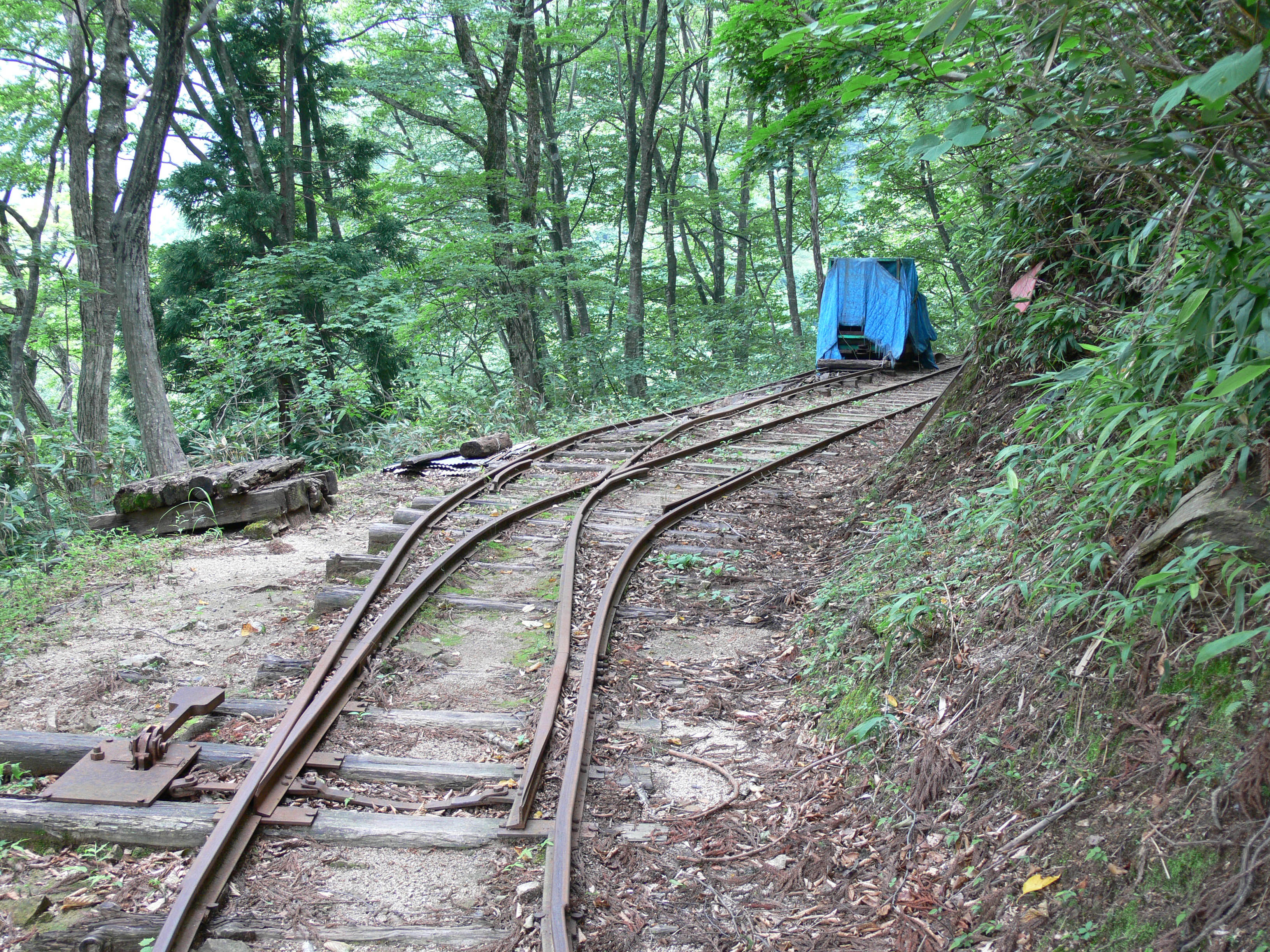 しかし不思議なことに道路の途中から軌道があるのですが、ではそこまでは物資をどうやって運んでいるのでしょうか。たぶんあの狭い道を軽トラックで運んでいるのでしょう。それなら発電所とダムがある地点まで軽トラックで運べばよいと思うのですが、そこはトラックで運ぶには狭い上に崩れやすいので、このように軌道を利用しているのだと思われます。