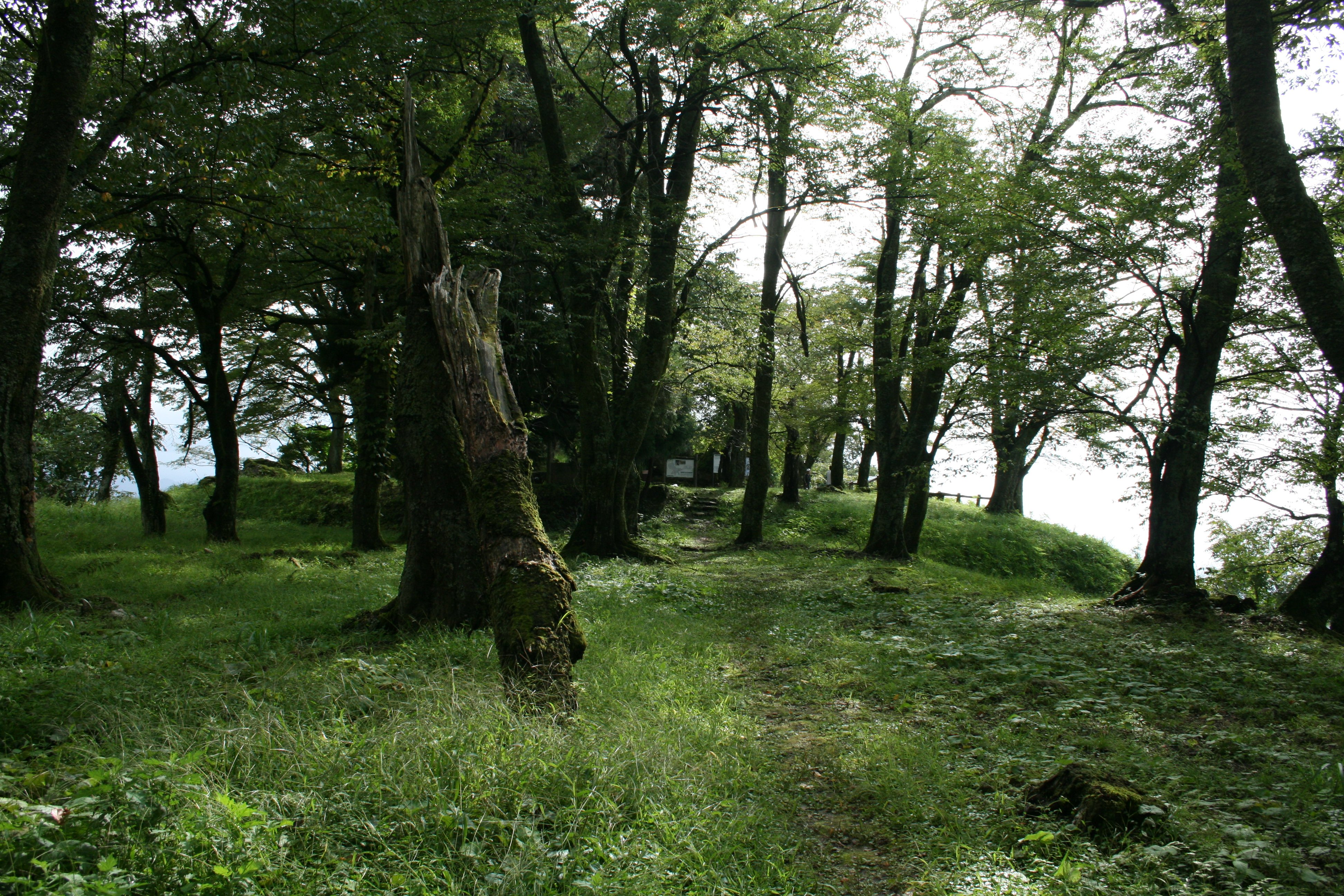 三方は断崖となっていて、山頂には空堀で区切られた五つの曲輪が南北に並んでいてその長さは1kmにも及び、越中最大規模の山城です。