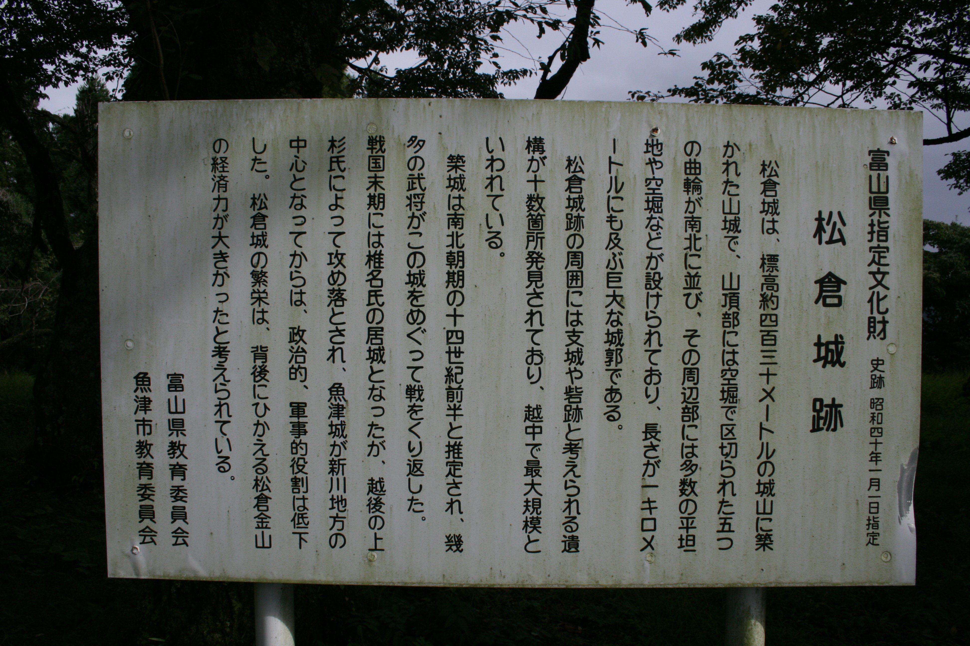 南北朝期には椎名氏始祖の椎名孫八が松倉城に入城したとされます。椎名氏は、後に越中守護として赴任した畠山氏に仕え、新川郡守護代に任命されています。